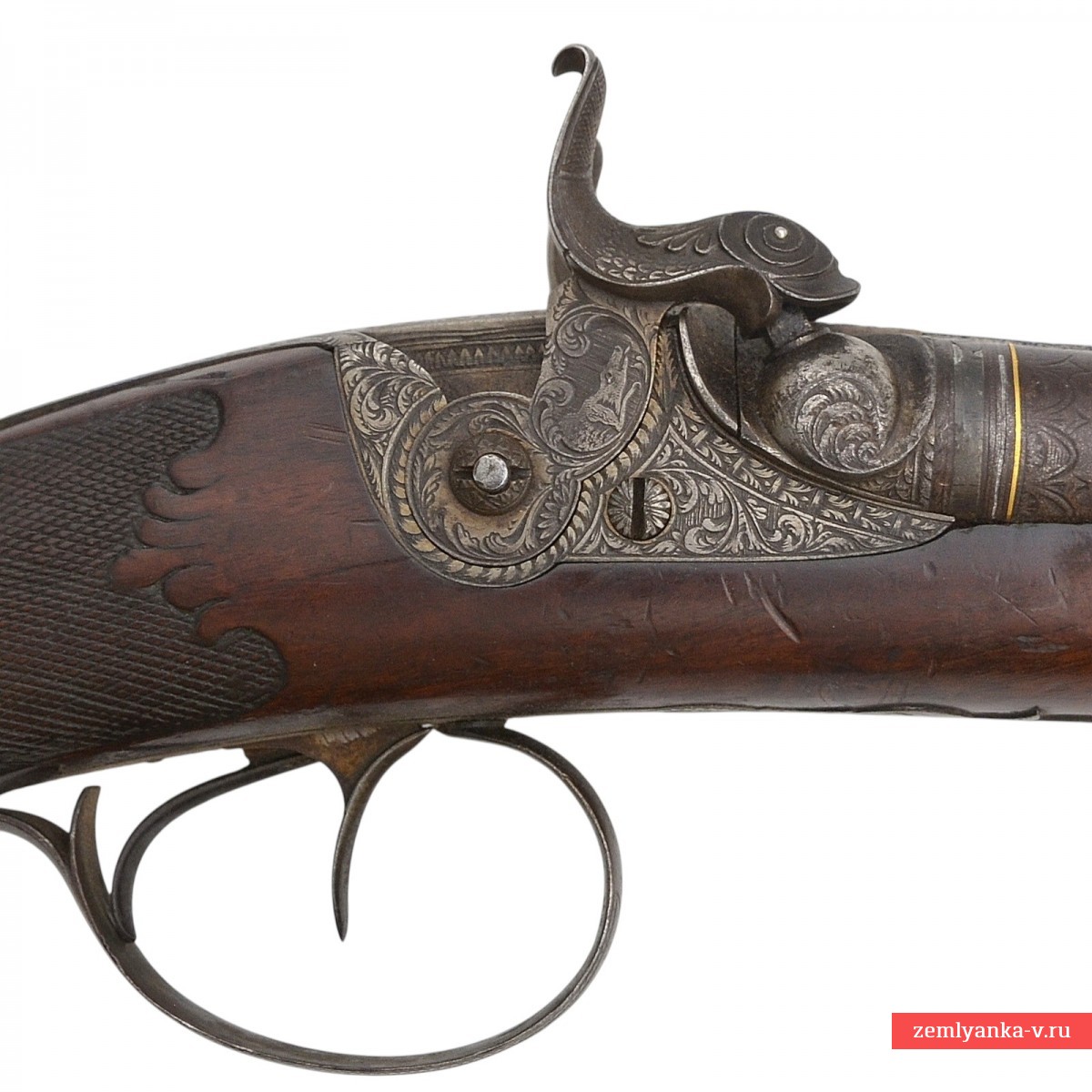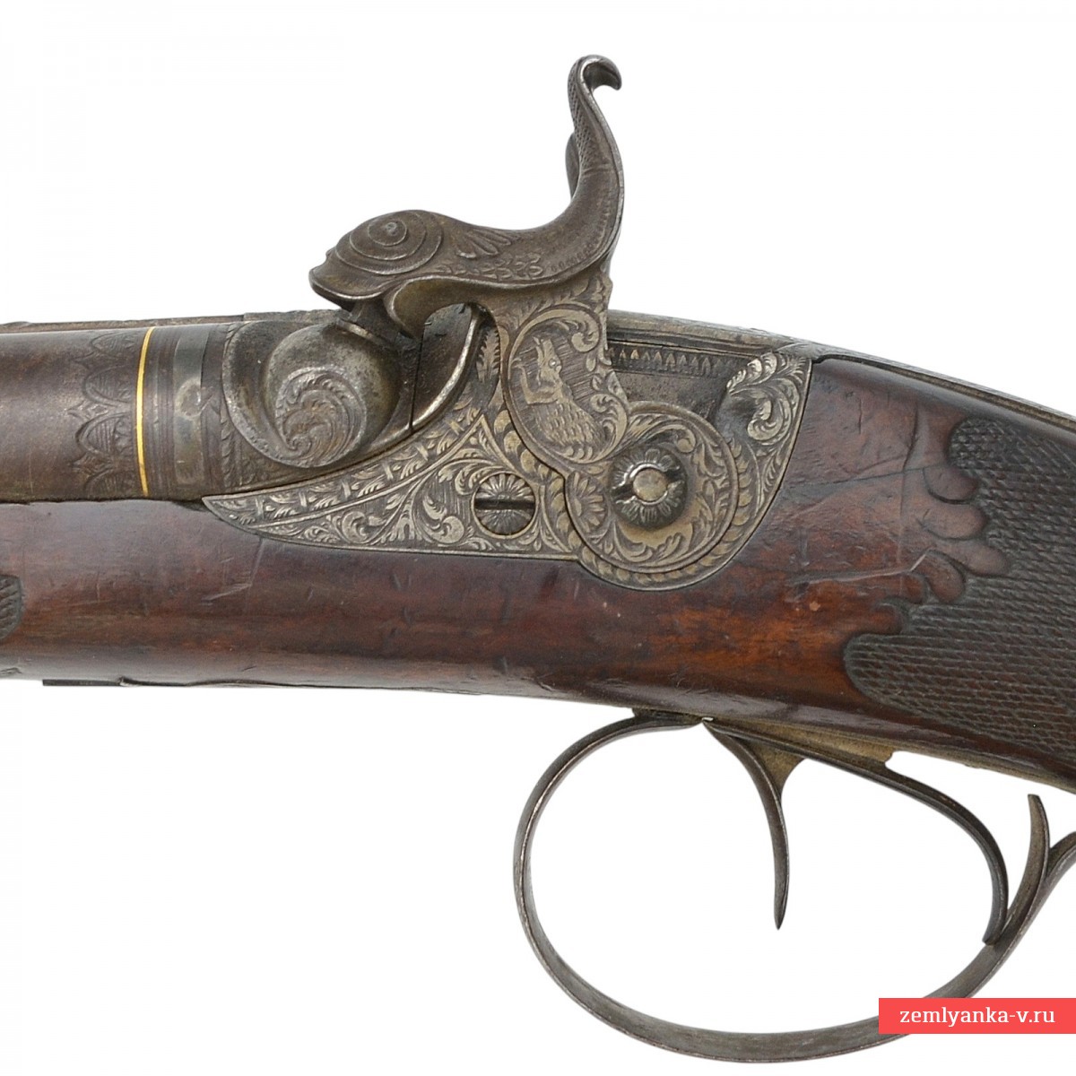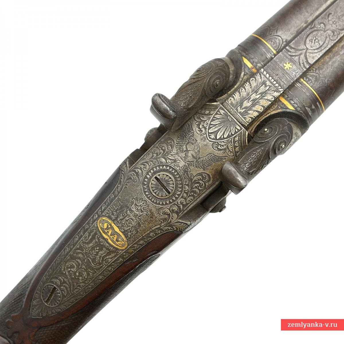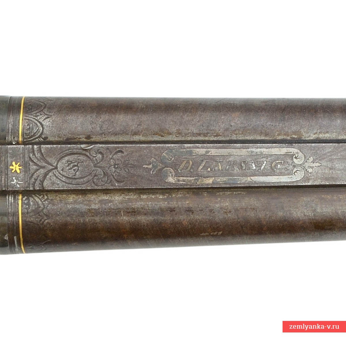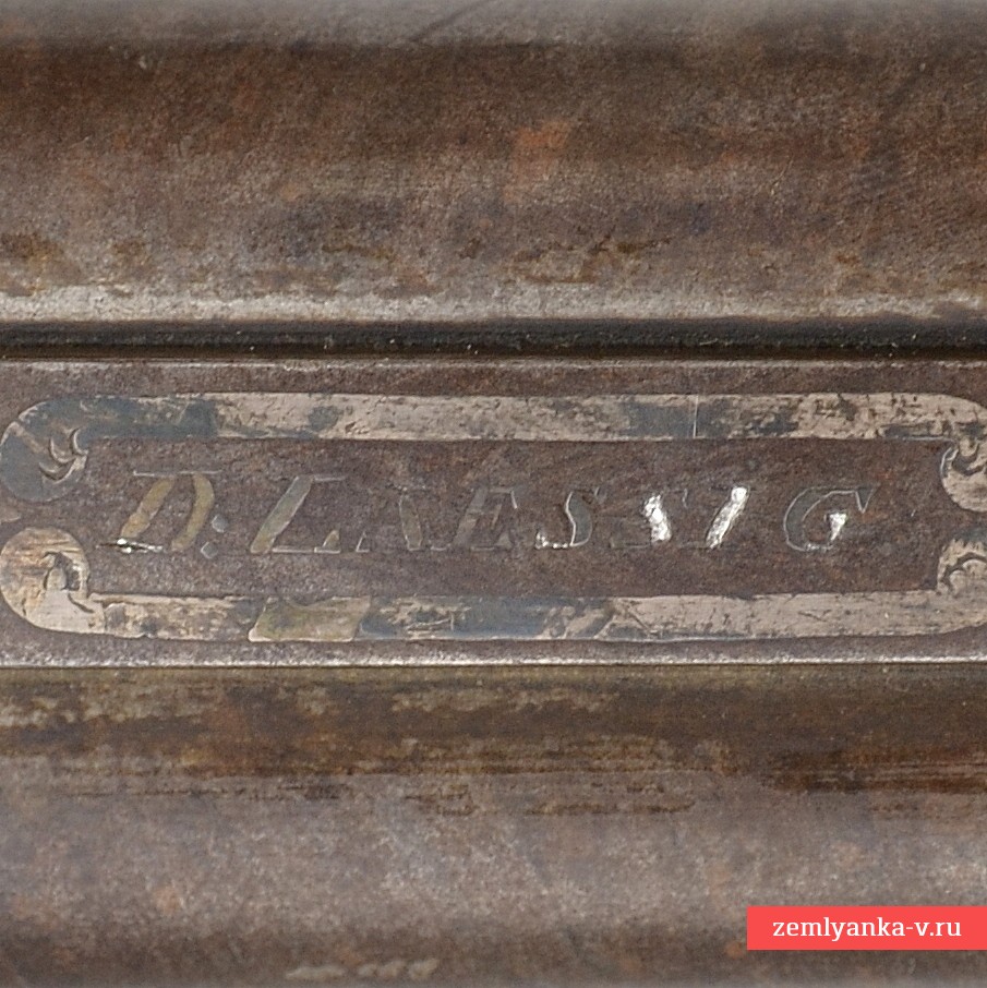Оригинальное ружье середины XIX века в прекрасном состоянии и замечательной работе мастера. Ружье имеет 2 круглых ствола, изготовленных из красивого полосного дамаска. Каналы гладкие. Прицельные приспособления состоят из маленькой мушки. На планке между стволами таушировкой серебром нанесена надпись «D. Laessig» (клеймо чешского мастера, работавшего в городе Жатец в 1840-1860 гг (Штокель, 671)). Ствольный блок крепится к ложу при помощи помощи задвижки в цевье и крючка на казенной части, который вставляется в отверстие на хвостовике. Хвостовик стальной, украшен гравировкой. На хвостовике таушировкой золотом нанесено название города, в котором работал мастер, выполненное на немецкий манер «SAAZ». Замки капсюльные, замочные доски украшены гравировкой (растительный орнамент). Курки стальные, выполнены в форме рыб, украшены гравировкой (растительный орнамент и изображения собак), укреплены при помощи одного винта. Спусковые крючки стальные, С-образные. Спусковая скоба стальная, овальная украшена гравировкой. Под стволами расположены 2 шомпольные трубки. Приклад гладкий, со щекой. Шейка приклада и цевье украшены перекрестной насечкой. Тыльник приклада стальной, Г-образный, укреплен при помощи 2 винтов. Антабки для ремня установлены на прикладе и первой шомпольной трубке.