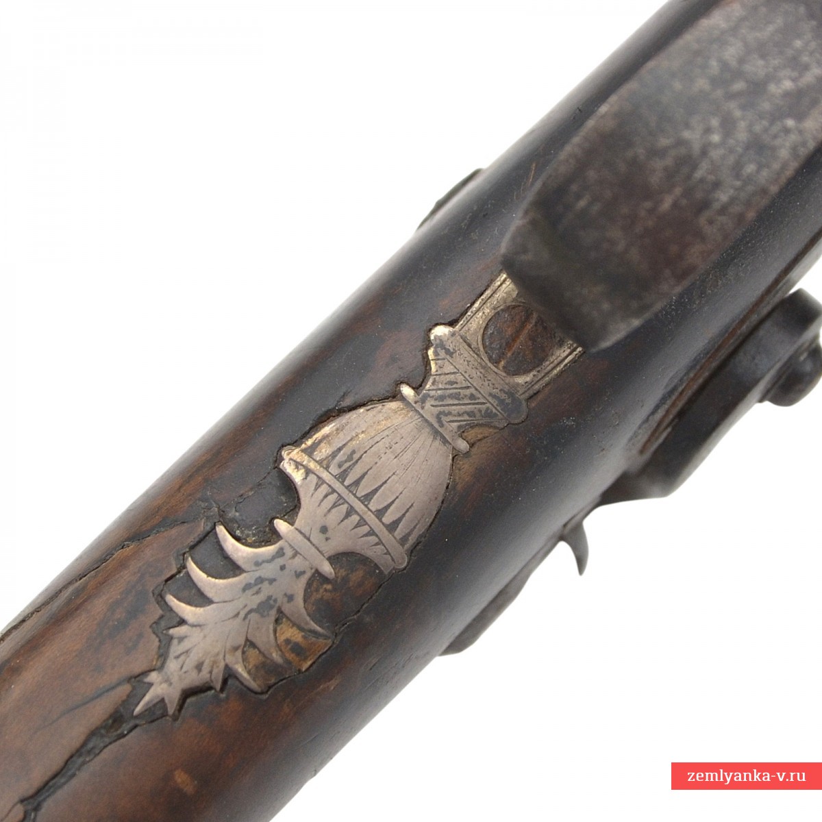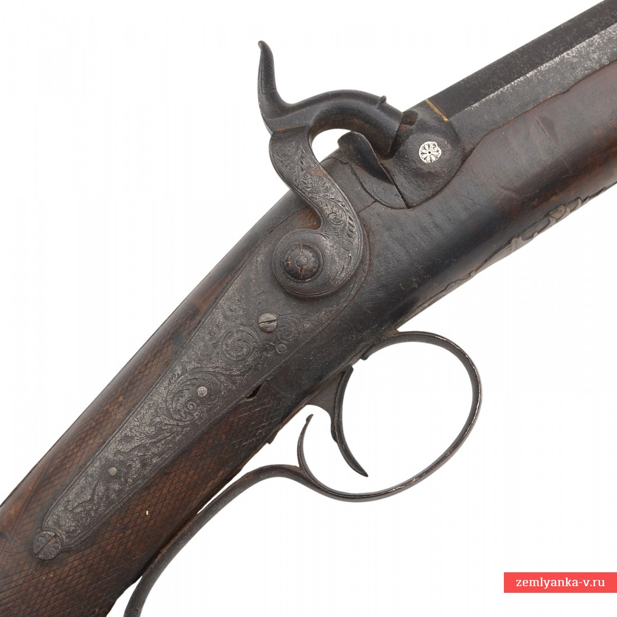 Оригинальное ружье в хорошем коллекционном состоянии. Ствол изготовлен из полосного дамаска, в первой трети 8-гранный, далее круглый. На верхней грани таушировкой золотом нанесена надпись «Leech, CHELMSFORD» (aирма «Leech and Sons» из Chelmsford (а), Эссекс, Англия, существует до сих пор, производит небольшими объемами охотничье и спортивное оружие). У основания ствола золотом нанесены изображения собаки и птиц в растительном обрамлении. Замок капсюльный, украшен гравировкой. Ложа деревянная (орех), цевье на 1/3 ствола. Под цевьем в 2 шомполльных трубках вложен деревянный шомпол. Гарантия подлинности.