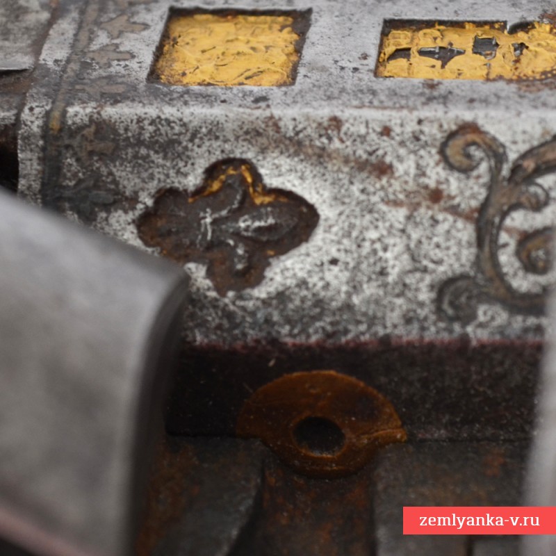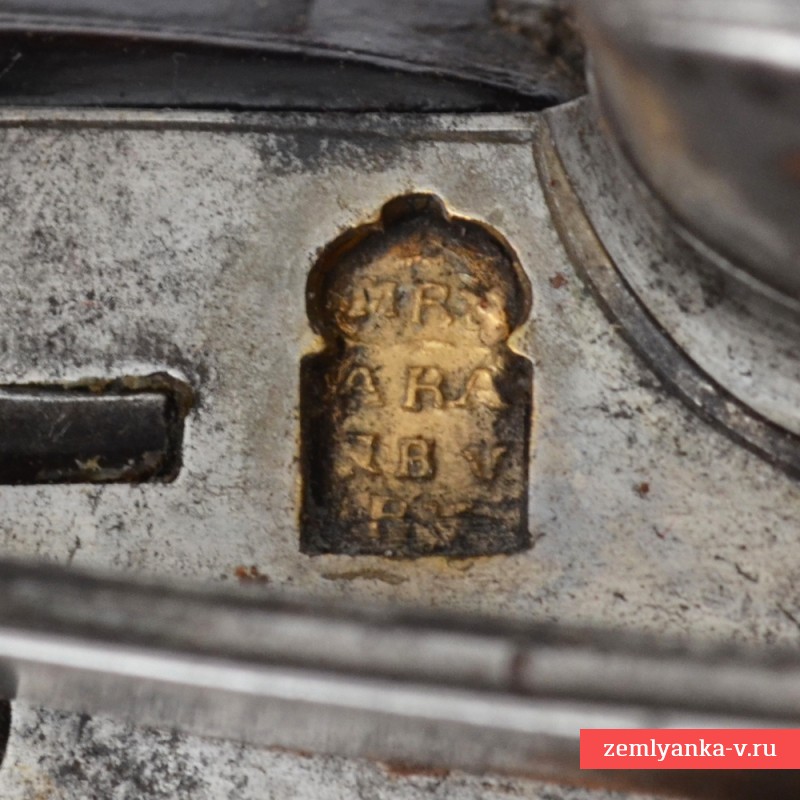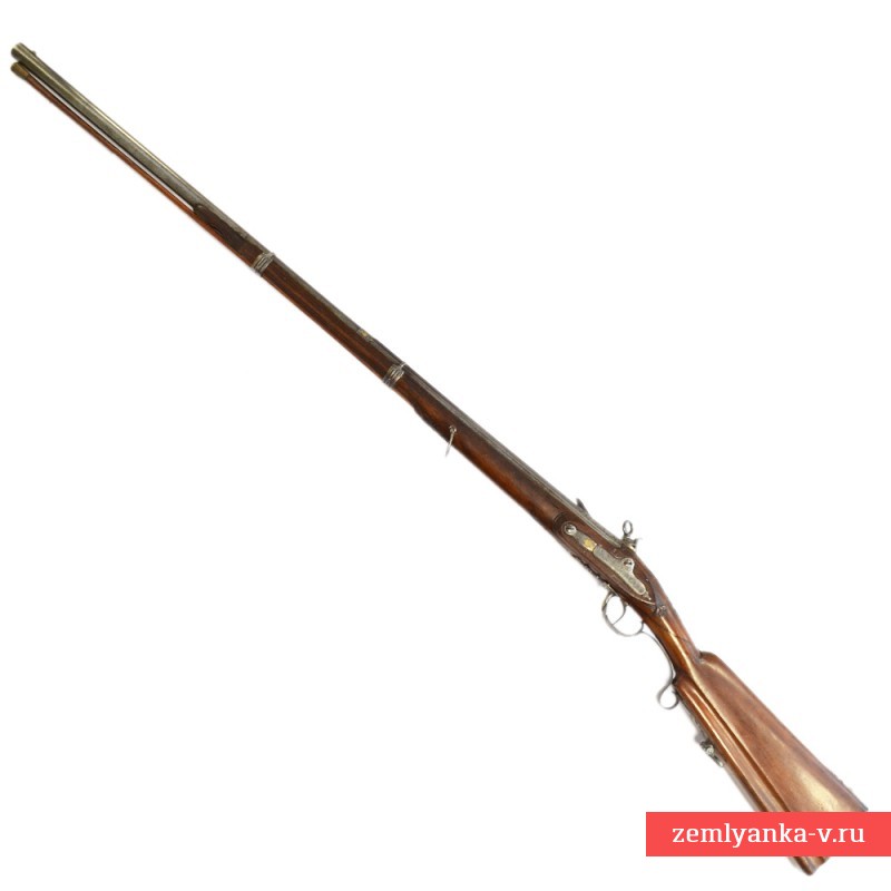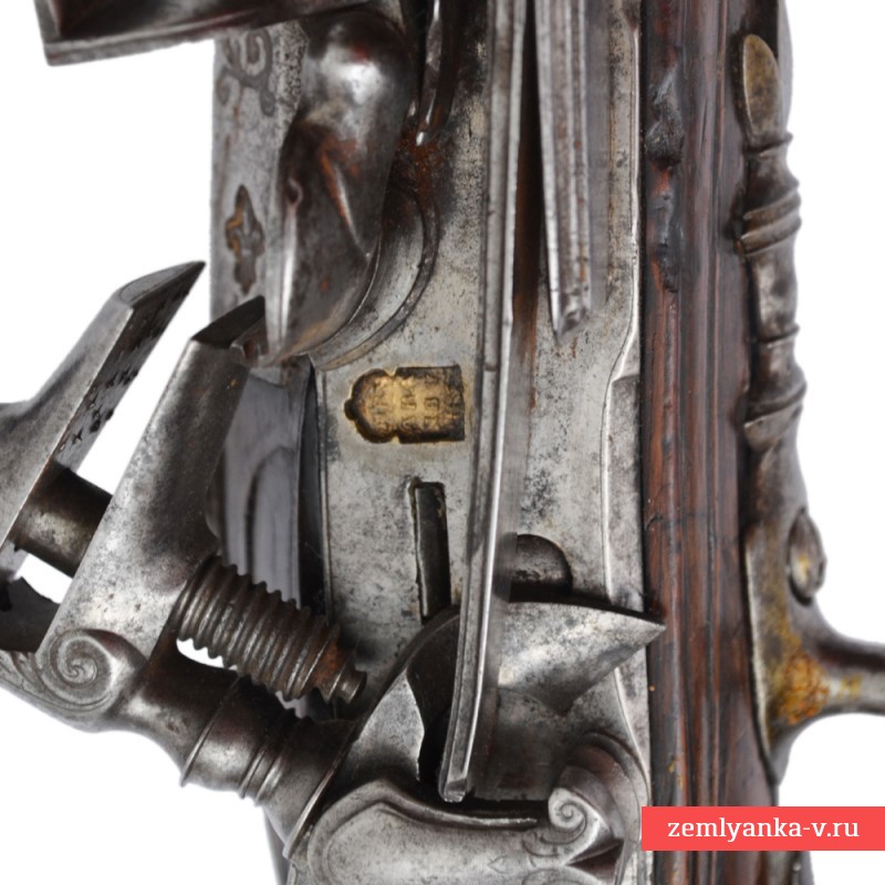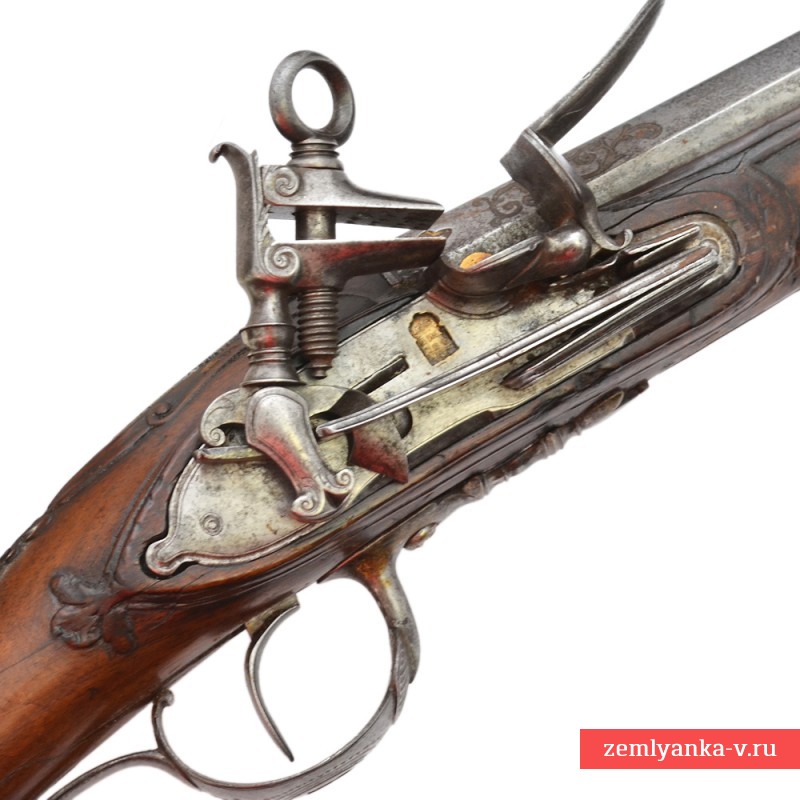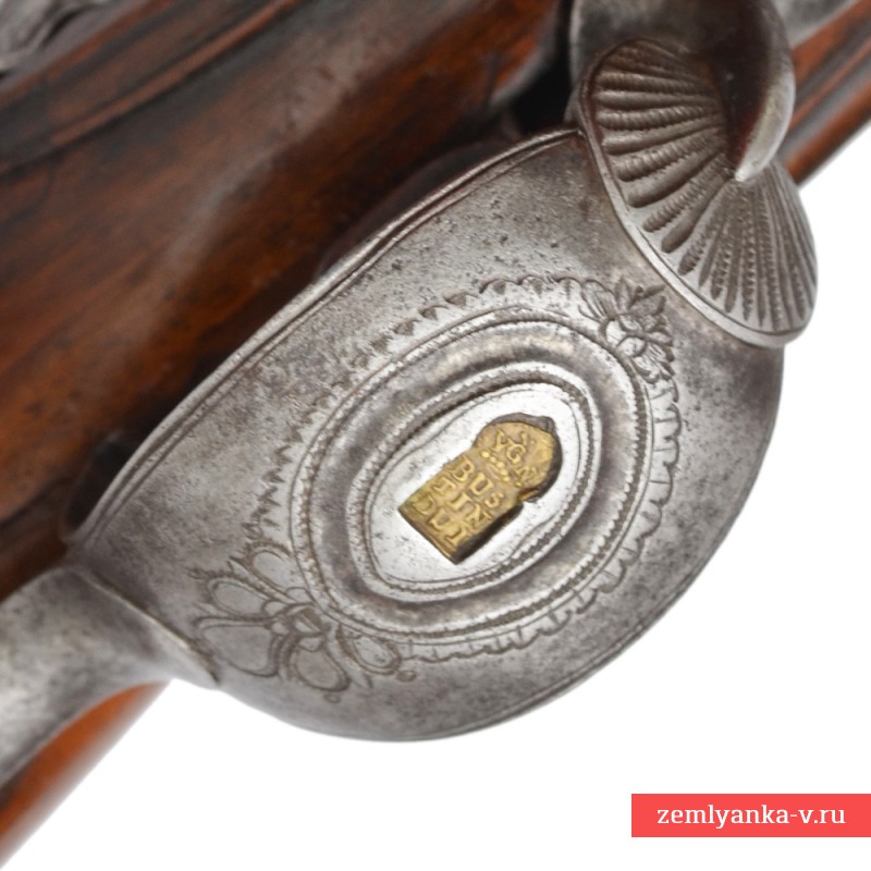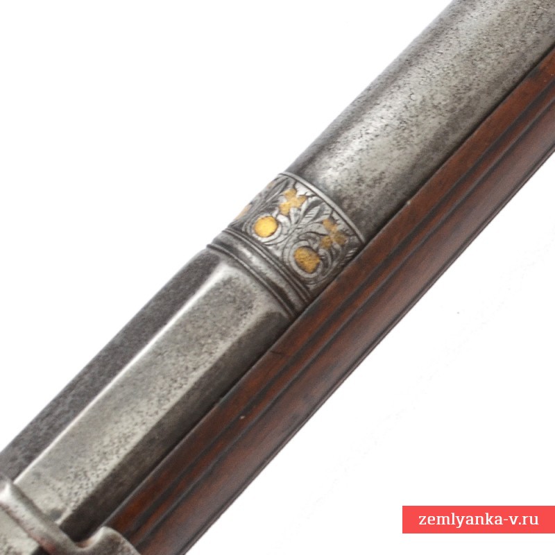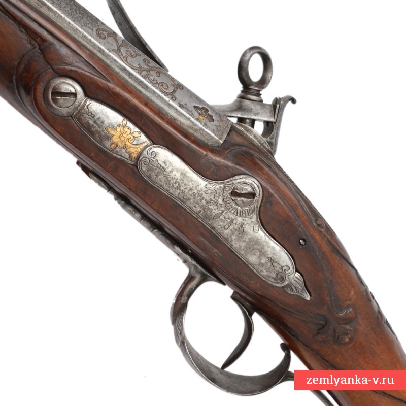 Прекрасное ружье в дорогом заказном исполнении и отличном коллекционном состоянии. Ствол стальной, в сечении круглый, фрагментарно 8-гранный, канал ствола гладкий. У казенной части ствол украшен плохо читаемыми вызолоченными клеймами испанского мастера, пробитыми в окружении бурбонских лилий. Замок кремневый, с внешним расположением пружины, что характерно для замков средиземноморского типа (т.н. «микелет»). Замочная доска украшена клеймом мастера, выполненным в виде плохо читаемого сокращения от имени в 4 строки «MRN / ARA / NBV / P.» (?). Курок стальной, украшенный завитками. Спусковая скоба стальная, округлой формы, украшена растительными завитками и клеймом мастера «BUS/TIN/DUI» (Августино Бустиндуи, работал в Мадриде и Эйбаре в период с 1740 по 1802 гг). Спусковой крючок стальной, гладкий, С-образной формы. Ложа деревянная, цевье до середины ствола. В цевье вложен деревянный шомпол (вероятно, более поздний). Гарантия подлинности.