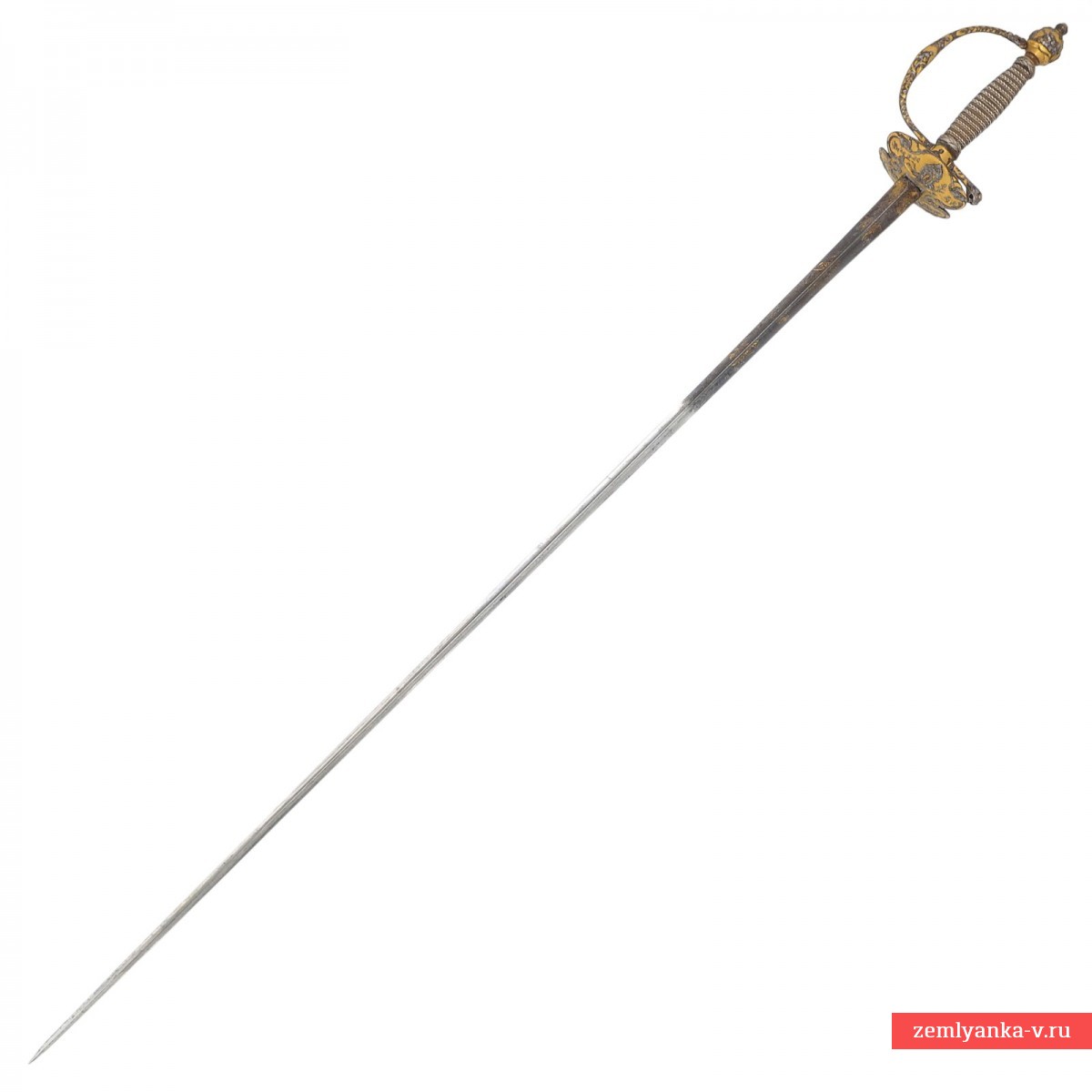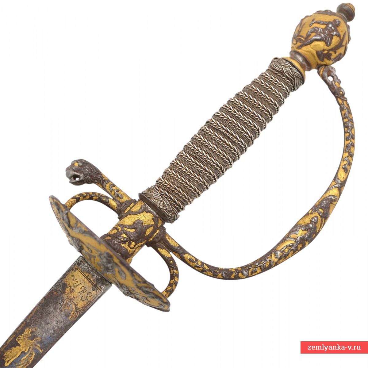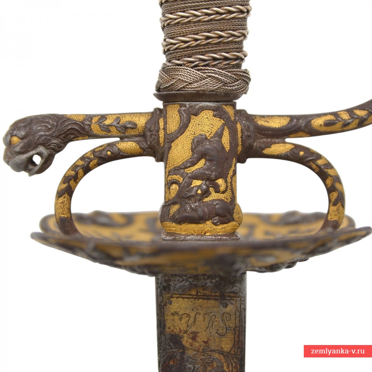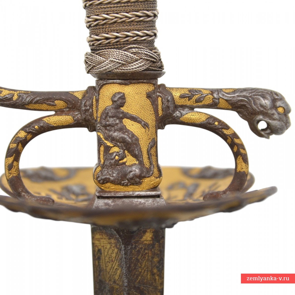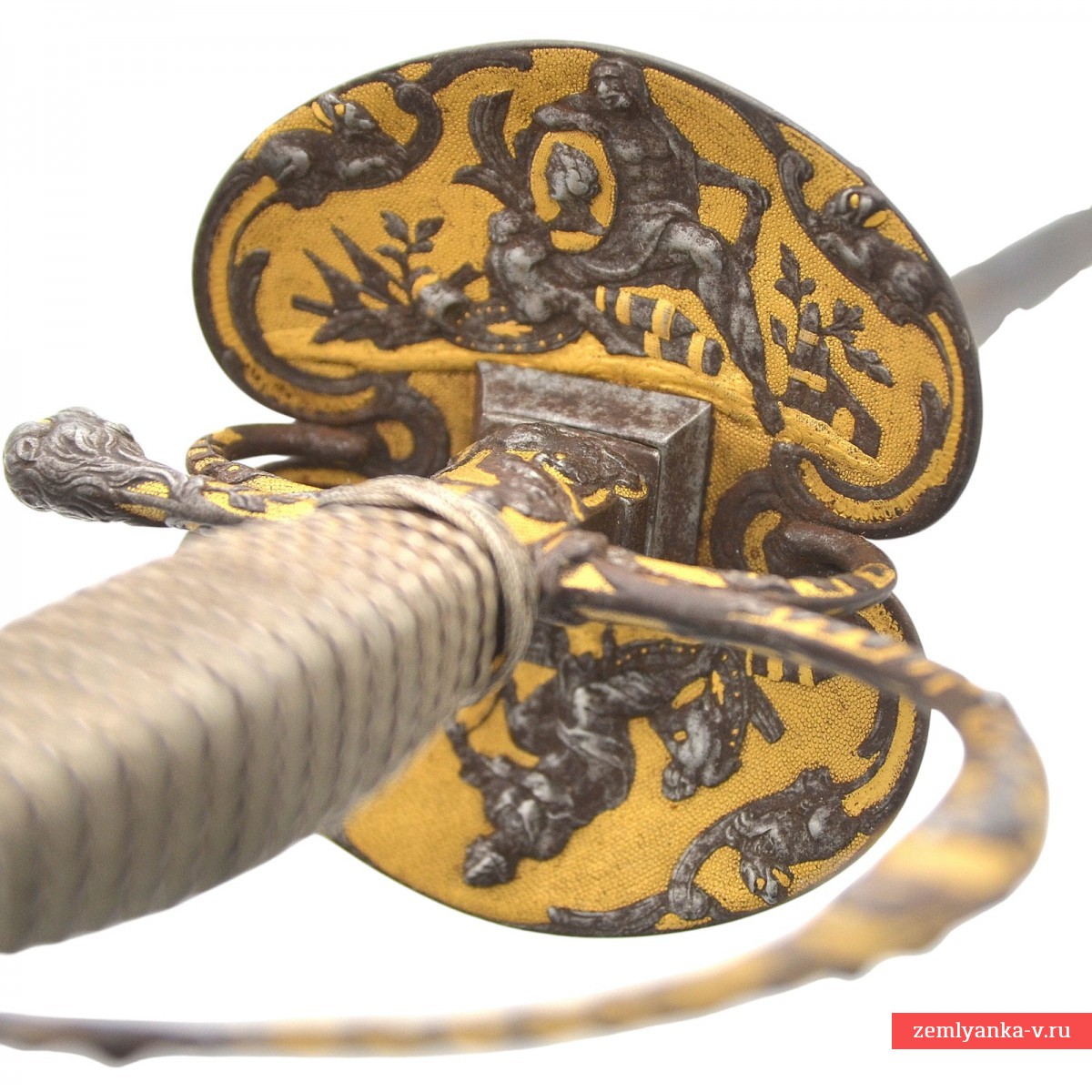 Представленный предмет - это прекрасный образец так называемых мундирных шпаг. Такие изящные шпаги во второй половине XVIII века носились с гражданской одеждой, являясь обязательным и модным аксессуаром, показателем высокого общественного положения владельца. Зачастую такие шпаги называют «small sword», обращая тем самым внимание на легкость и удобство ее ношения. Подобные шпаги редко применялись в качестве самозащиты или дуэльного оружия, но представляют, как правило, замечательные образцы оружейного искусства. Над их оформлением трудились художники и декораторы, которые стремились следовать модным тенденциям в искусстве. Законодателем моды в XVIII веке являлась Франция, и практически все оружейники Европы испытывали огромное влияние французского искусства. Это проявилось не только в использовании орнаментальных сюжетов ведущих художественных стилей барокко, рококо, неоклассицизма, но и в применении особых оформительских техник.