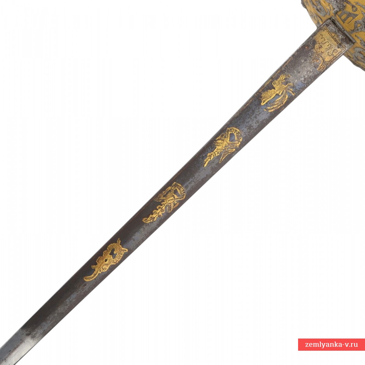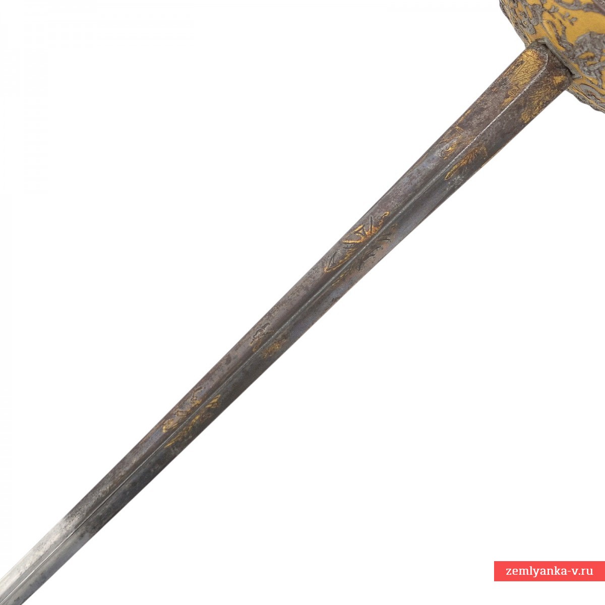 Прекрасная шпага эрмитажного уровня исполнения в очень хорошем коллекционном состоянии. Клинок стальной, прямой, трёхгранный с долами в каждой грани, сужающийся к острию. Клинок украшен синим воронением, травлёнными позолоченными орнаментами на растительную тематику, а также изображениями военной арматуры.