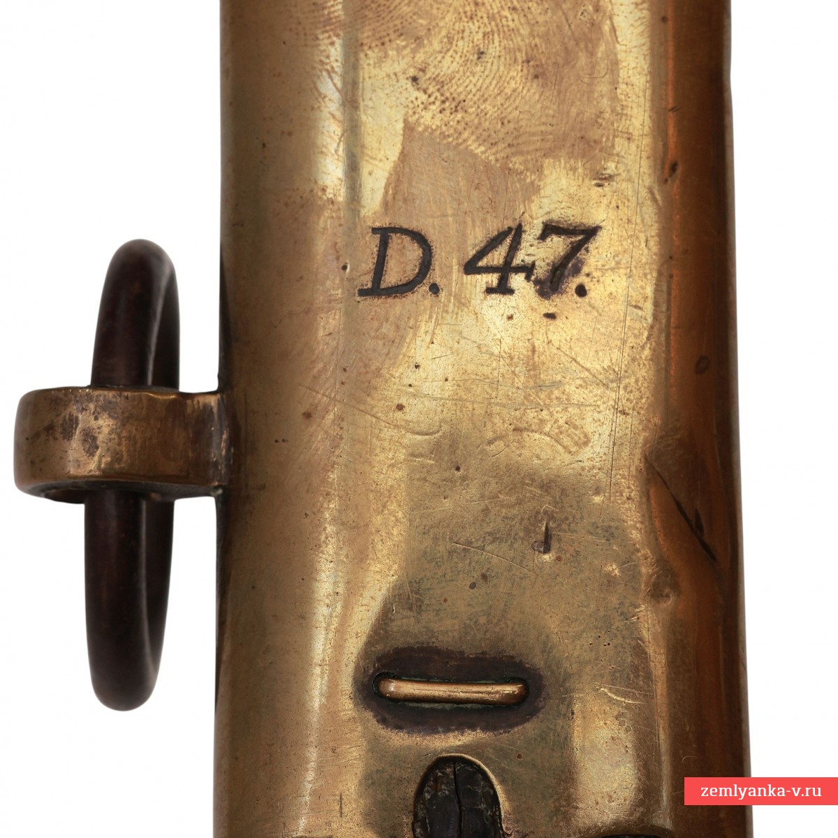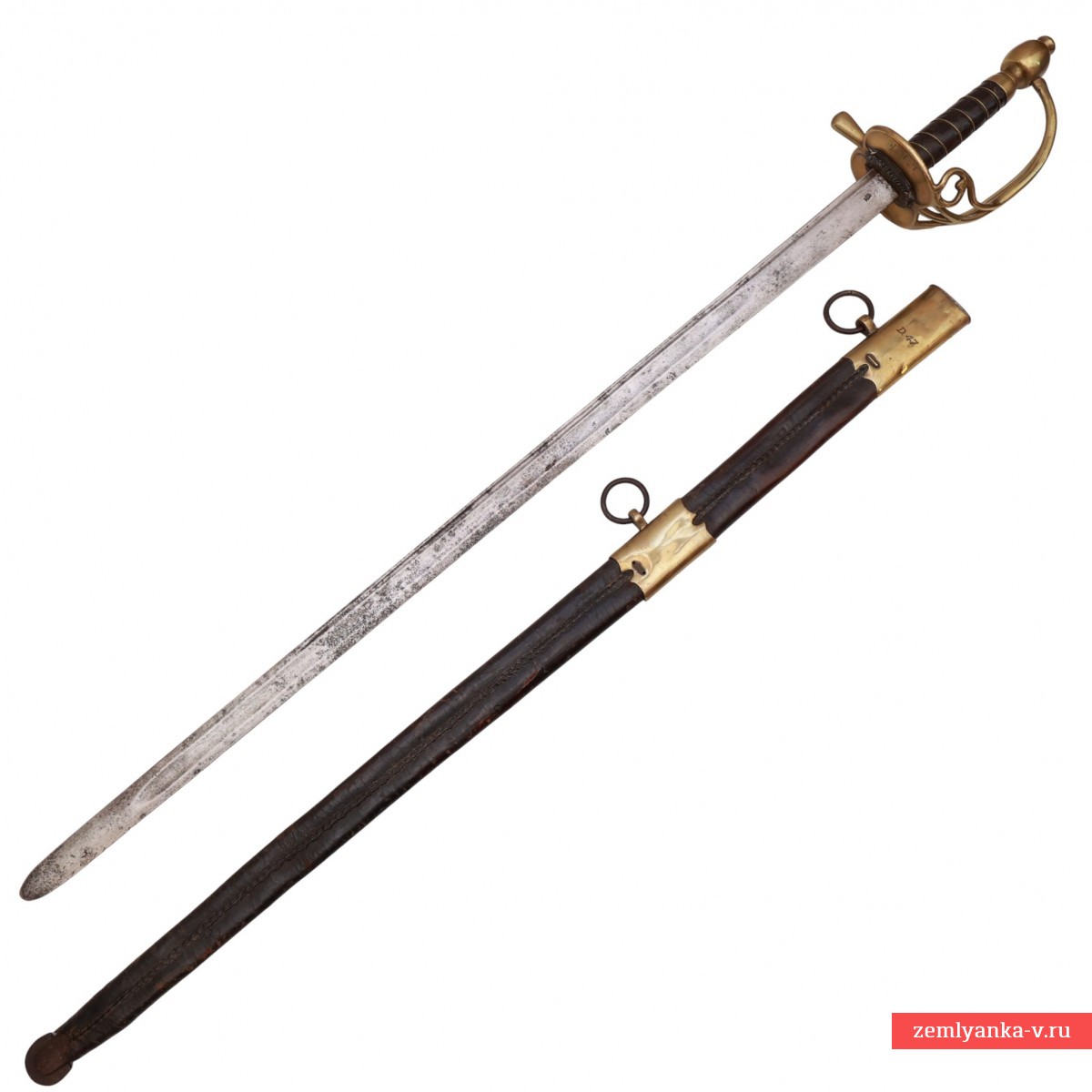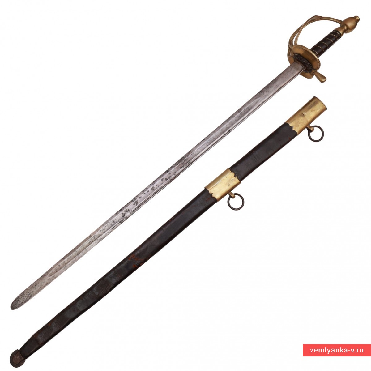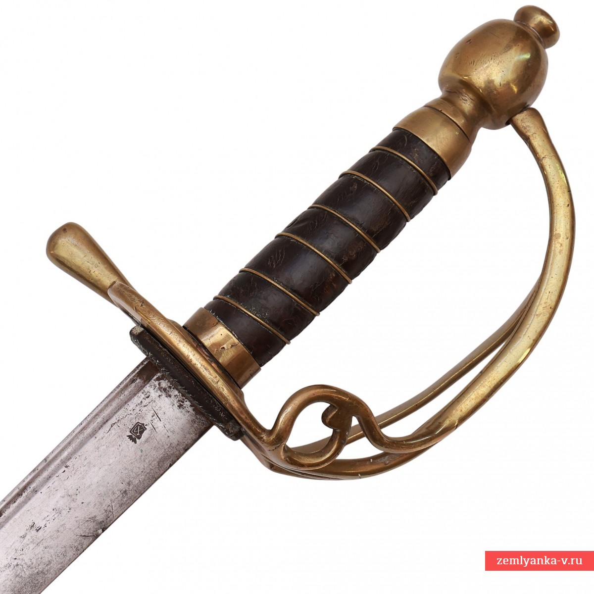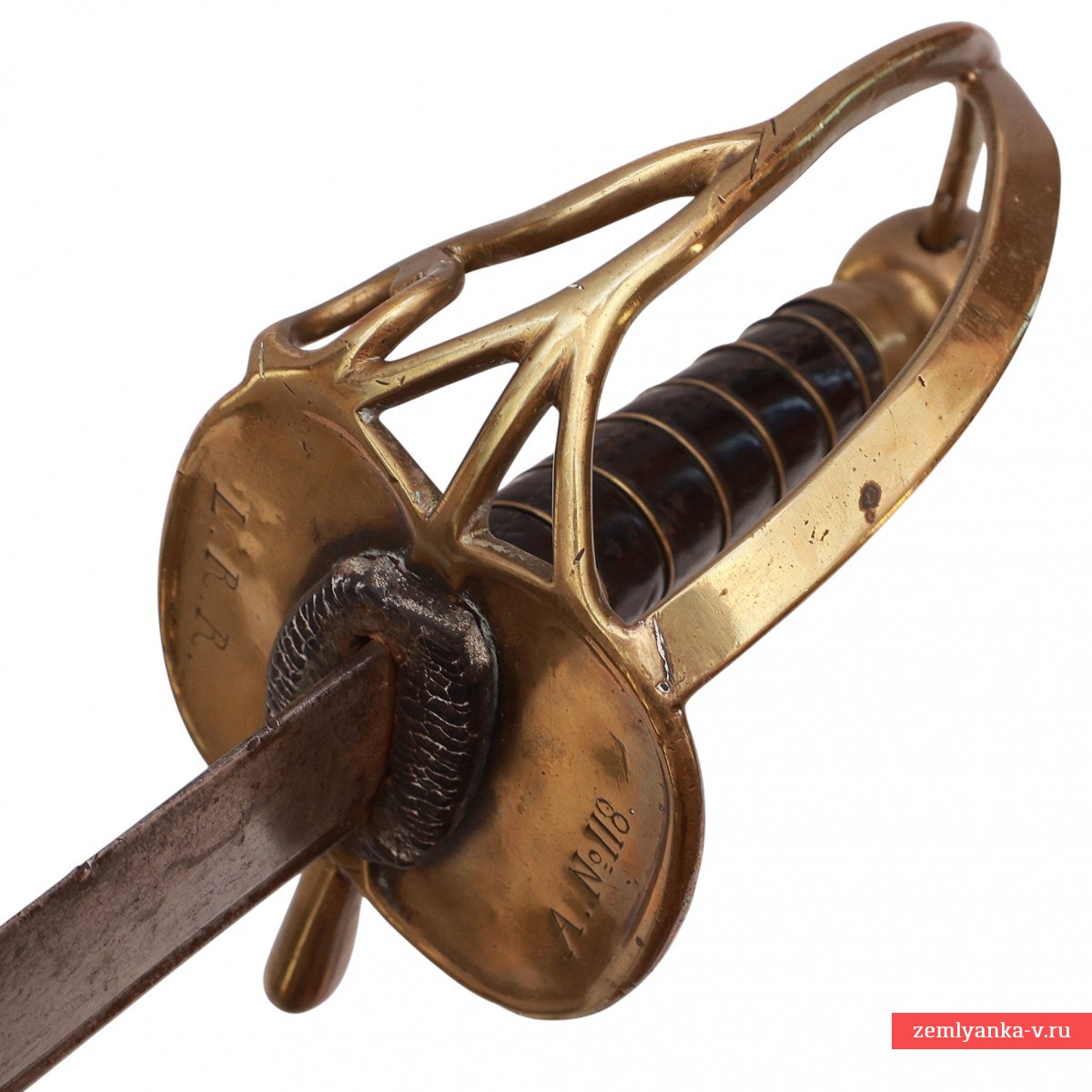 Достаточно редкий палаш в хорошем состоянии. Клинок стальной, прямой, однолезвийный, с одним широким и одним узким долами с обеих сторон. Боевой конец закруглённый. Эфес состоит из рукояти и гарды. Рукоять деревянная, веретенообразная, обтянутая кожей со спиралевидными желобками, по которым обмотана латунной проволокой. Навершие латунное, фигурное, шарообразное с пуговкой сверху. На рукояти с обеих сторон имеются конические латунные втулки. Гарда образована одной основной защитной дужкой, которая плавно переходит в симметричную двух лепестковую чашку гарды. От основной дужки с лицевой стороны отходят две дополнительные дужки, которые, расширяясь, образуют защитный щиток и переходят в чашку гарды. С внутренней стороны от основной дужки отходит одна дополнительная, которая, расширяясь, образует защитный щиток и переходят в чашку гарды. Ножны кожаные с латунным прибором, состоящим из устья и обоймицы с подвижными кольцами для ремней портупеи. Башмак кожаный.
