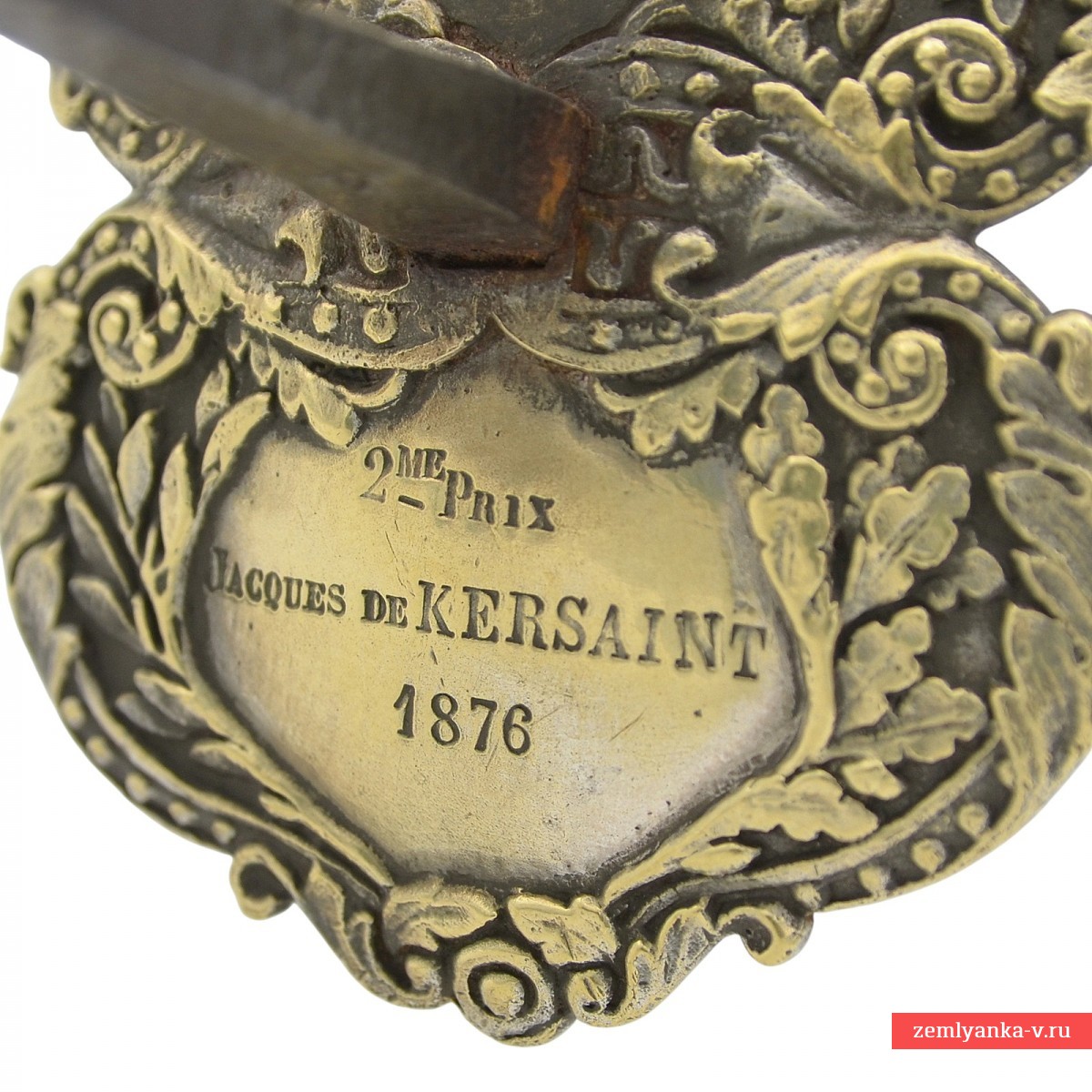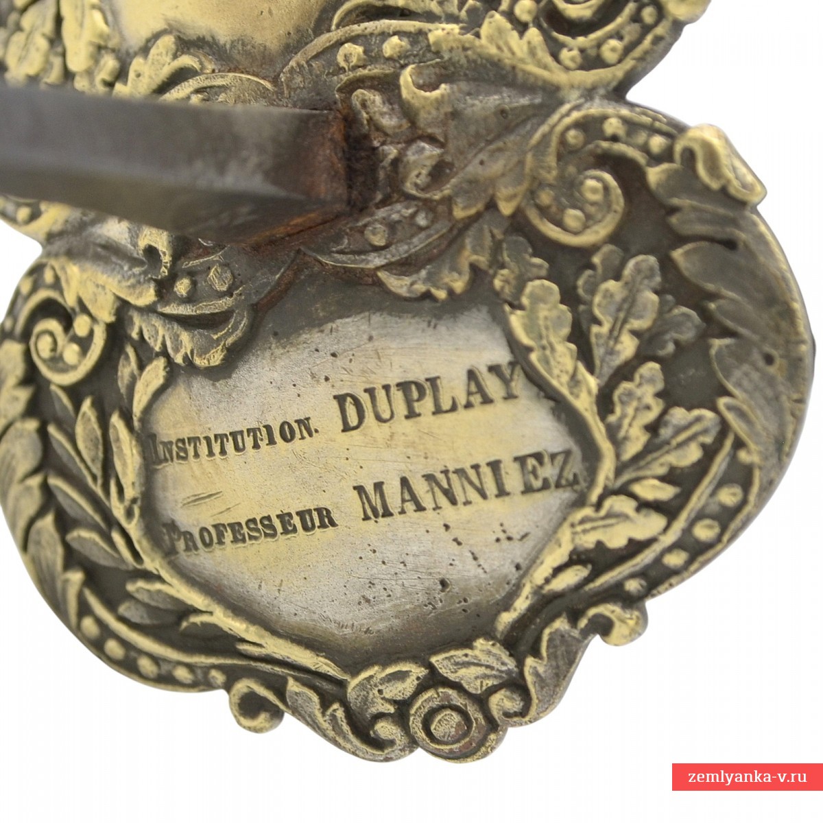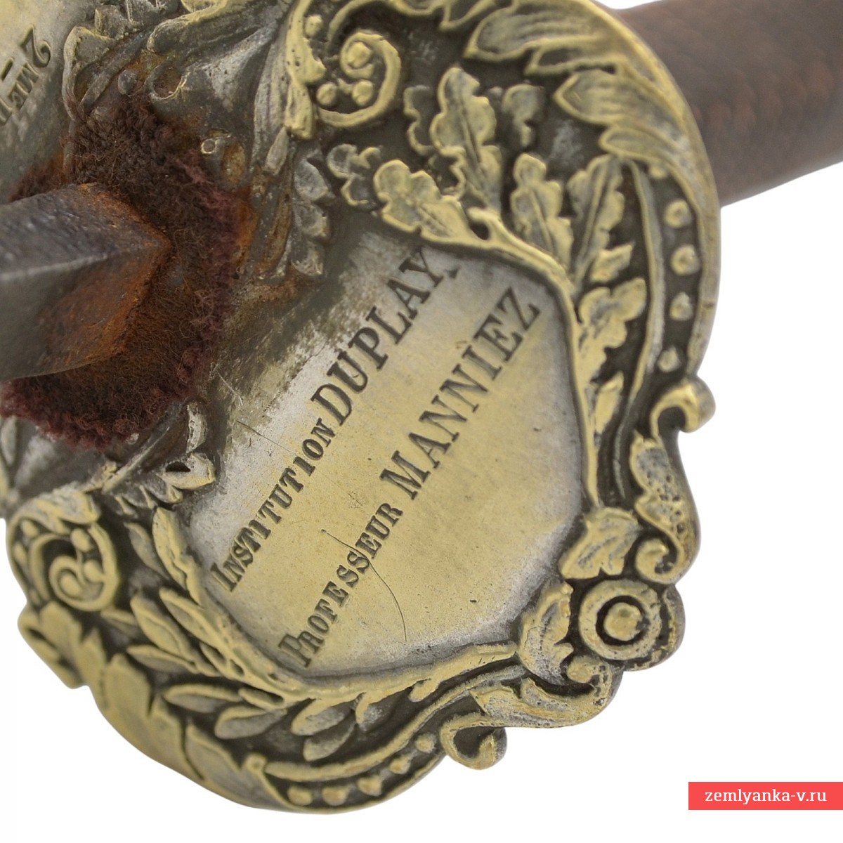 Очень редкие и интересные рапиры в хорошем коллекционном состоянии. Сталь, дерево, бронза, серебрение. Каждая рапира состоит из клинка и эфеса. Клинки стальные, в сечении 4-гранные, без долов. Клинки изготовлены знаменитой мануфактурой братьев «Куло» в Клингентале, о чем говорят множественные клейма у основания. Эфесы состоят из рукоятей, наверший и чашек. На чашках рапир помещены наградные надписи: «2me Prix Jacques de Kersaint 1876 Institution Duplay Professeur Manniez» ( «2-ой приз Жаку-де Керсену, 1876 год, институт Дюпле, профессор Манние», франц.). Данная надпись говорит о том, что рапиры были вручены в качестве 2-го приза, вероятно, студенту института Дюплей Жаку-де Керсену, преподавателем (фехтования?) профессором Манние. Институт Дюплей был одной из престижных частных школ-интернатов, часто расположенных в Париже (особенно в центральных районах или на Левом берегу), которые готовили сыновей буржуазии и аристократии к основным национальным конкурсным экзаменам или экзаменам на получение аттестата о среднем образовании. В то время эти учреждения дополняли или служили альтернативой престижным государственным лицеям, таким как лицеи Луи-ле-Грана или Генриха IV. Они славились своей строгой дисциплиной, индивидуальным подходом к обучению и качеством преподавательского состава, часто состоявшего из профессоров с учеными степенями или известных наставников. Название «Дюплей» имеет историческое значение, поскольку семья Дюплей была известна тем, что укрывала Робеспьера во время революции, хотя в XIX веке учреждение больше ориентировалось на академическое превосходство, чем на политическую активность. Чашки рапир изготовлены из бронзы и почти полностью сохранили оригинальное серебрение. Рукояти деревянные, по всему периметру обмотаны проволокой. Ножны не предполагались. Великолепный подарок любому любителю фехтования, гарантия подлинности!