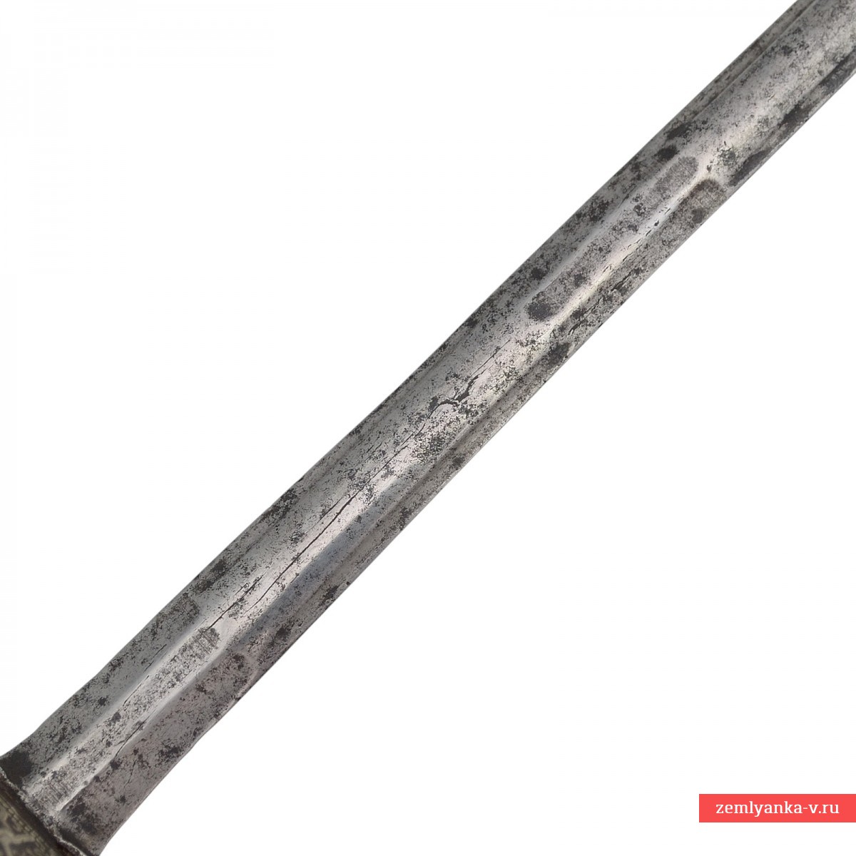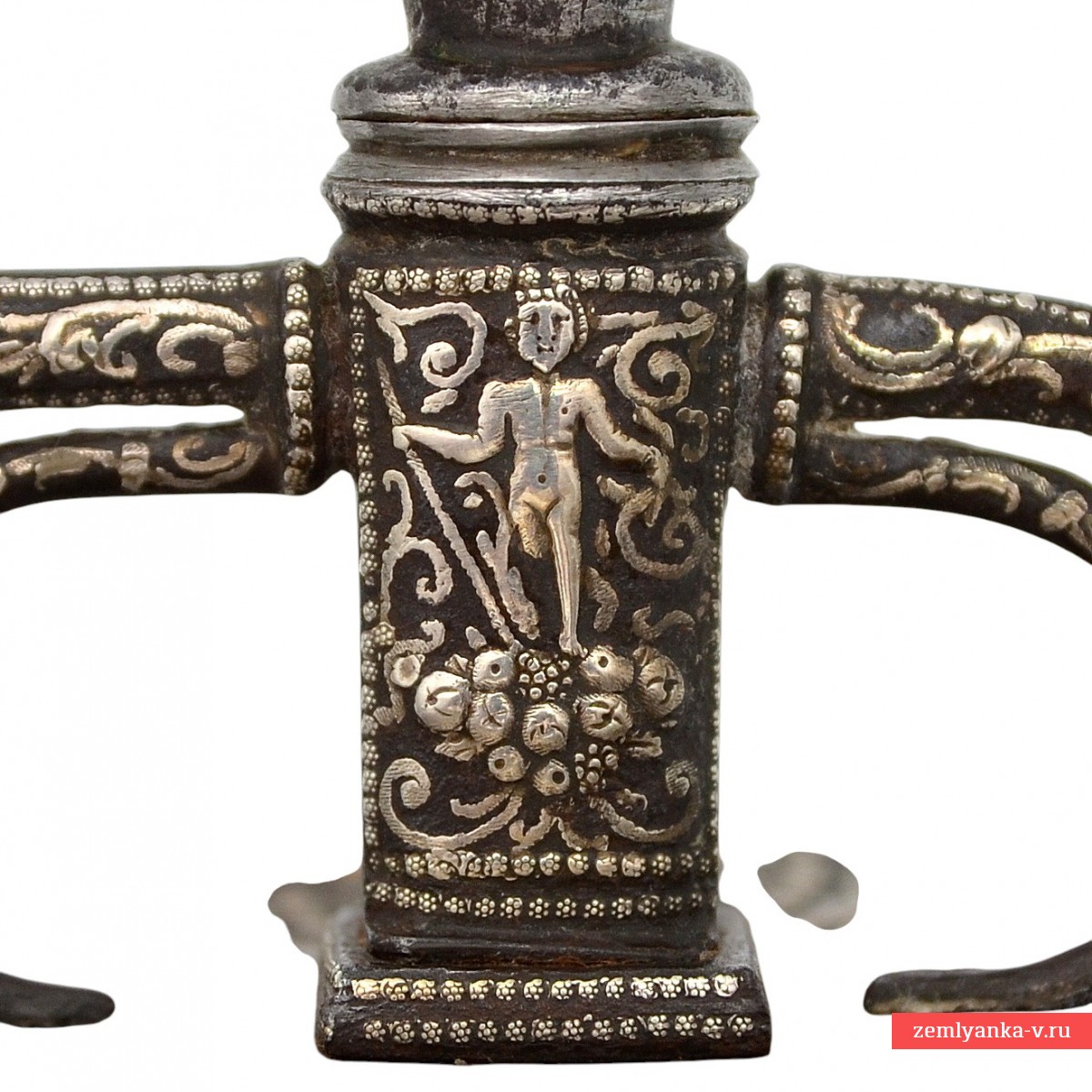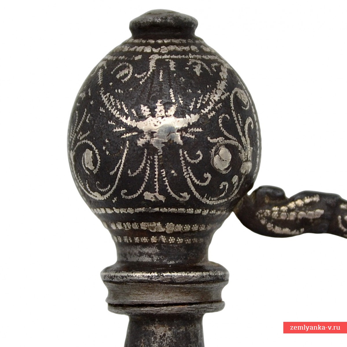 Эфес состоит из рукояти и стальной гарды. Эфес украшен таушированием серебром (инкрустация одного металла другим, более мягким и имеющим меньшую температуру плавления. Сущность процесса заключается в том, что наружную поверхность изделия специальным образом насекают (отсюда и название) и набивают проволокой (полосами, расплавом) цветного или драгоценного металла в виде узора или рисунка. В одних случаях это тончайший орнамент из завитков и стилизованных растений, в других — изображения животных, птиц или человека. Иногда методом насечки осуществляют надписи на металле, орнаментированные в той или иной манере. При насечке на поверхности основного металла делают углубления, которые сформированы так, чтобы можно было вложить и вковать в них более мягкий металл). Рукоять стальная, овального сечения. Головка — округлой формы с выступом, на котором расклепан хвостовик клинка. Гарда состоит из боковой дужки, переходящей в короткий конец крестовины. Под крестовиной — подпальцевые дуги, скрепленные с двудольной чашкой, на которой изображены держащиеся за руки человеческие фигуры в растительном обрамлении. Ножны отсутствуют.