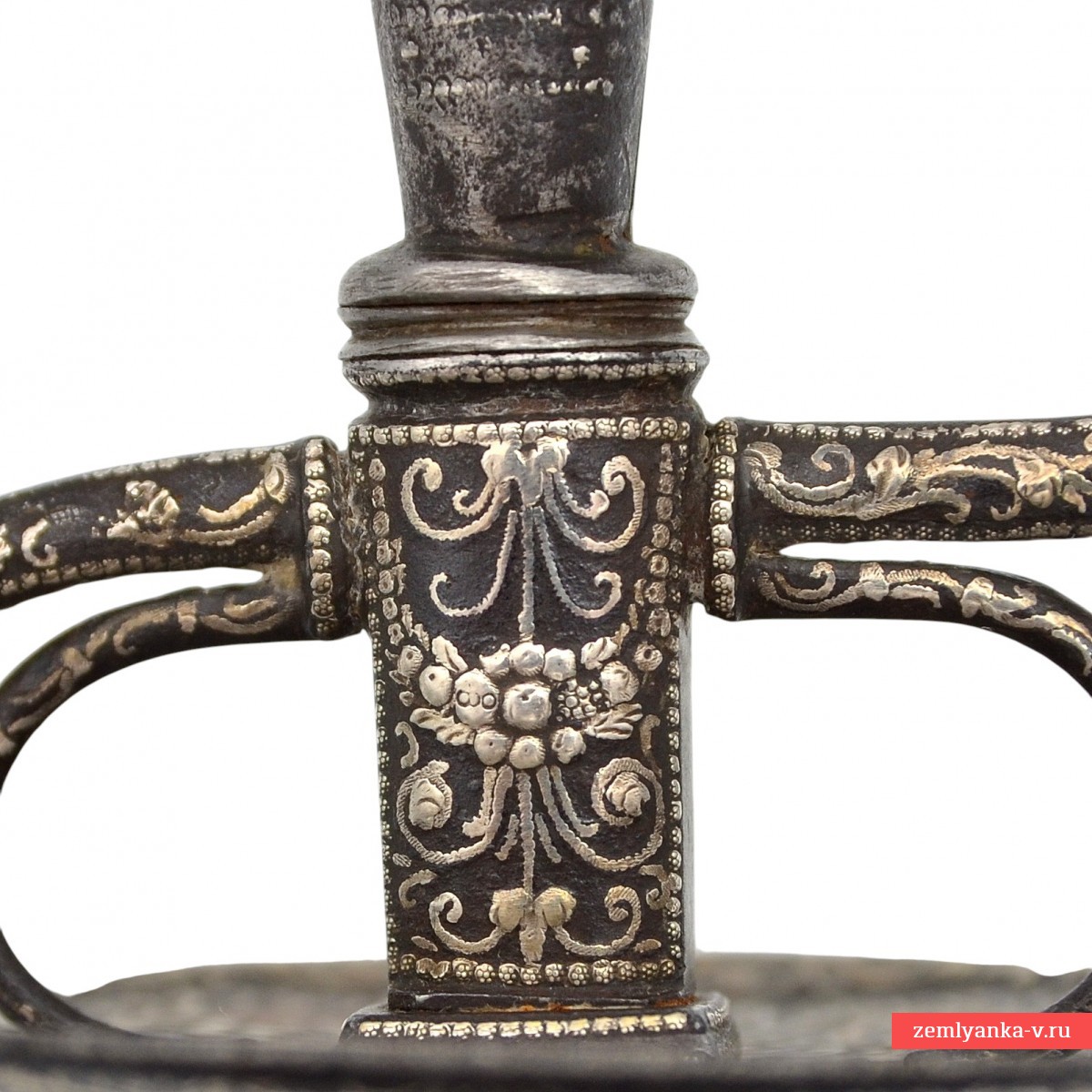 Прекрасная шпага с эфесом, украшенным рукой мастера очень высокого уровня. Клинок стальной, прямой, линзовидного сечения, у пяты с углублениями. Клинок без клейм.