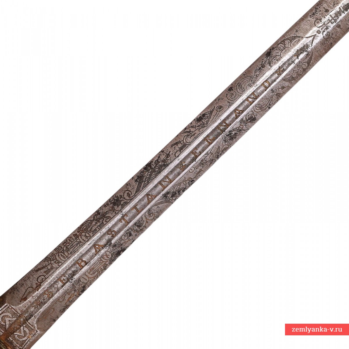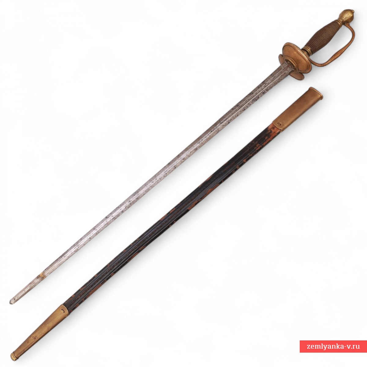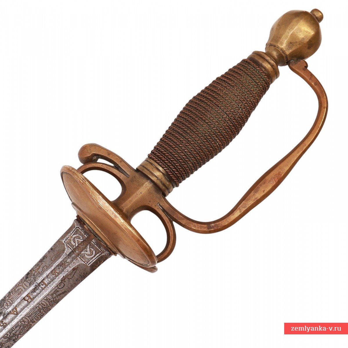 Оригинальная шпага в удовлетворительном состоянии. Аналогичные шпаги описаны в книге Висенте Момпарлера «Espadas ESPANOLAS MILITARES Y CIVILES del siglo XVI al XX», 2010 г., на стр. 115-117. Клинок стальной, прямой, двулузвийный, шестигранный в сечении с одним долом по средней линии на одну треть длины. Клинок украшен травлёными орнаментами на растительную тематику, завитками, военной арматурой/трофеями; также в доле нанесена надпись «SEBASTIAN ERNAND» (клеймо мастера). Эфес состоит из рукояти и латунной гарды. Рукоять, крепящаяся на полосу всадным способом, – прямая, бочкообразная, в сечении – круглая, по всему периметру обмотана витой латунной проволокой. Снизу и сверху на рукояти расположены латунные втулки с двумя поясками. Навершие рукояти – в виде массивной шарообразной головки на ножке; ножка выполняет роль верхней втулки рукояти. Головку венчает округлая латунная пуговка. Гарда образована одной гладкой узкой передней дужкой, имеющей выраженную центральную грань, исходящей от головки и, плавно изгибаясь, переходящей в крестовину с прямыми утолщенными фигурными концами. Под крестовиной с обеих сторон расположены прорезные полуовальные симметричные щитики, формирующие чашку гарды. Чашка украшена рельефными растительными завитками. От крестовины к чашке отходят две полудужки, образующие кольца. Ножны кожаные с латунным прибором, состоящим из устья с длинным шпеньком и наконечника с уплощенным башмаком.