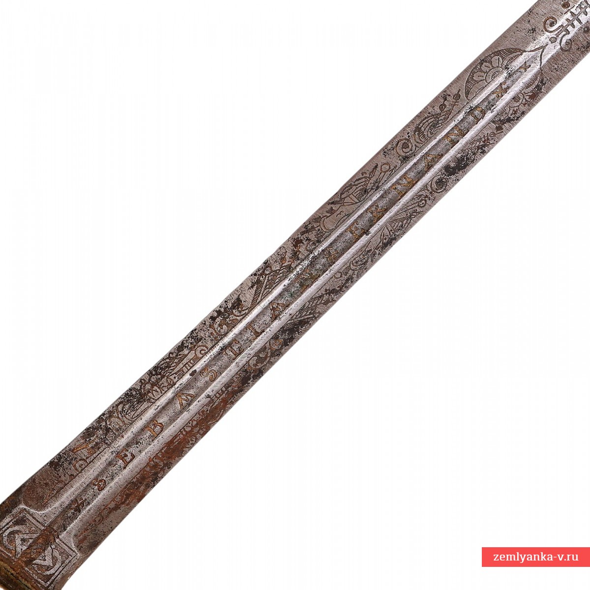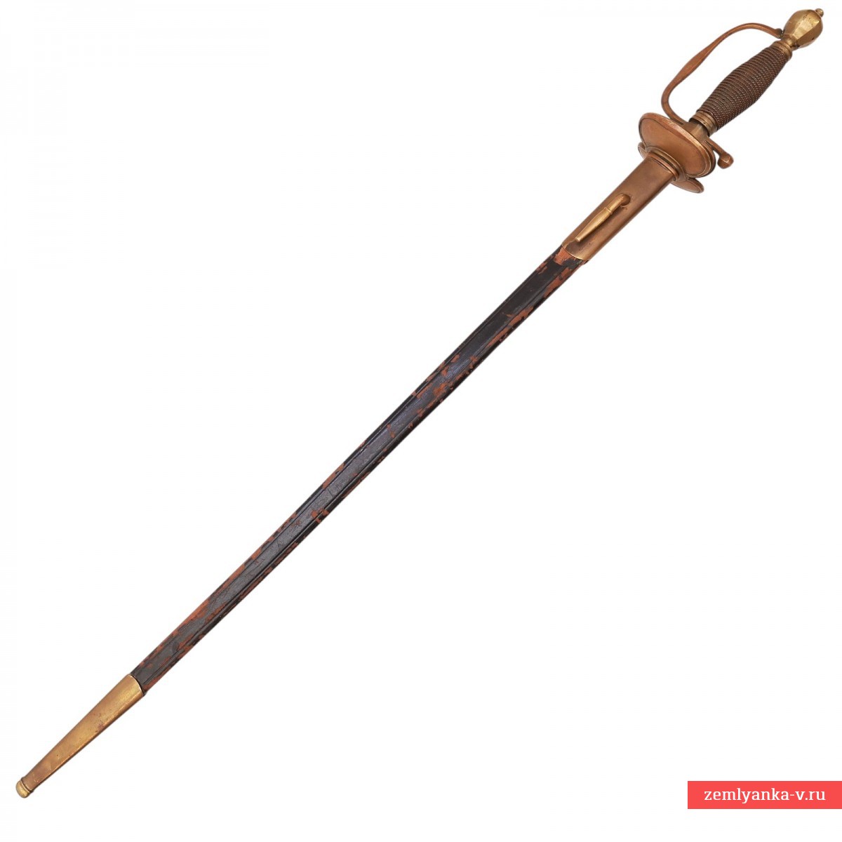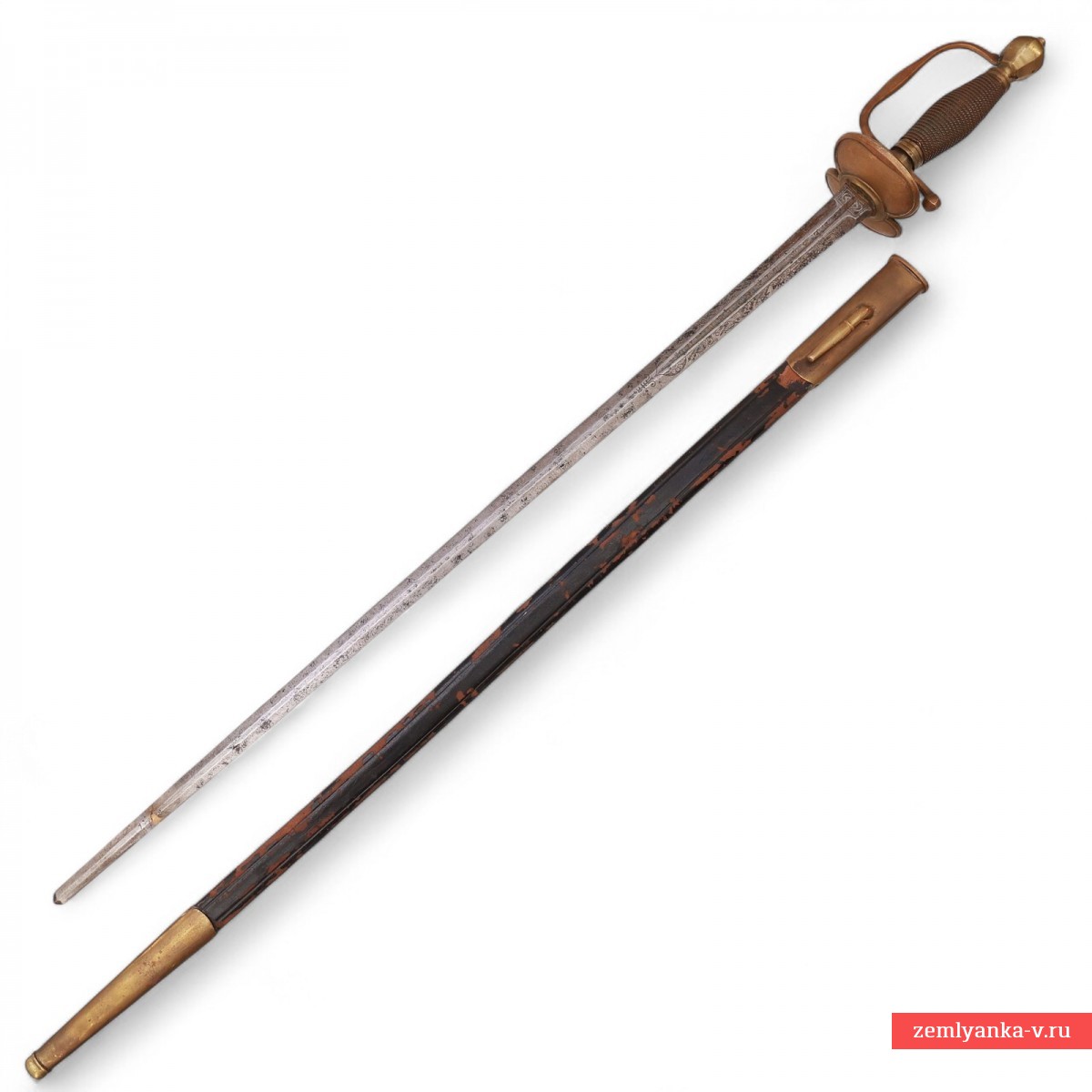 Оригинальная шпага в удовлетворительном состоянии. Аналогичные шпаги описаны в книге Висенте Момпарлера «Espadas ESPANOLAS MILITARES Y CIVILES del siglo XVI al XX», 2010 г., на стр. 115-117. Клинок стальной, прямой, двулузвийный, шестигранный в сечении с одним долом по средней линии на одну треть длины. Клинок украшен травлёными орнаментами на растительную тематику, завитками, военной арматурой/трофеями; также в доле нанесена надпись «SEBASTIAN ERNAND» (клеймо мастера). Эфес состоит из рукояти и латунной гарды. Рукоять, крепящаяся на полосу всадным способом, – прямая, бочкообразная, в сечении – круглая, по всему периметру обмотана витой латунной проволокой. Снизу и сверху на рукояти расположены латунные втулки с двумя поясками. Навершие рукояти – в виде массивной шарообразной головки на ножке; ножка выполняет роль верхней втулки рукояти. Головку венчает округлая латунная пуговка. Гарда образована одной гладкой узкой передней дужкой, имеющей выраженную центральную грань, исходящей от головки и, плавно изгибаясь, переходящей в крестовину с прямыми утолщенными фигурными концами. Под крестовиной с обеих сторон расположены прорезные полуовальные симметричные щитики, формирующие чашку гарды. Чашка украшена рельефными растительными завитками. От крестовины к чашке отходят две полудужки, образующие кольца. Ножны кожаные с латунным прибором, состоящим из устья с длинным шпеньком и наконечника с уплощенным башмаком.