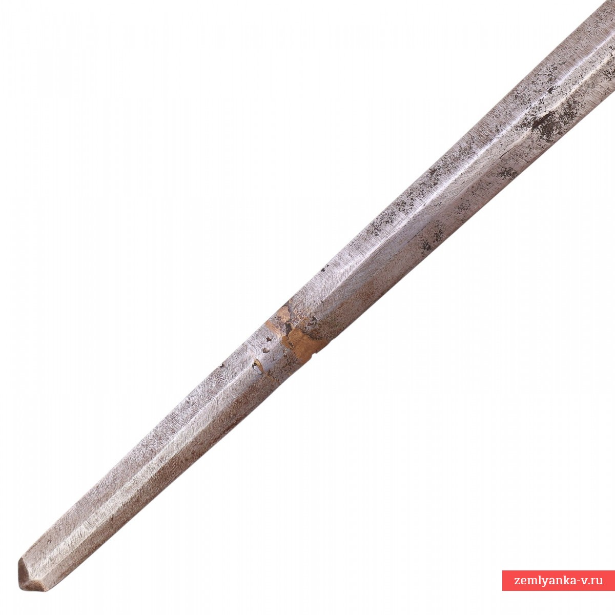 предмет находится в неплохом коллекционном состоянии. Потёртости, царапины и следы бытования на ножнах. Клинок у боевого конца имеет следы пайки; незначительно укорочен. Следы бытования на эфесе.