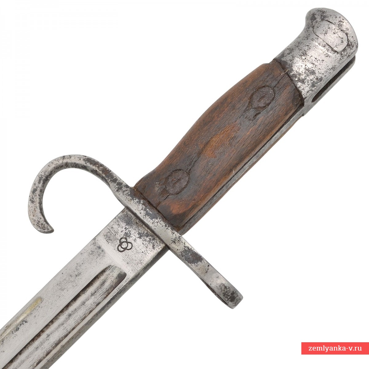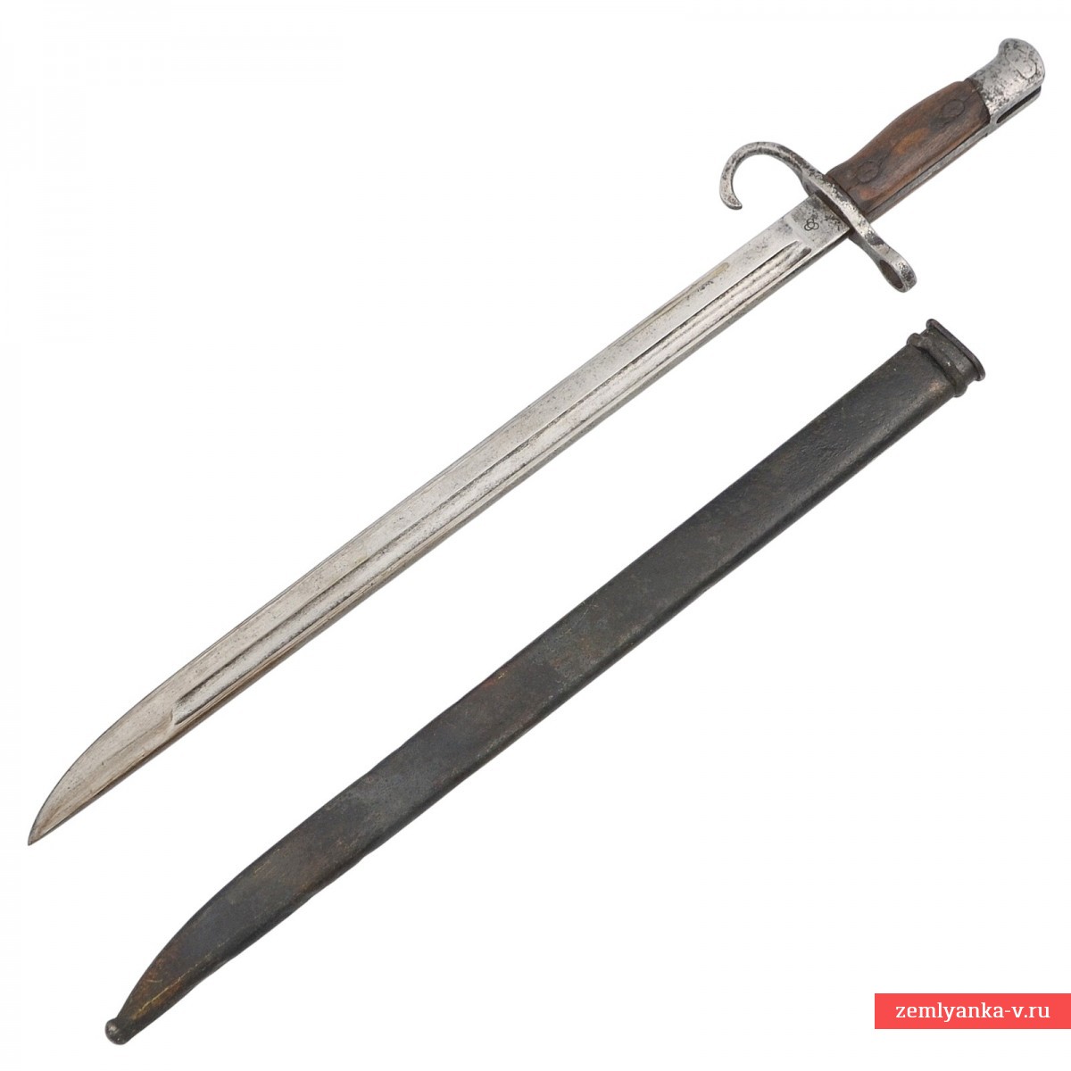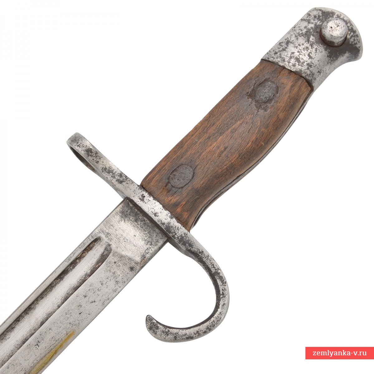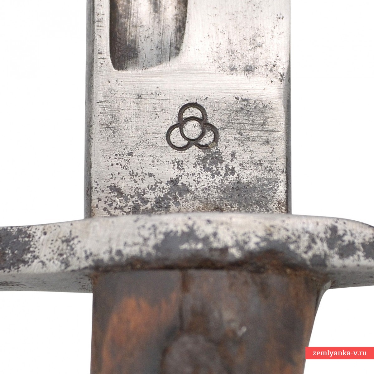 Клинок стальной, прямой, однолезвийный, с одним широким долом с обеих сторон. Рукоять образована двумя деревянными щечками, скреплёнными с хвостовиком двумя заклепками. В головке рукояти Т-образный паз и пружинная защёлка. Крестовина с загнутым окончанием и с кольцом для ствола со стороны обуха клинка. Ножны стальные со вставным устьем, скобой и шариком на конце.