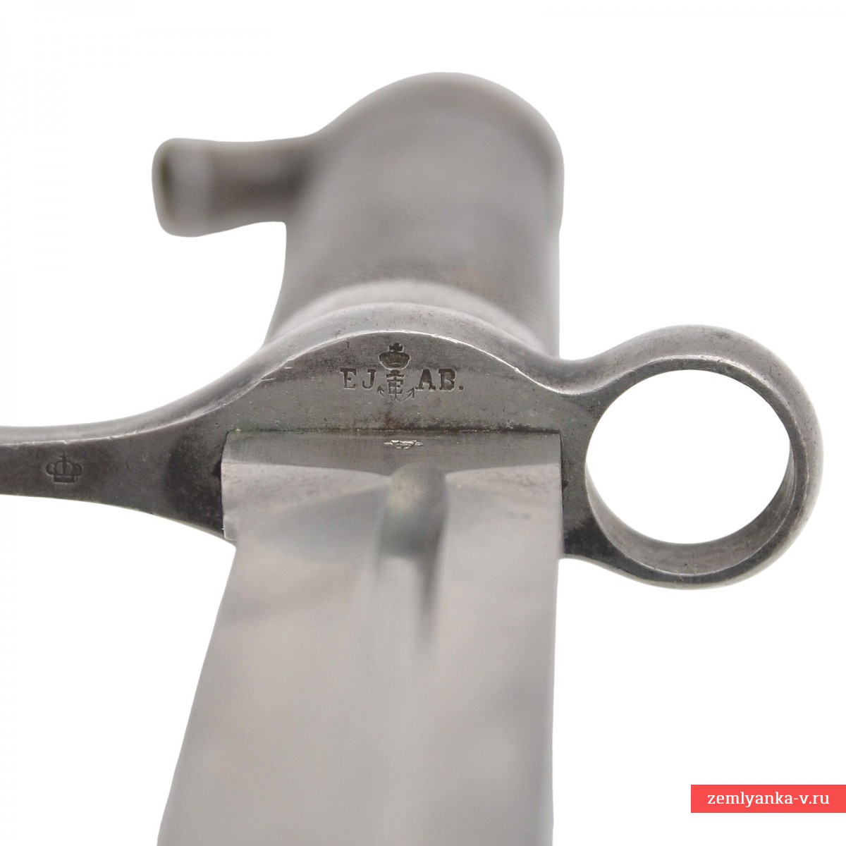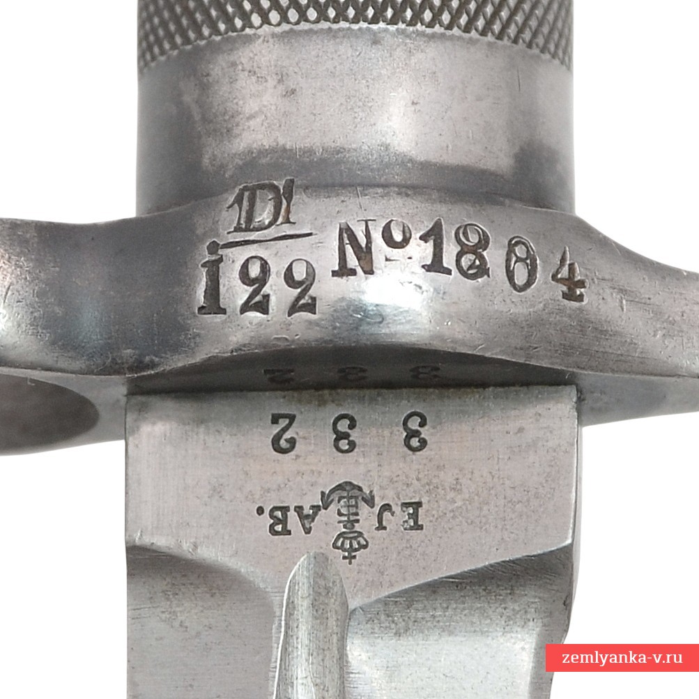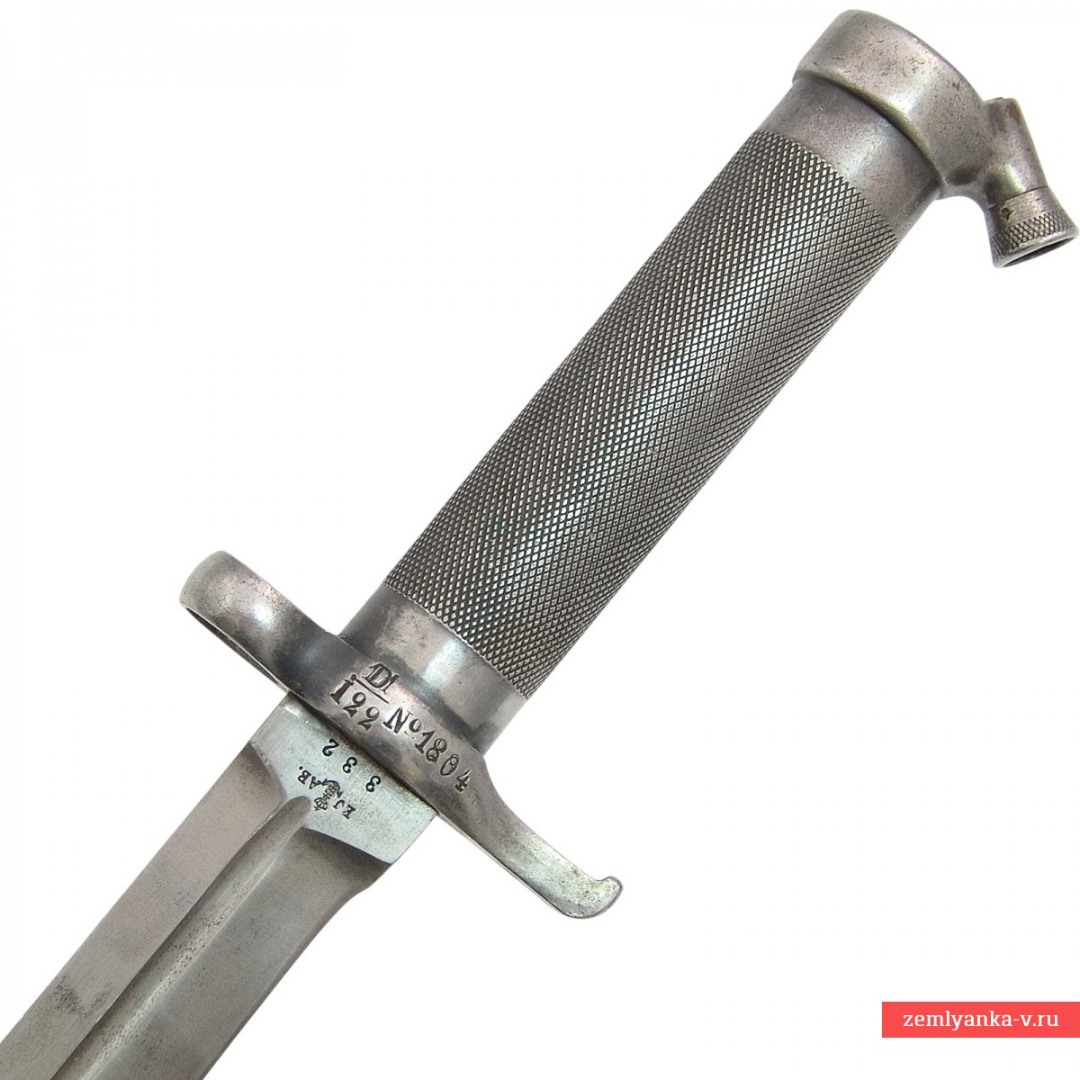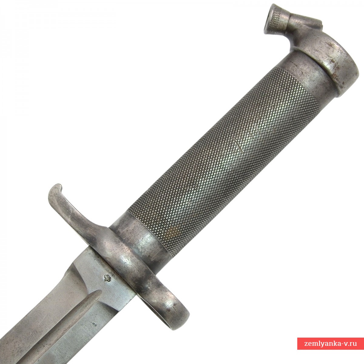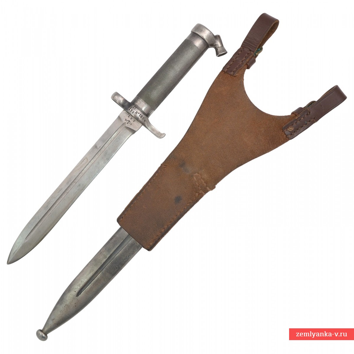 Оригинальный штык в отличном состоянии, в комплекте с оригинальным подвесом для крепления на амуницию. Гарантия подлинности. Клинок стальной, прямой, однолезвийный, с одним узким долом по средней линии, сужающийся к концу. Боевой конец двулезвийный. Рукоять стальная полая, овального сечения, с рифленой поверхностью. В верхней части рукояти находится пружинная защелка, фиксировавшая штык. Конец крестовины немного закруглен вниз. С обратной стороны крестовины находится кольцо для ствола. Ножны металлические, со вставным подпружиненным устьем, круглым шпеньком и шариком на конце. По средней линии ножен с обеих сторон имеется углубление (дол). Штык комплектуется оригинальным кожаным подвесом. Кроме винтовки системы Маузера образца 1896 года, штык образца 1896 года также применялся с винтовкой системы Маузера образца 1938 года и полуавтоматической винтовкой образца 1942 года. Существует две основные модификации штыка, ранние, более редкие штыки отличаются формой пружинной защелки и лучшим качеством обработки деталей.