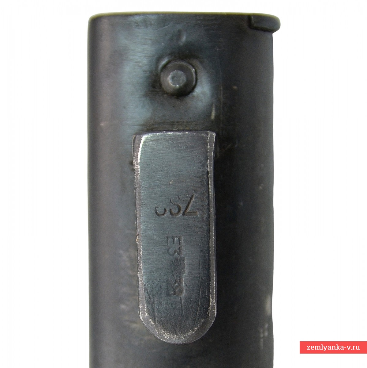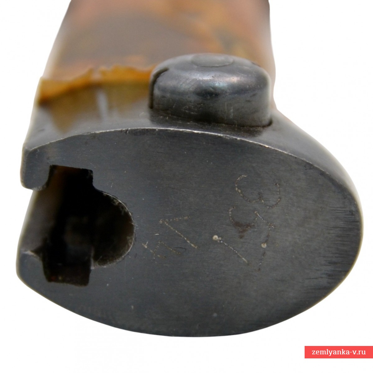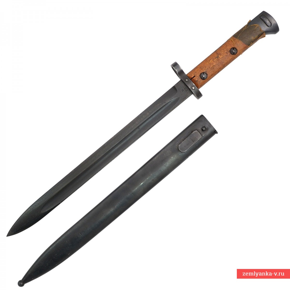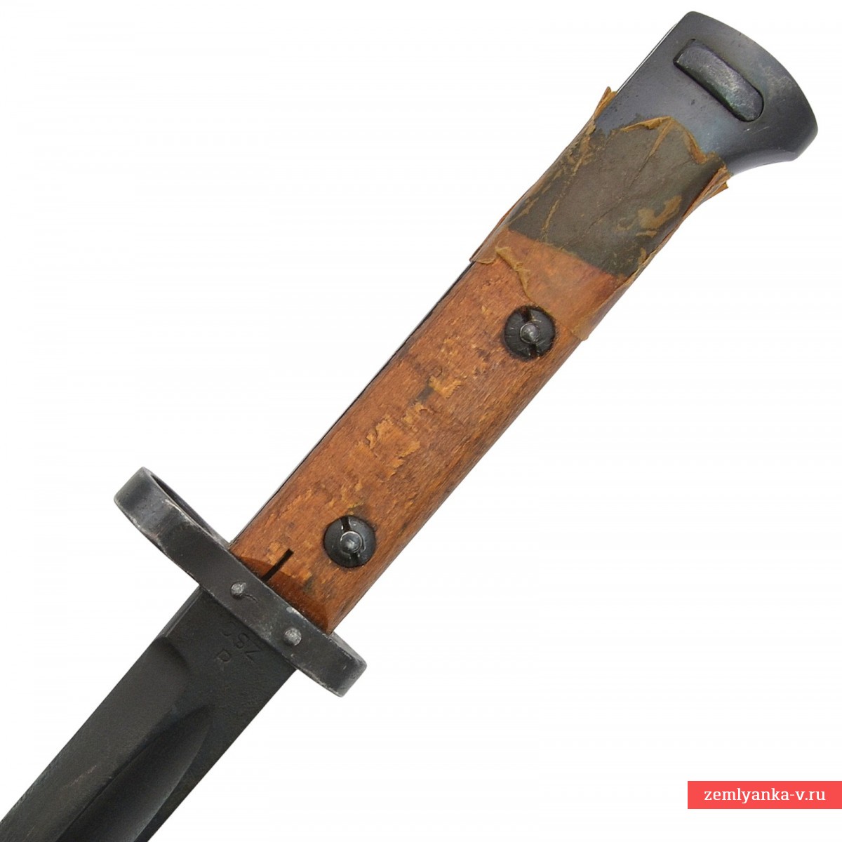 Оригинальный штык в складском состоянии. Гарантия оригинальности. Клинок стальной, прямой, однолезвийный, с одним долом с обеих сторон, воронёный. Рукоять образована двумя деревянными щечками, скреплёнными с хвостовиком двумя винтами. В головке рукояти Т-образный паз и пружинная защёлка с внутренним расположением спиральной пружины. Крестовина прямая с кольцом для ствола со стороны лезвия клинка. На крестовине видны две металлические заклёпки. Ножны стальные, со стальным прибором, состоящим из вставного устья, шпенька и шарика на конце.