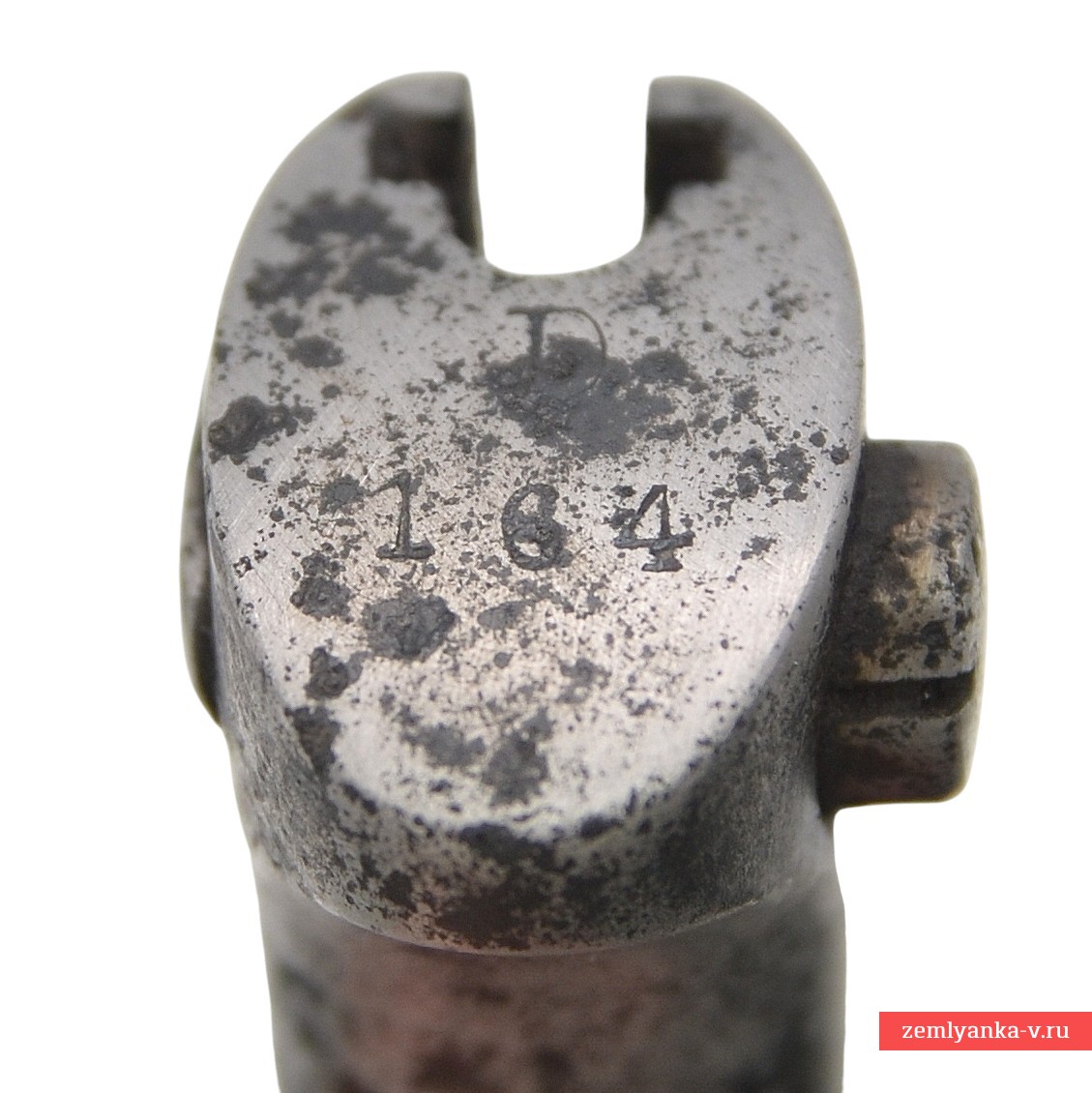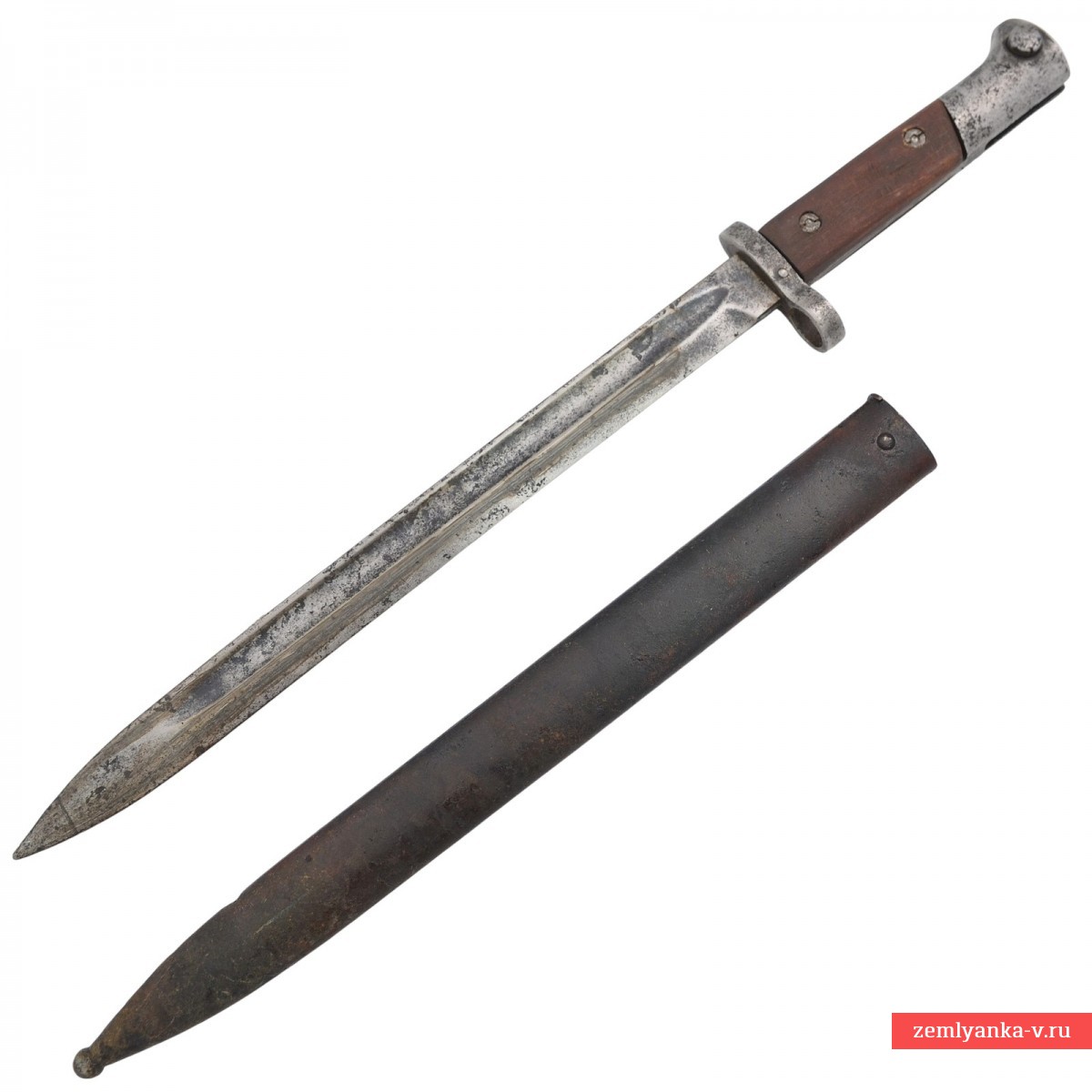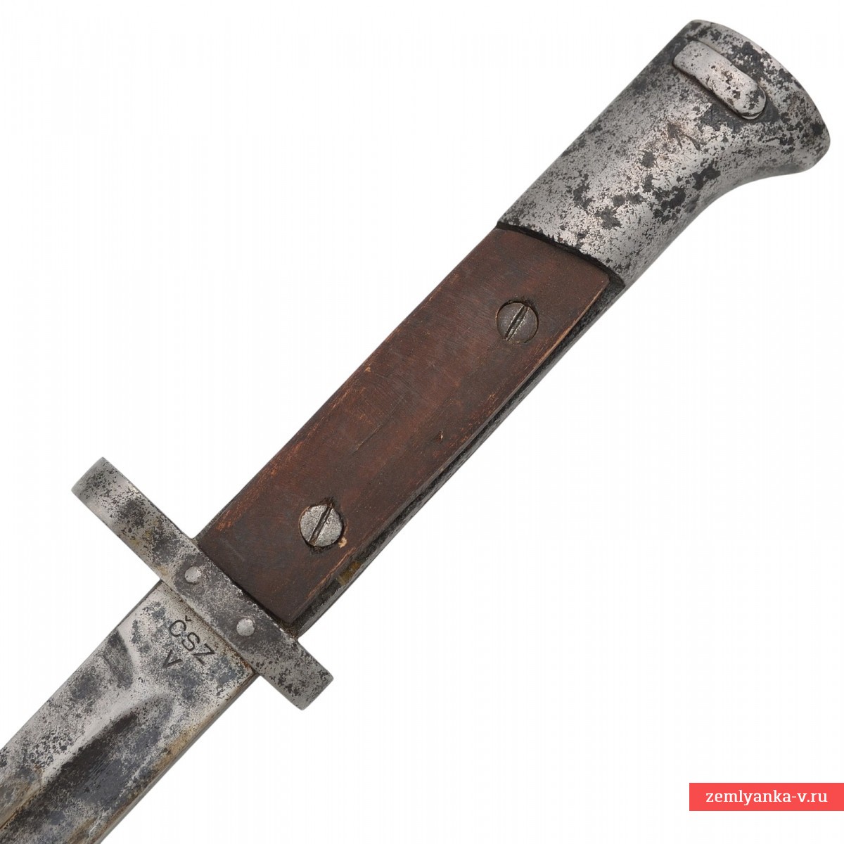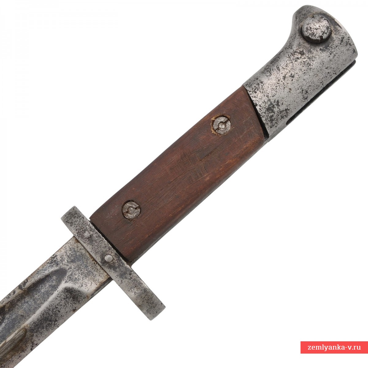Клинок стальной, прямой, однолезвийный, с одним долом с обеих сторон. Рукоять образована двумя деревянными щечками, скреплёнными с хвостовиком двумя винтами. В головке рукояти Т-образный паз и пружинная защёлка с внутренним расположением спиральной пружины. Крестовина прямая с кольцом для ствола со стороны лезвия клинка. На крестовине видны две металлические заклёпки. Ножны стальные, со стальным прибором, состоящим из вставного устья, шпенька и шарика на конце.
