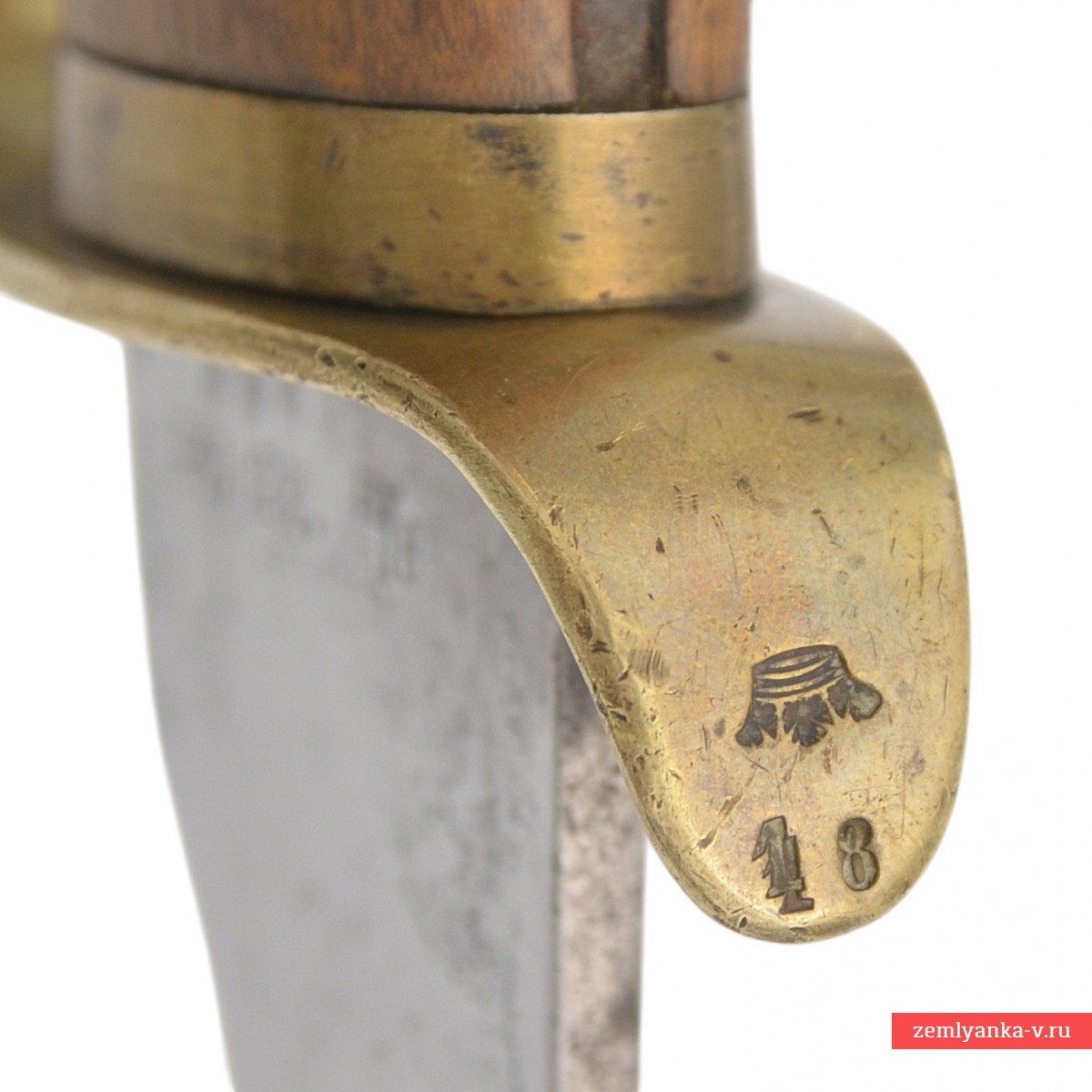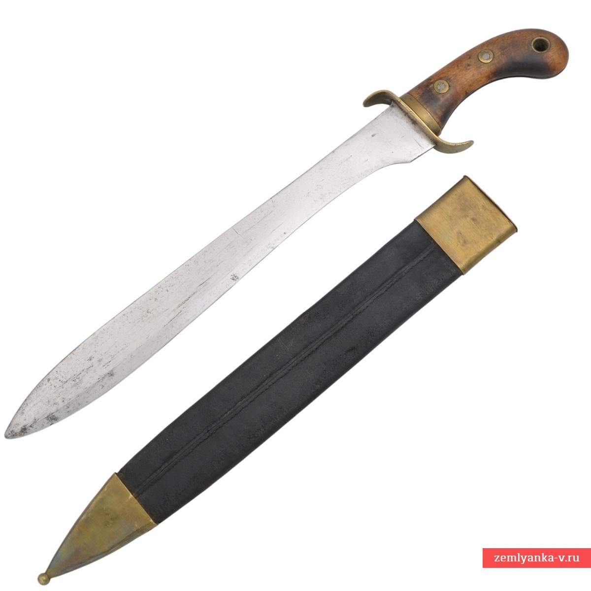 Оригинальный тесак (faskinkniv m/1848) в неплохом состоянии. Изначально модель предназначалась для пехотных пионеров (саперов), но позже её использование распространилось на береговую и морскую артиллерию, а также на некоторые подразделения полиции. На клинках часто встречаются клейма в виде якоря, что указывает на использование на флоте. Клинок стальной, прямой, однолезвийный, плоский, без долов, с сужением в средней части и расширением в нижней трети. Эфес состоит из рукояти и латунной крестовины. Рукоять деревянная, изогнутая. Рукоять крепится при помощи двух заклёпок, в навершии имеется отверстие. У основания рукояти располагается латунная втулка. Крестовина короткая, плоская с загнутыми в разные стороны концами. Ножны кожаные с латунным прибором, состоящим из устья с неподвижной скобой и наконечника с шариком.