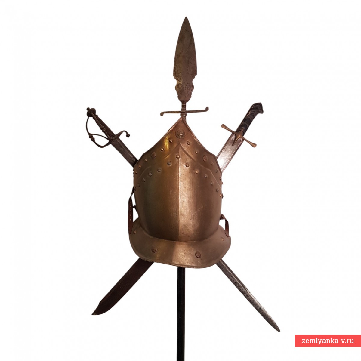 Достаточно интересная и достаточно легкая кираса в хорошем состоянии. Латунь, ковка. По нашему мнению, кираса изготовлена в XIX веке для декорирования интерьеров, прекрасно будет смотреться с перекрещенными саблями и шпагами на стене (пример оформления на последнем фото). Гарантия подлинности.