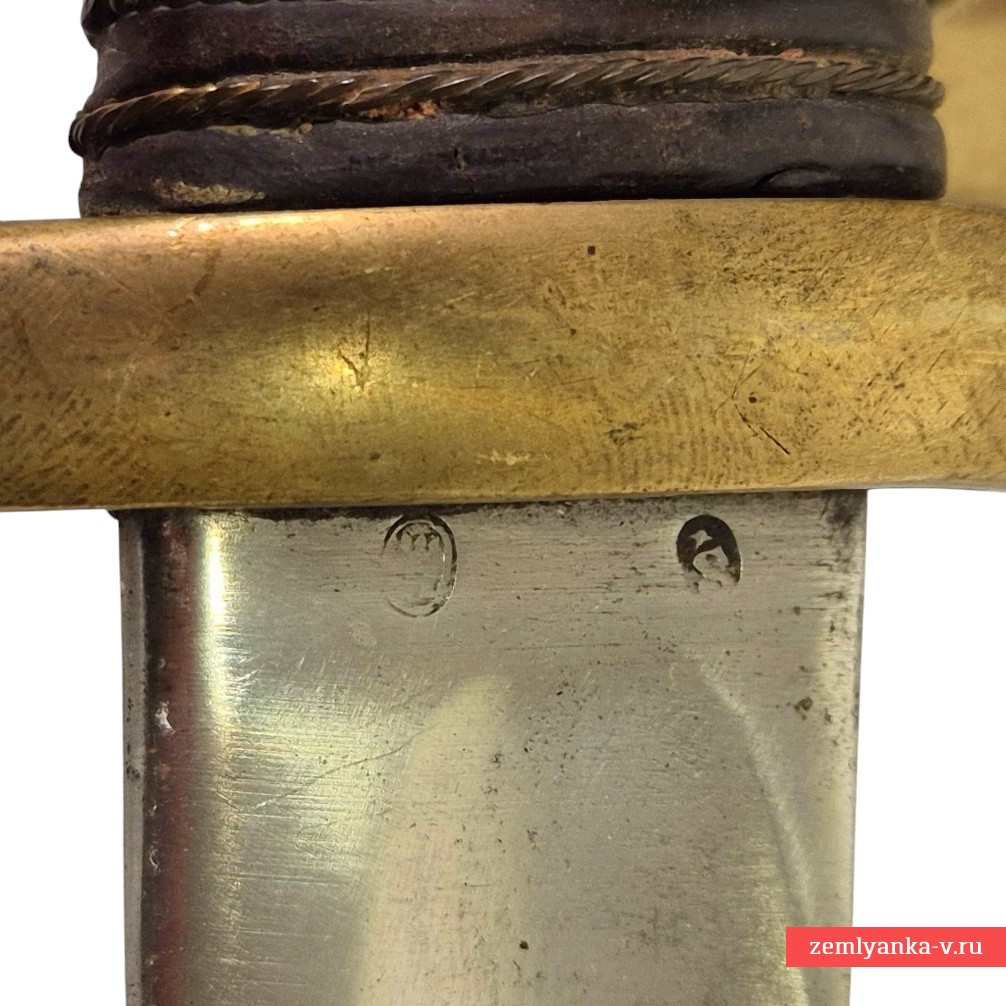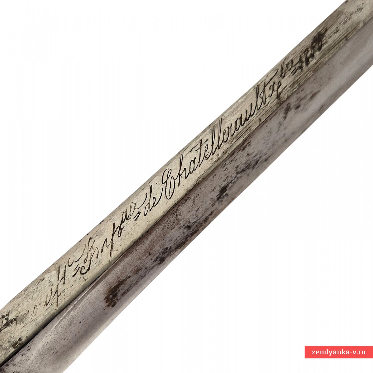 Клинок стальной, изогнутый, однолезвийный, с одним широким долом с обеих сторон, боевой конец двулезвийный. На обухе клинка иглой нанесена травлёная надпись «Manuf’re Imp.ale de Chattelerault Х’bre 1855» ( «Имперская мануфактура Шательро октябрь 1855 года», франц.). На пяте клинка ряд инспекторских клейм.
