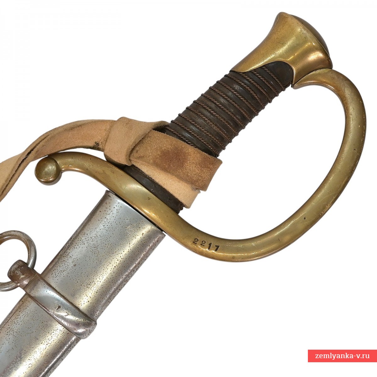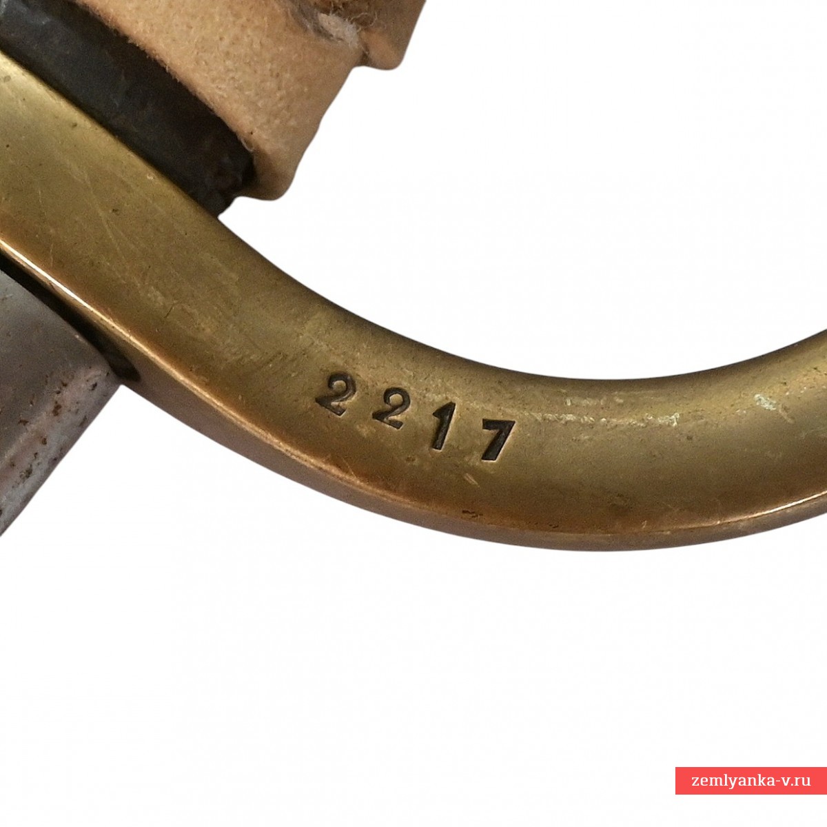 Эфес состоит из рукояти и гарды. Рукоять деревянная, обтянутая кожей, по поперечным желобкам перевита кручёной латунной проволокой. Навершие латунное, овальной формы, сверху расклёпан хвостовик. Гарда латунная с одной защитной дужкой, которая плавно переходит в крестовину. Дальний конец крестовины округлый и загнут по направлению к обуху клинка. На дужке гарды пробит номер оружия 2217. Гарда укомплектована оригинальным кожаным темляком.