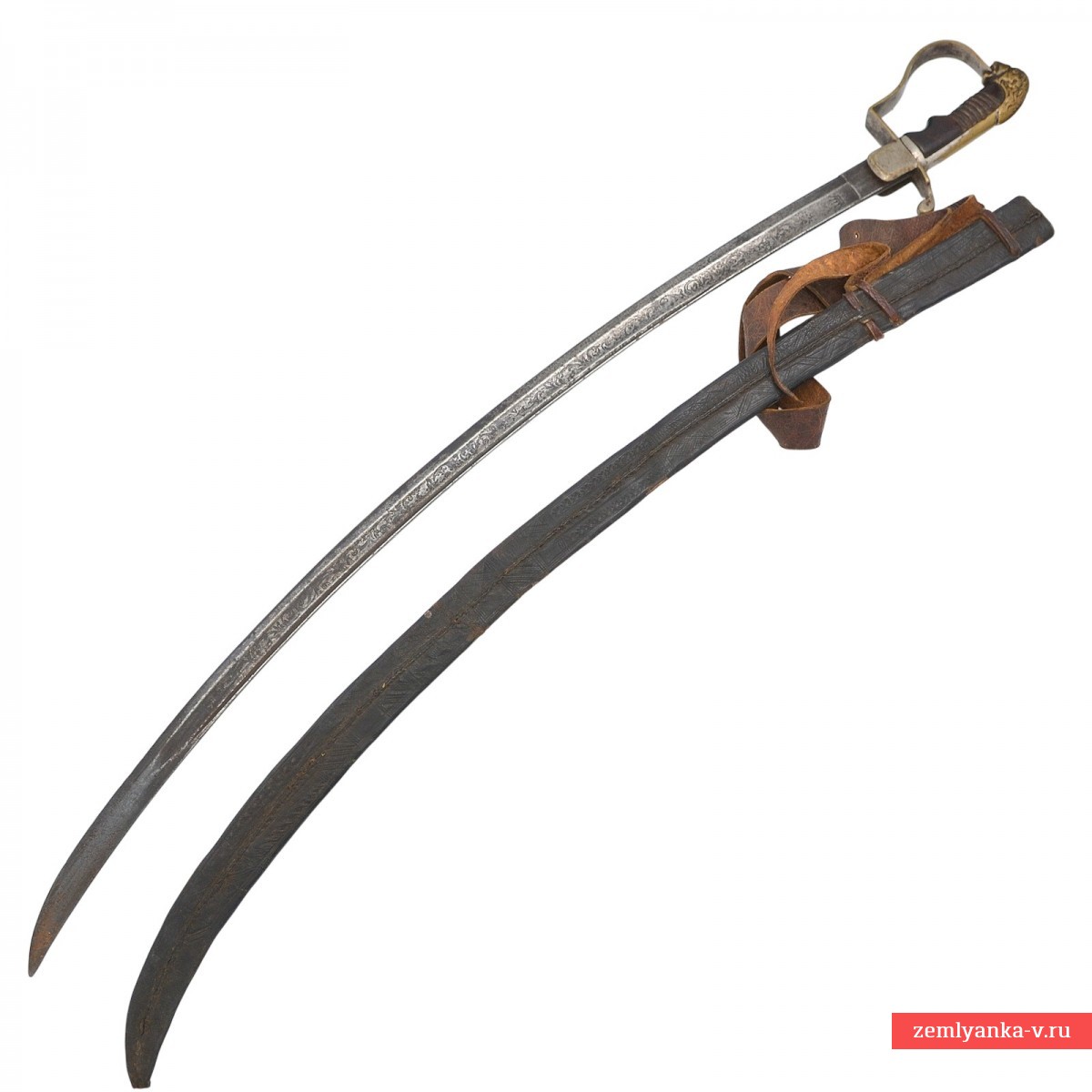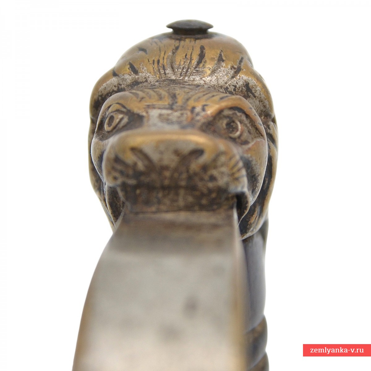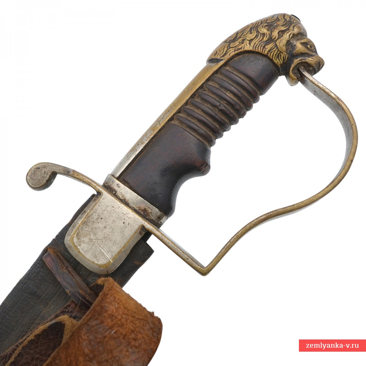 Эфес «блюхеровского» типа, состоит из рукояти и гарды. Рукоять деревянная, с поперечными желобками и выемкой у основания. У основания рукояти расположена металлическая втулка. Спинка рукояти сплошная, латунная. В центре спинки рукояти имеется декоративное расширение полуовальной формы. Головка рукояти выполнена в виде головы льва с гривой. Гарда металлическая, с одной защитной дужкой, переходящей под прямым углом в крестовину рукояти, дальний конец которой загнут вниз по направлению к обуху клинка. Дальний конец крестовины фигурный, выполнен в виде головы льва (?). Все металлические детали эфеса латунные, посеребрённые. Ножны кожаные, комплектуются ремешком.