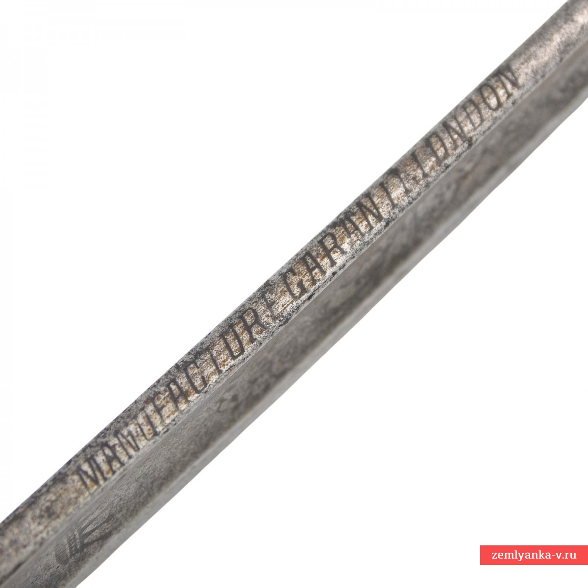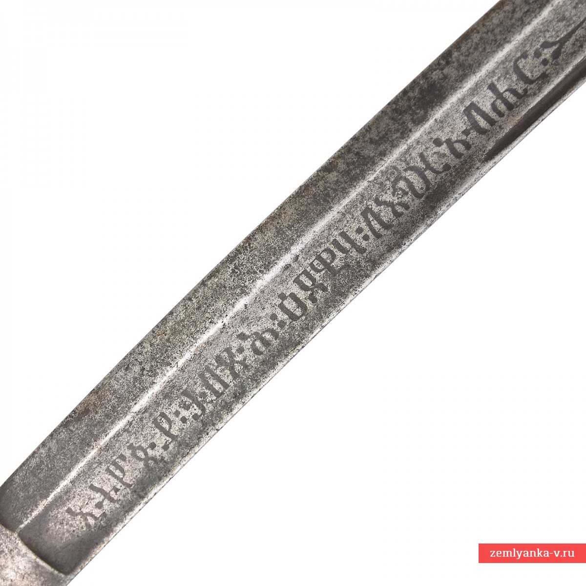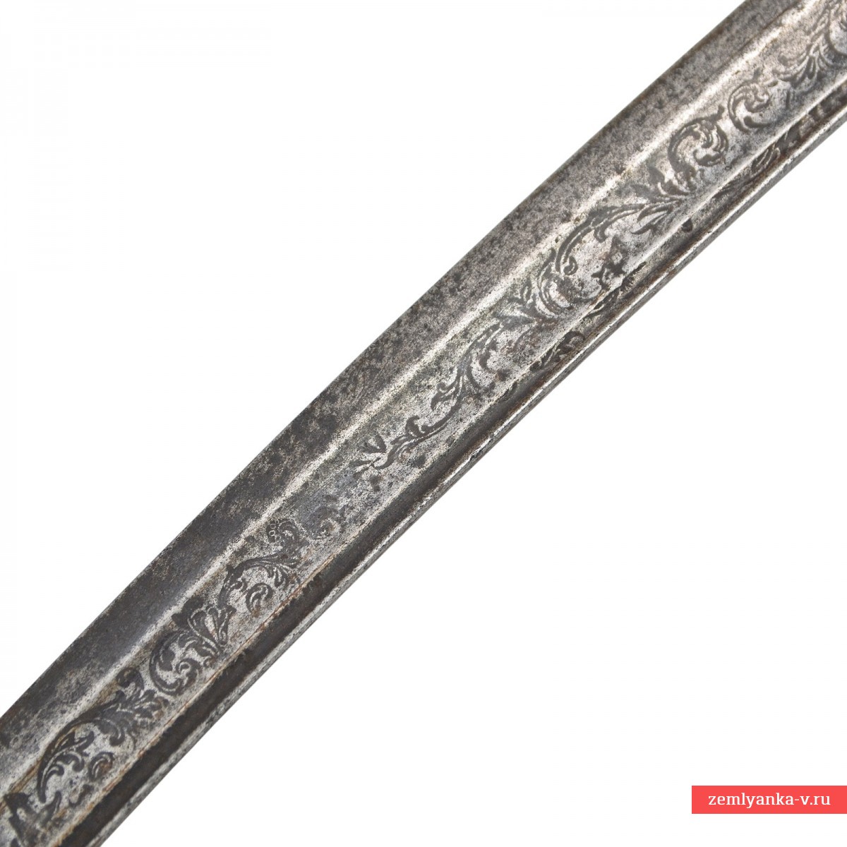 Эфес «блюхеровского» типа, состоит из рукояти и гарды. Рукоять деревянная, с поперечными желобками и выемкой у основания. У основания рукояти расположена металлическая втулка. Спинка рукояти сплошная, латунная. В центре спинки рукояти имеется декоративное расширение полуовальной формы. Головка рукояти выполнена в виде головы льва с гривой. Гарда металлическая, с одной защитной дужкой, переходящей под прямым углом в крестовину рукояти, дальний конец которой загнут вниз по направлению к обуху клинка. Дальний конец крестовины фигурный, выполнен в виде головы льва (?). Все металлические детали эфеса латунные, посеребрённые. Ножны кожаные, комплектуются ремешком.