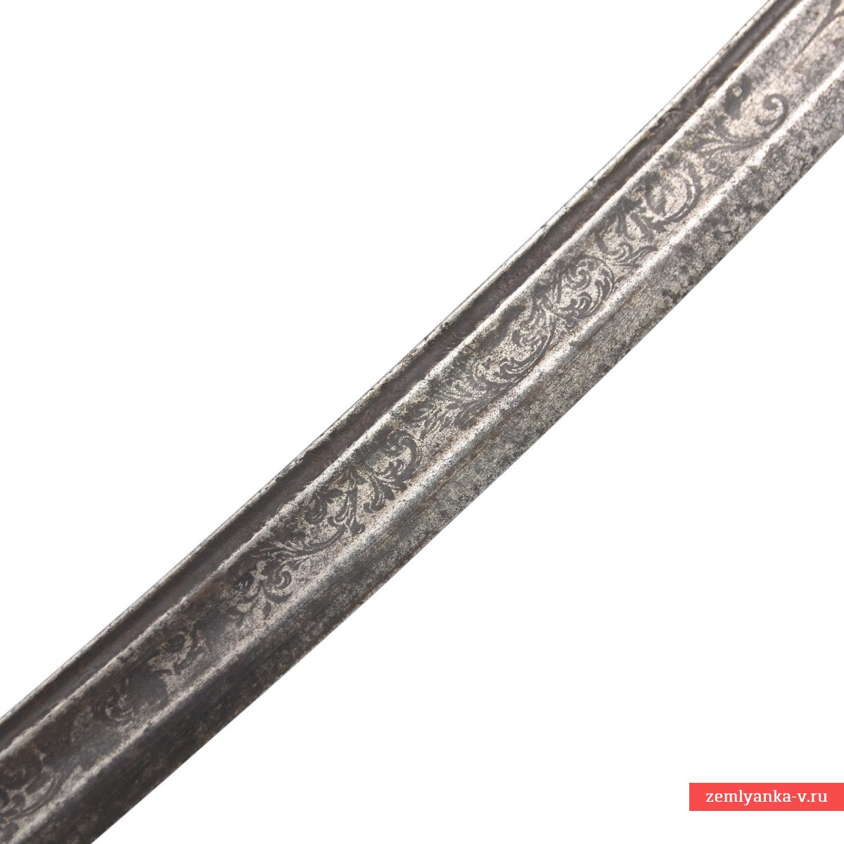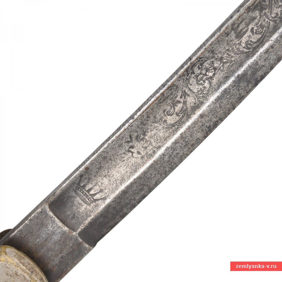 Клинок стальной, изогнутый, однолезвийный, с одним узким долом вдоль обуха и одним широким на ⅔ длины. Полотно клинка в центре по обеим голоменям украшено растительными композициями, а также (на одной голомени) надписью в картуше, предположительно, на амхарском языке. На противоположной голомени, ближе к основанию клинка, нанесено изображение графской короны. На пяте клинка справа нанесено изображение иудейского льва и надпись «DE…». На обухе клинка нанесена надпись «MANUFACTURE GARANI LONDON» -клеймо производителя.