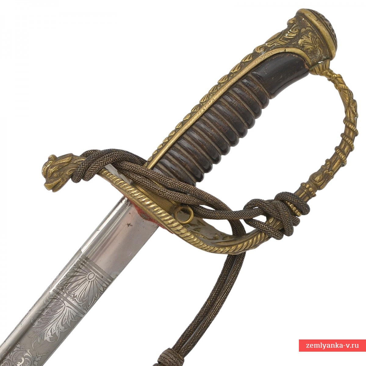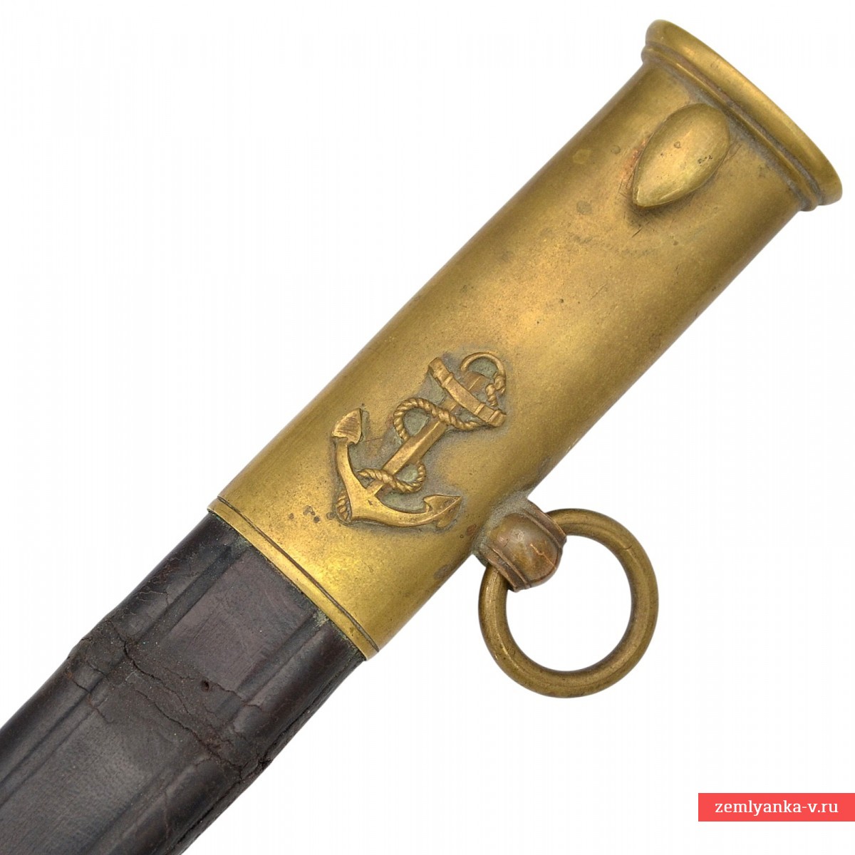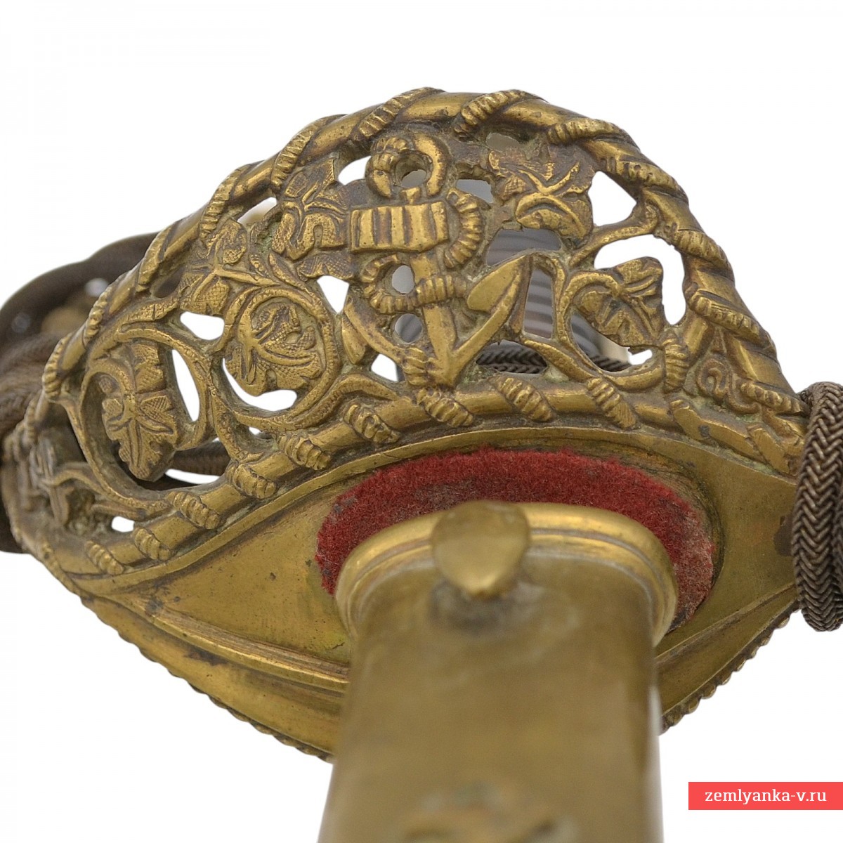 Оригинальная сабля в хорошем коллекционном состоянии. Клинок стальной, незначительно изогнутый, однолезвийный, никелированный, с ребром по обуху, боевой конец двулезвийный, с елманью. Эфес состоит из рукояти и гарды. Рукоять из чёрного дерева, с поперечными желобками. Спинка рукояти длинная, украшена рельефным пояском из гребешков Сен-Жака, расположенным на листьях аканта возле головки, затем простой резьбой, в то время как кайма имеет чешуйчатый орнамент. Головка рукояти выпуклая с листьями, расположенными в виде лучей. Дужка гарды в верхней части имеет отверстие, позволяющее пропустить темляк, канавки идут до среднего кольца, от него отходит дополнительная дужка, окаймляющая щиток. Чашка чеканная ажурными листьями аканта. В осевой части расположен якорь с якорной цепью. Конец крестовины короткий, загнутый и оканчивается головой морского змея. Ножны кожаные, с латунным прибором, состоящим из устья, обоймицы, двух колец для портупеи и наконечника с ассиметричным башмаком. На коже ножен около устья и наконечника следы старого ремонта. На устье расположено рельефное изображение якоря и якорной цепи. В комплекте оригинальный темляк.