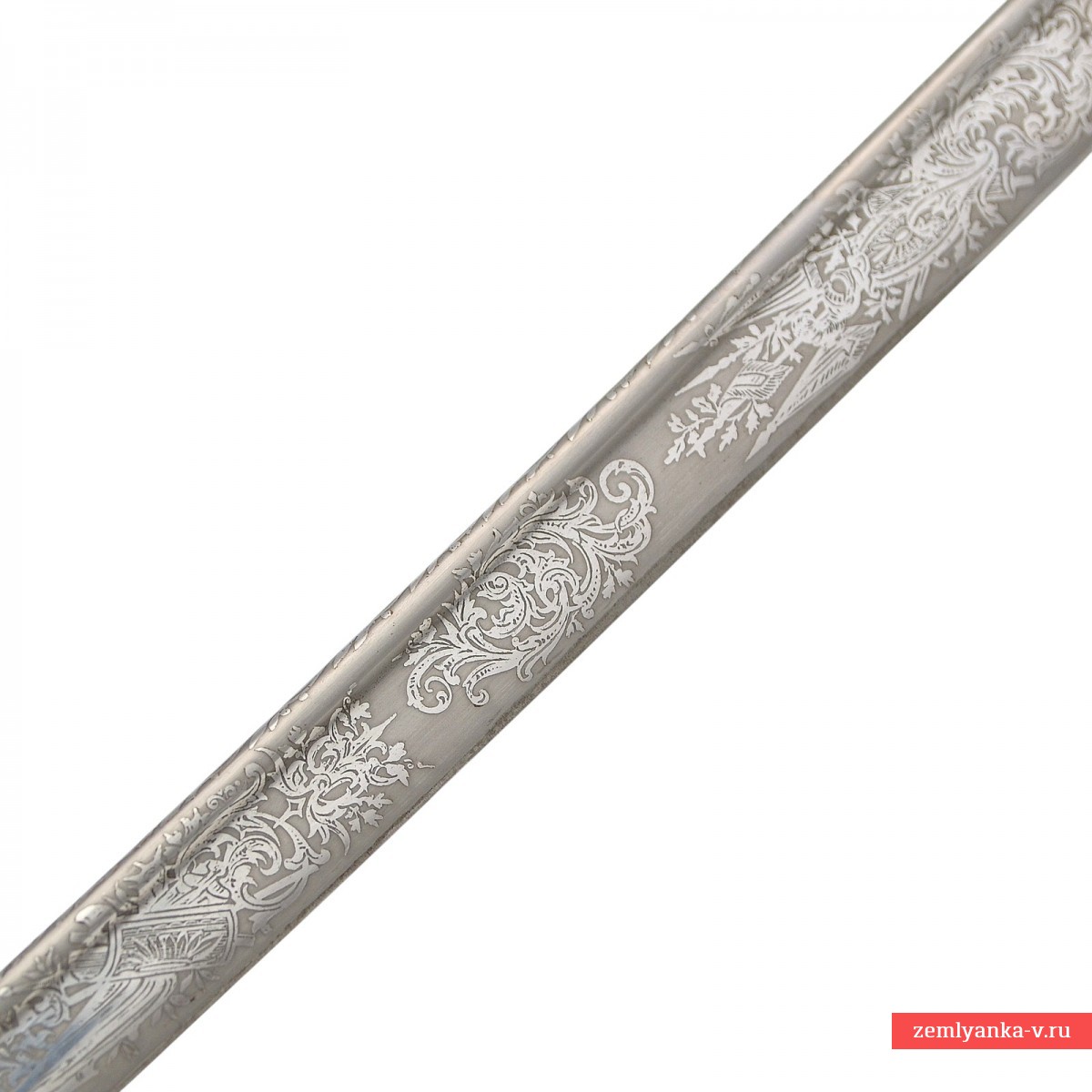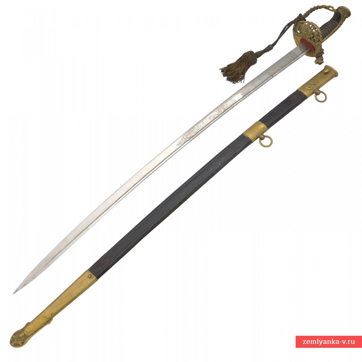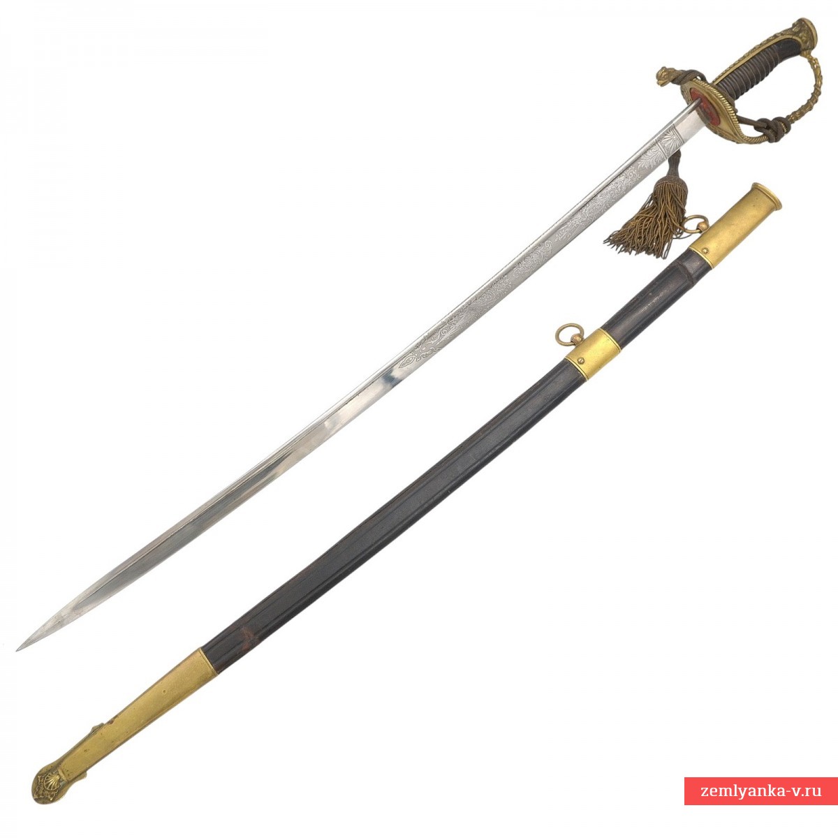 Оригинальная сабля в хорошем коллекционном состоянии. Клинок стальной, незначительно изогнутый, однолезвийный, никелированный, с ребром по обуху, боевой конец двулезвийный, с елманью. Эфес состоит из рукояти и гарды. Рукоять из чёрного дерева, с поперечными желобками. Спинка рукояти длинная, украшена рельефным пояском из гребешков Сен-Жака, расположенным на листьях аканта возле головки, затем простой резьбой, в то время как кайма имеет чешуйчатый орнамент. Головка рукояти выпуклая с листьями, расположенными в виде лучей. Дужка гарды в верхней части имеет отверстие, позволяющее пропустить темляк, канавки идут до среднего кольца, от него отходит дополнительная дужка, окаймляющая щиток. Чашка чеканная ажурными листьями аканта. В осевой части расположен якорь с якорной цепью. Конец крестовины короткий, загнутый и оканчивается головой морского змея. Ножны кожаные, с латунным прибором, состоящим из устья, обоймицы, двух колец для портупеи и наконечника с ассиметричным башмаком. На коже ножен около устья и наконечника следы старого ремонта. На устье расположено рельефное изображение якоря и якорной цепи. В комплекте оригинальный темляк.