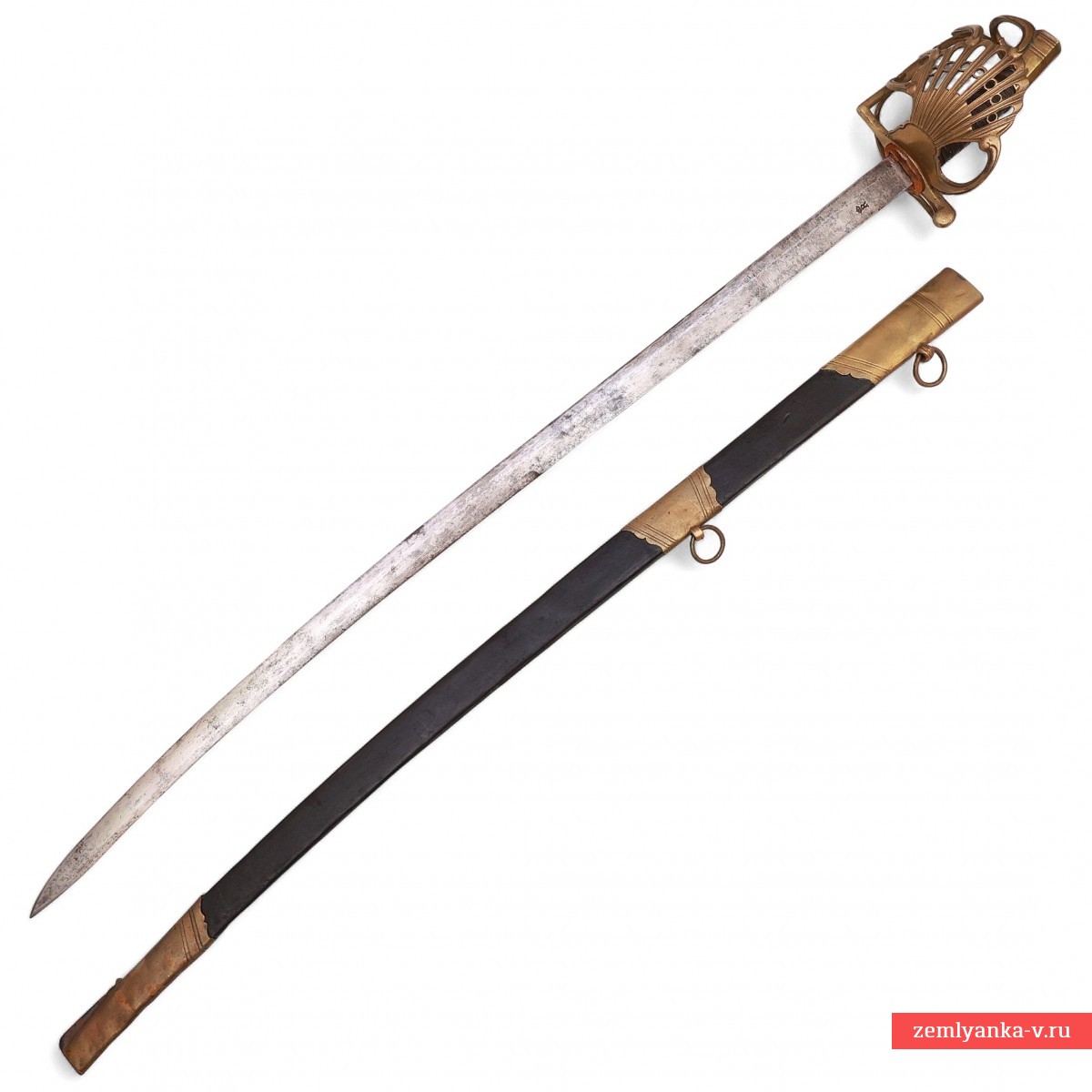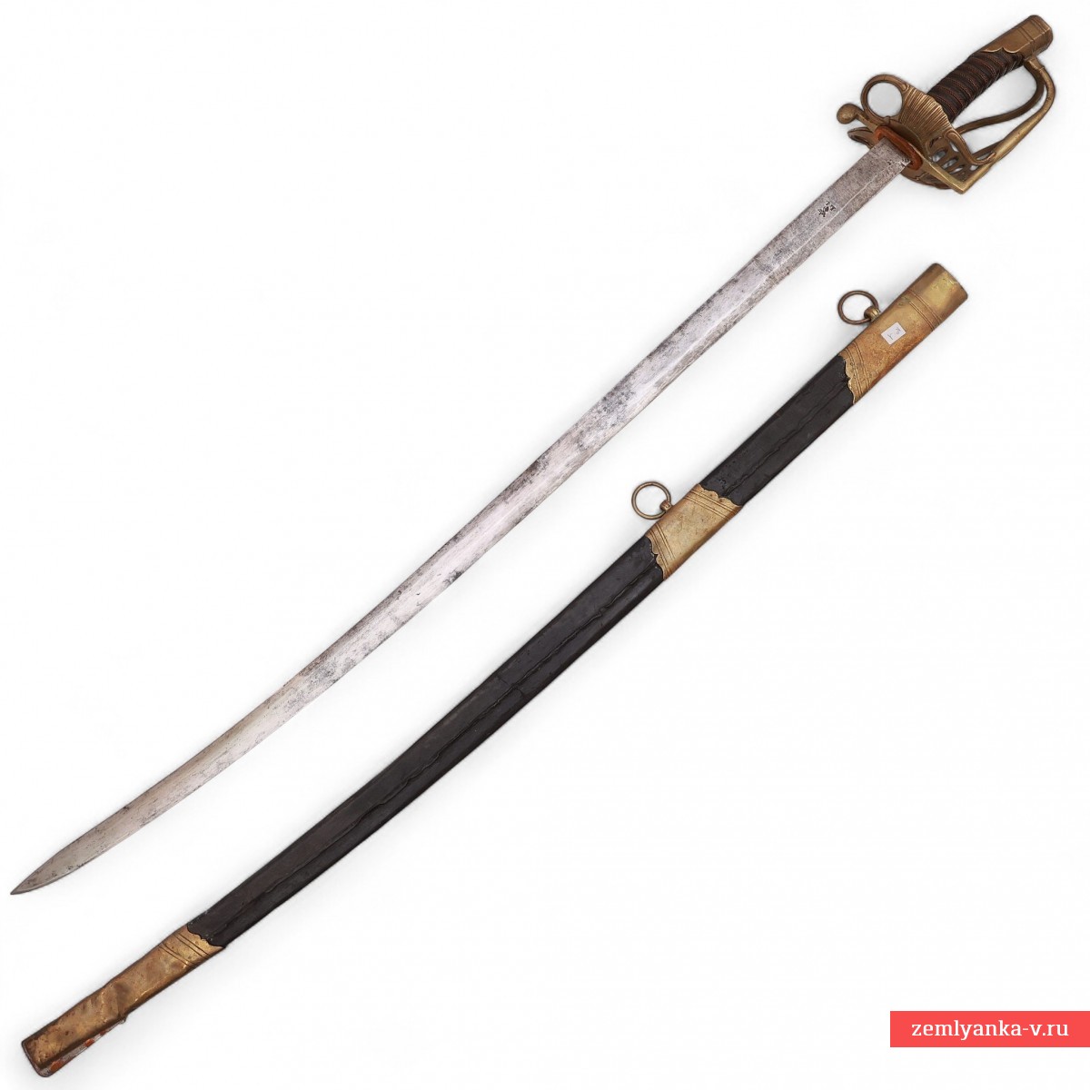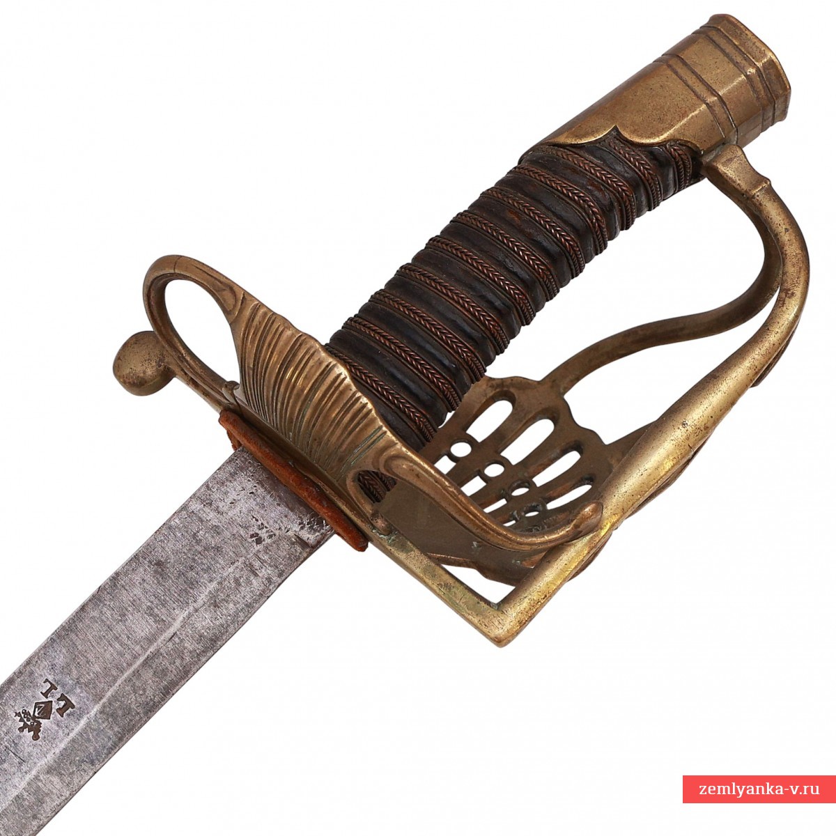 Клинок стальной, незначительно изогнутый, однолезвийный, с одним долом с обеих сторон. На основании клинка справа нанесено штампованное инспекторское клеймо справа «R» под короной. На основании клинка слева нанесено клеймо производителя (?) в виде ромба под короной и двух литер «L». Эфес состоит из рукояти и гарды. Рукоять деревянная, обтянутая кожей со спиральными желобками, по которым обмотана кручёной медной проволокой. У основания расположена гладкая латунная втулка. Навершие прямоугольное в сечении с фигурной кромкой; сверху расклёпан хвостовик клинка. Гарда с одной основной защитной дужкой, которая плавно переходит в широкую крестовину. От основной дужки в правую сторону отходят четыре дополнительных дужек, образуя широкую чашку гарды, выполненную в виде морской раковины (т. н. ажурный щиток Сэн-Жака). От основной дужки в левую сторону отходит одна дополнительная дужка, также образуя небольшую чашку в виде морской раковины. Ножны кожаные с латунным прибором, состоящим из устья, обоймицы, двух подвижных колец для ремней портупеи и наконечника с асимметричным башмаком. Края прибора ножен фигурные.