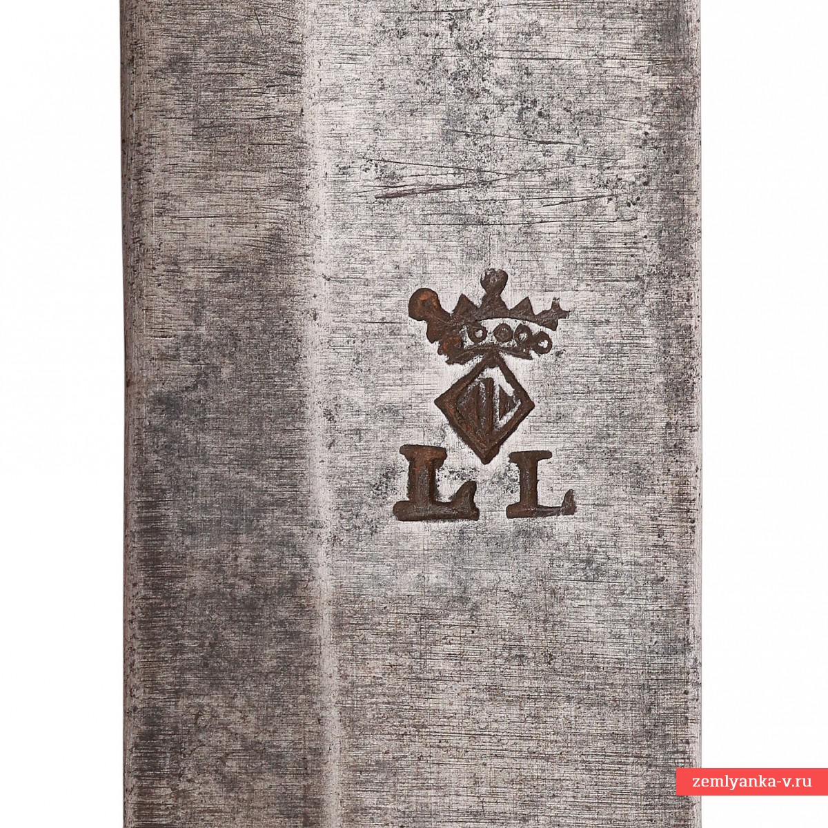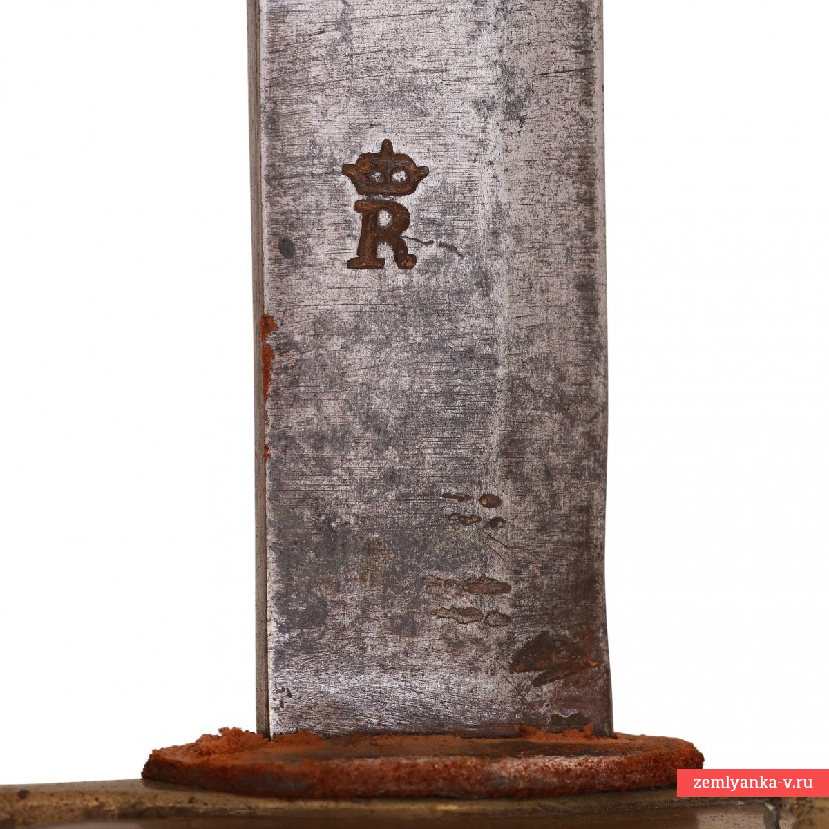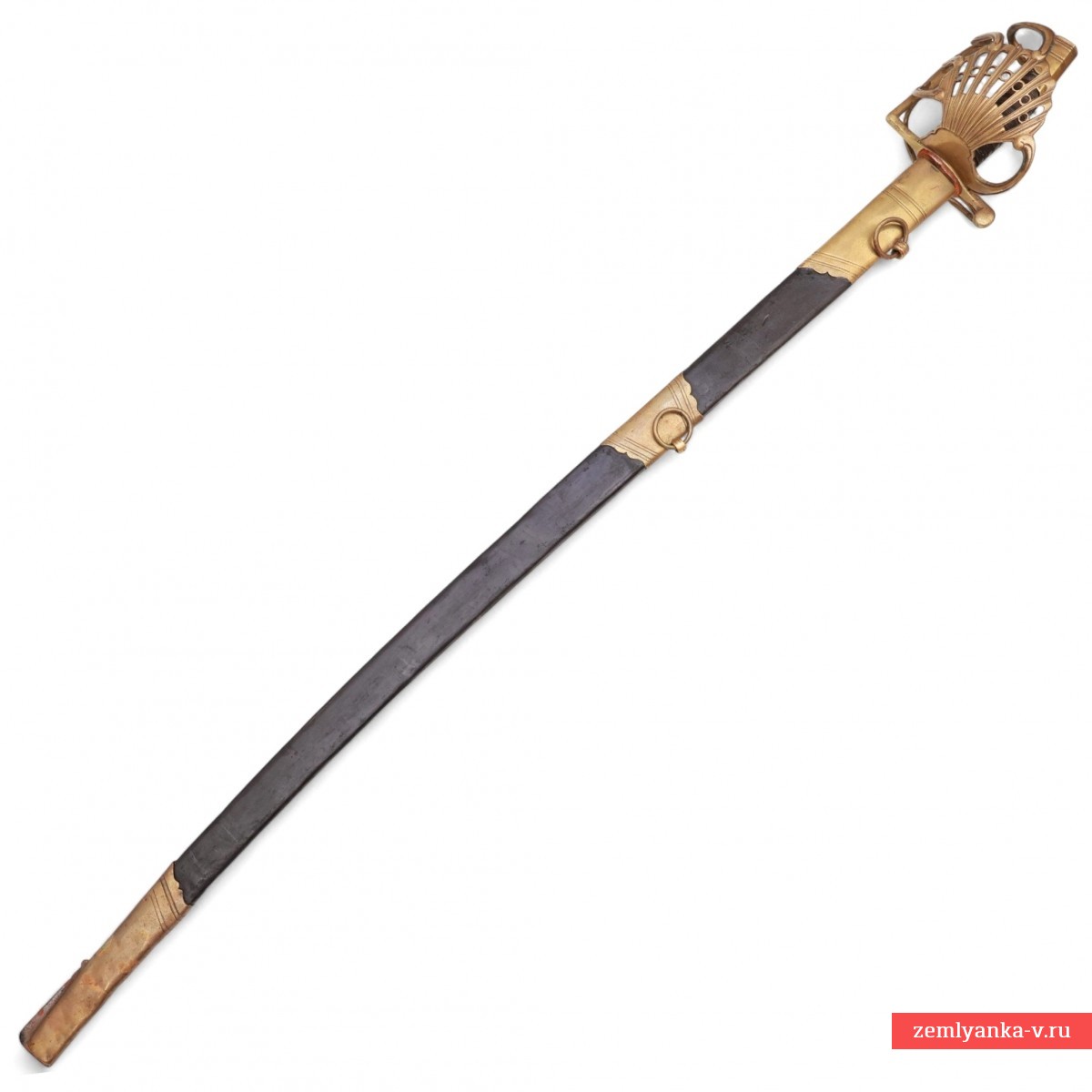 Клинок стальной, незначительно изогнутый, однолезвийный, с одним долом с обеих сторон. На основании клинка справа нанесено штампованное инспекторское клеймо справа «R» под короной. На основании клинка слева нанесено клеймо производителя (?) в виде ромба под короной и двух литер «L». Эфес состоит из рукояти и гарды. Рукоять деревянная, обтянутая кожей со спиральными желобками, по которым обмотана кручёной медной проволокой. У основания расположена гладкая латунная втулка. Навершие прямоугольное в сечении с фигурной кромкой; сверху расклёпан хвостовик клинка. Гарда с одной основной защитной дужкой, которая плавно переходит в широкую крестовину. От основной дужки в правую сторону отходят четыре дополнительных дужек, образуя широкую чашку гарды, выполненную в виде морской раковины (т. н. ажурный щиток Сэн-Жака). От основной дужки в левую сторону отходит одна дополнительная дужка, также образуя небольшую чашку в виде морской раковины. Ножны кожаные с латунным прибором, состоящим из устья, обоймицы, двух подвижных колец для ремней портупеи и наконечника с асимметричным башмаком. Края прибора ножен фигурные.