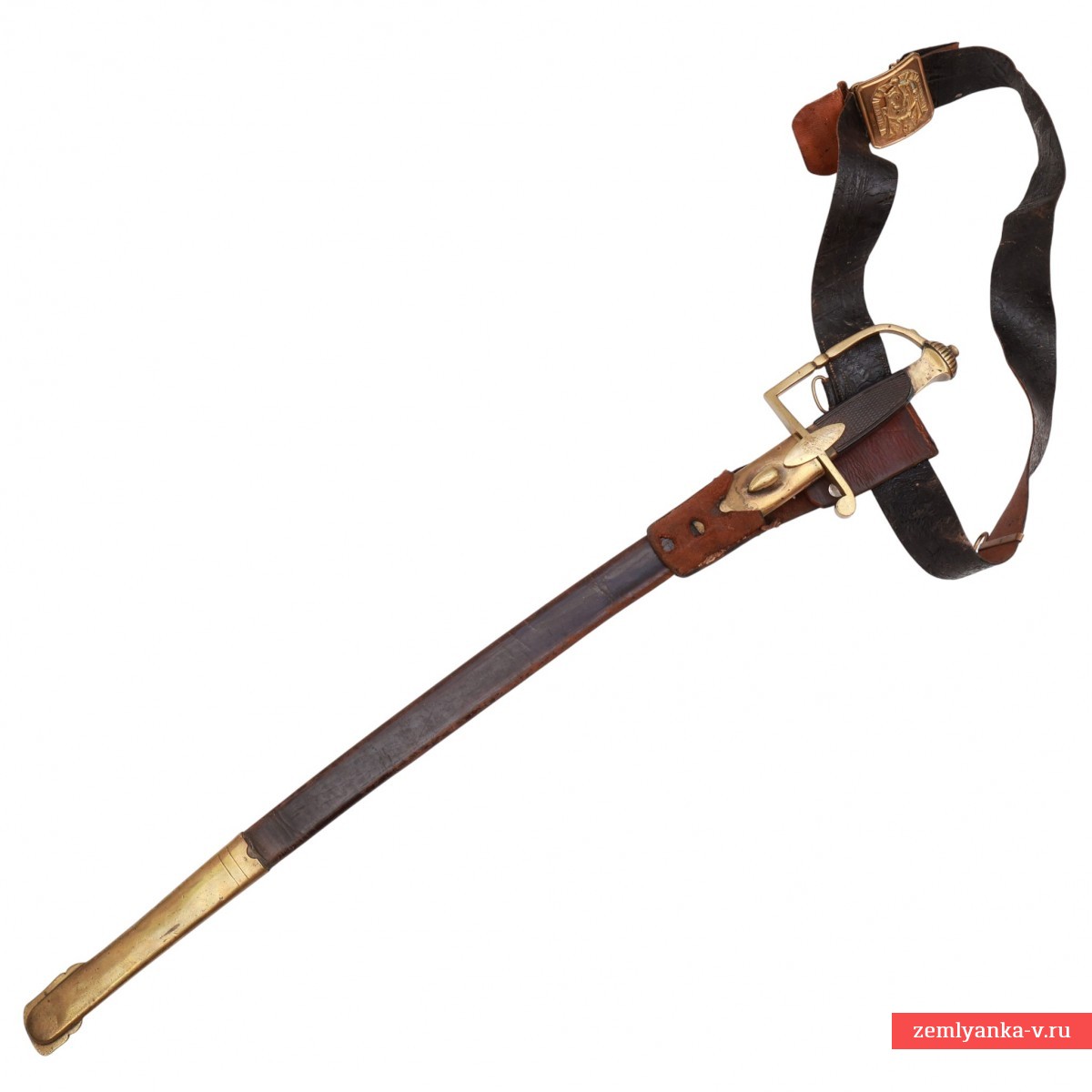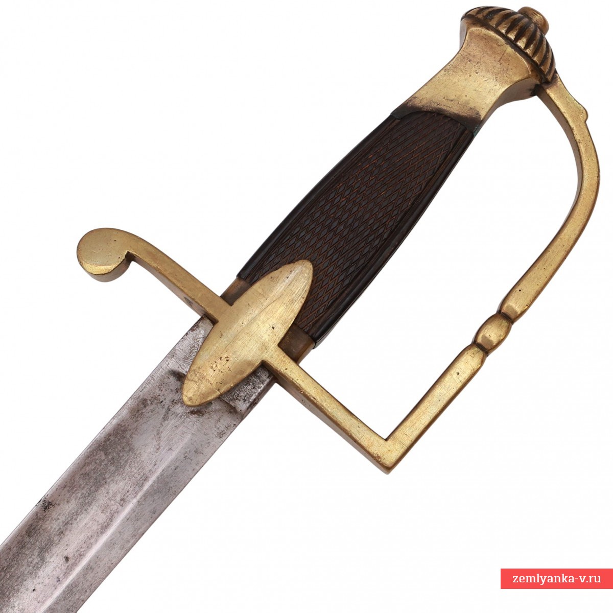 Предмет находится в хорошем коллекционном состоянии. Следы коррозии на клинке. Заломы, потёртости и царапины на коже ножен. Потёртости, царапины и временная патина на латунных деталях эфеса и приборе ножен.