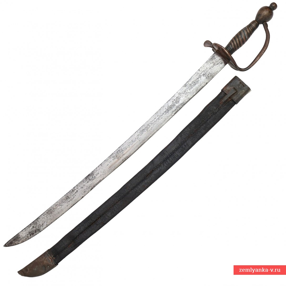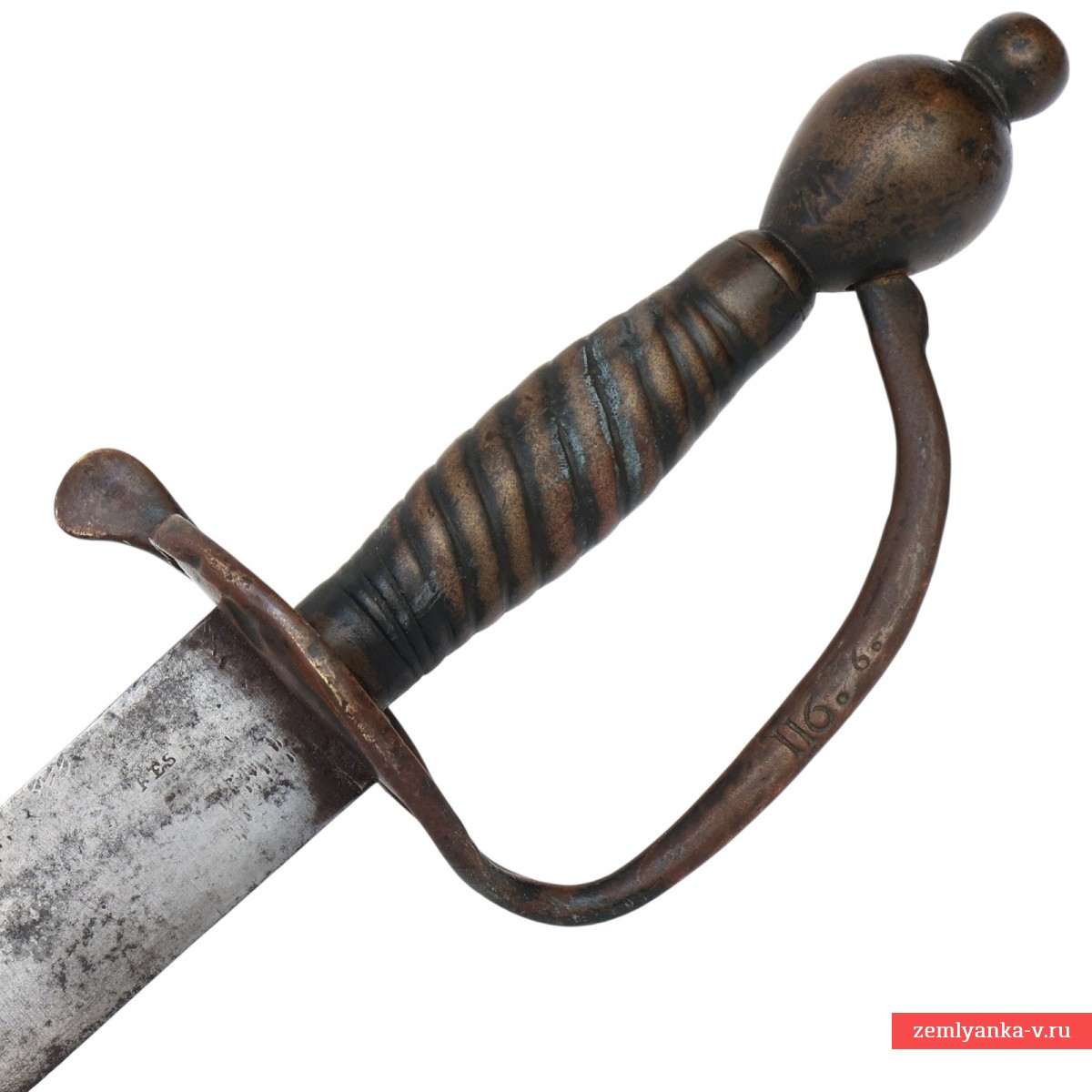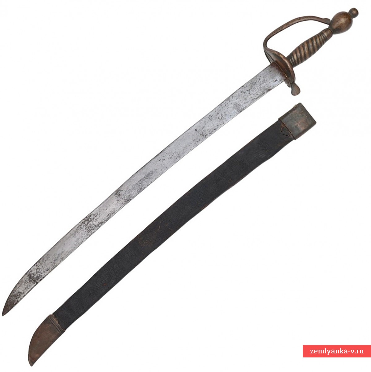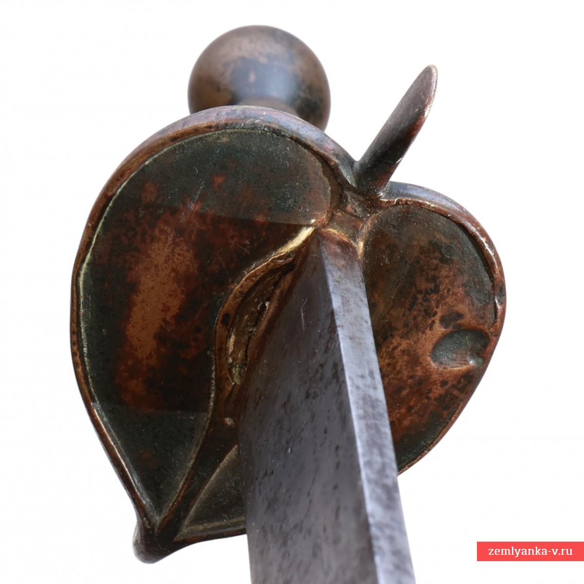 Клинок стальной, незначительно изогнутый, однолезвийный плоский, без долов. Эфес состоит из рукояти и гарды. Рукоять латунная, веретенообразная, со спиралевидными желобками. Навершие шарообразное с конической пуговкой, сверху которой расклёпан хвостовик клинка. Гарда состоит из одной D-образной защитной дужки, которая плавно переходит в крестовину. От крестовины отходят два декоративных симметричных щитика (чашка гарды). Дальний конец крестовины прямой, расплющенный. Ножны кожаные с латунным прибором, состоящим из устья с длинным шпеньком и наконечника с шариком.