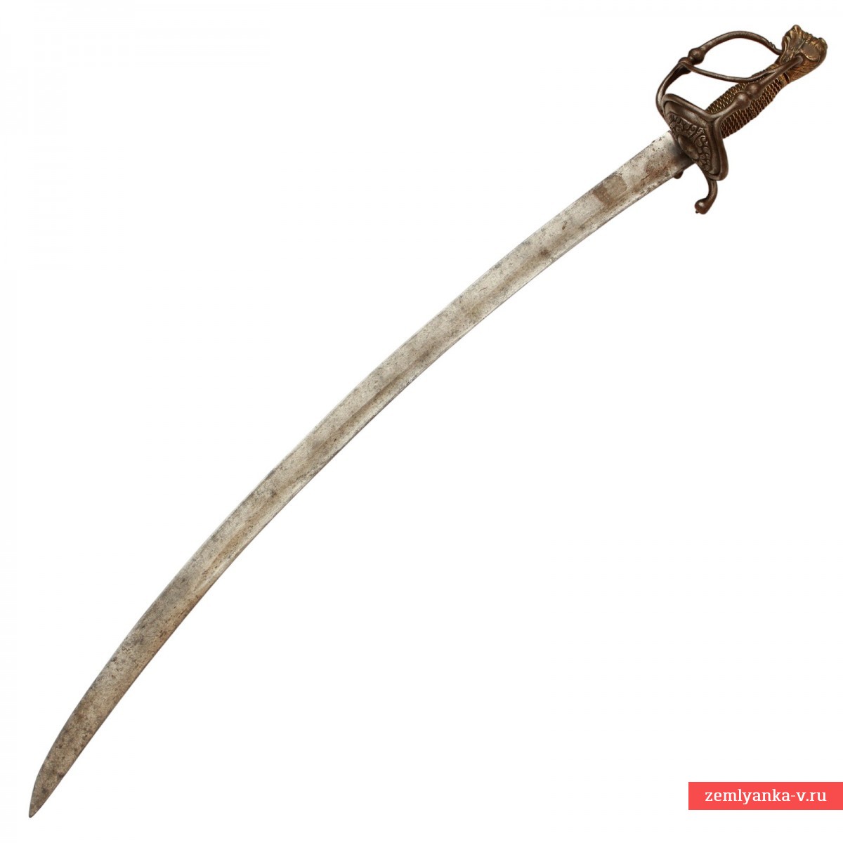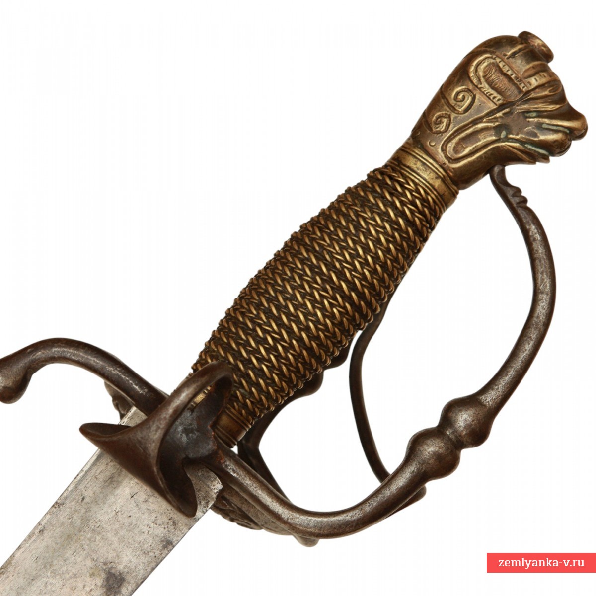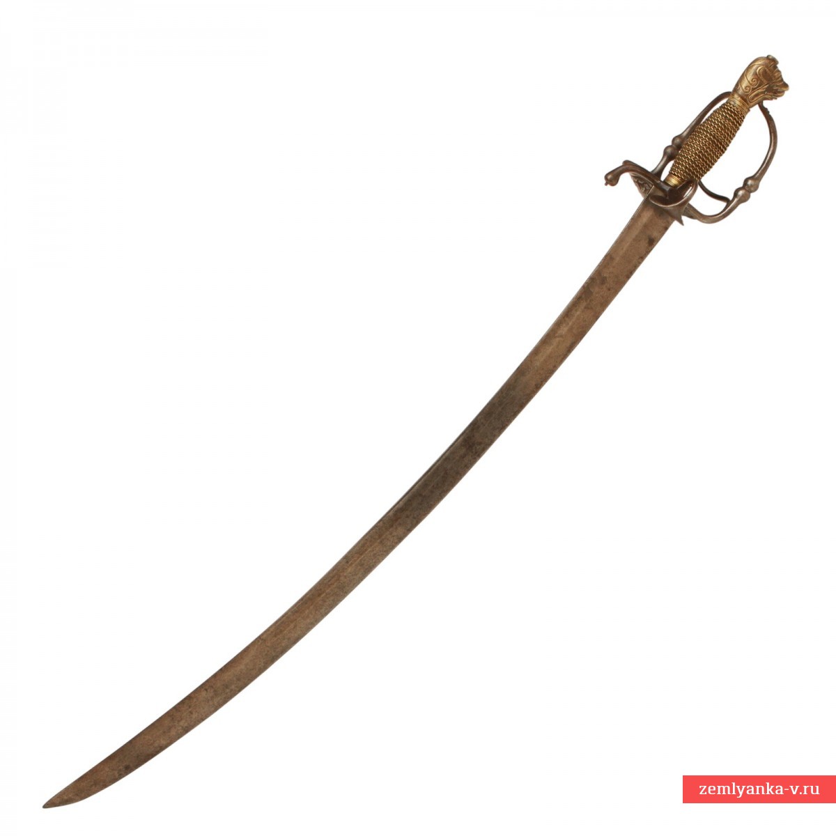 Эфес состот из веретенообразной рукояти, обмотанной витой проволокой из медной сплава желтого цвета, с навершием в виде головы животного (трактовка головы животного на разных образцах наверший швейцарских сабель XVII – начала XVIII вв. несколько отличается, что позволяет их называть, в зависимости от признаков конкретного навершия, либо «львиной головой» (Lowenkopf), либо «собачьей головой» (Hundekopf)). Гарда состоит из двух D-образных дужек – одна из дужек располагается в плоскости лезвия и входит своим концом в отверстие на навершии, вторая отходит от защитной получашки, расположенной справа от лезвия клинка и крепится к навершию при помощи винта. С левой стороны от лезвия на гарде имеется большое стальное кольцо для большого пальца. Щиток гарды справа украшен флоральным орнаментом, доработанным при помощи чеканки. Навершие, отлитое из медного сплава желтого цвета, имеетс вид головы животного, детали изображения доработаны при помощи чеканки. Металл эфеса носит следы бытования – поверхность металла патинирована, имеет мелкие царапины и забоины. Ножны отсутствуют.