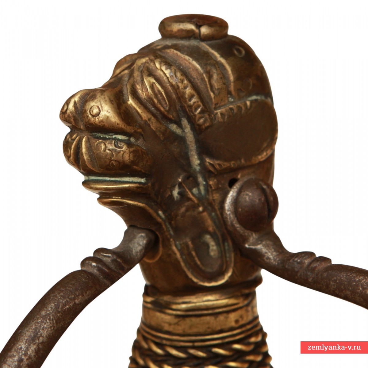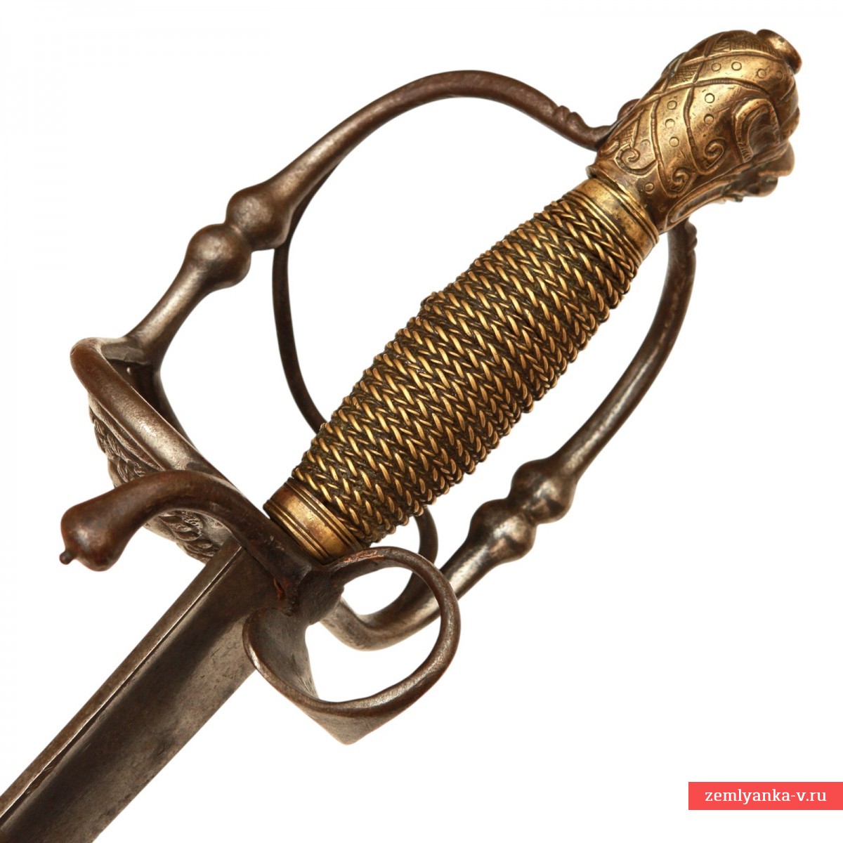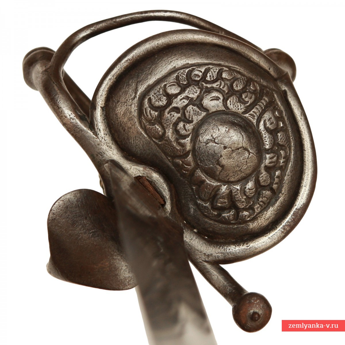 Эфес состот из веретенообразной рукояти, обмотанной витой проволокой из медной сплава желтого цвета, с навершием в виде головы животного (трактовка головы животного на разных образцах наверший швейцарских сабель XVII – начала XVIII вв. несколько отличается, что позволяет их называть, в зависимости от признаков конкретного навершия, либо «львиной головой» (Lowenkopf), либо «собачьей головой» (Hundekopf)). Гарда состоит из двух D-образных дужек – одна из дужек располагается в плоскости лезвия и входит своим концом в отверстие на навершии, вторая отходит от защитной получашки, расположенной справа от лезвия клинка и крепится к навершию при помощи винта. С левой стороны от лезвия на гарде имеется большое стальное кольцо для большого пальца. Щиток гарды справа украшен флоральным орнаментом, доработанным при помощи чеканки. Навершие, отлитое из медного сплава желтого цвета, имеетс вид головы животного, детали изображения доработаны при помощи чеканки. Металл эфеса носит следы бытования – поверхность металла патинирована, имеет мелкие царапины и забоины. Ножны отсутствуют.