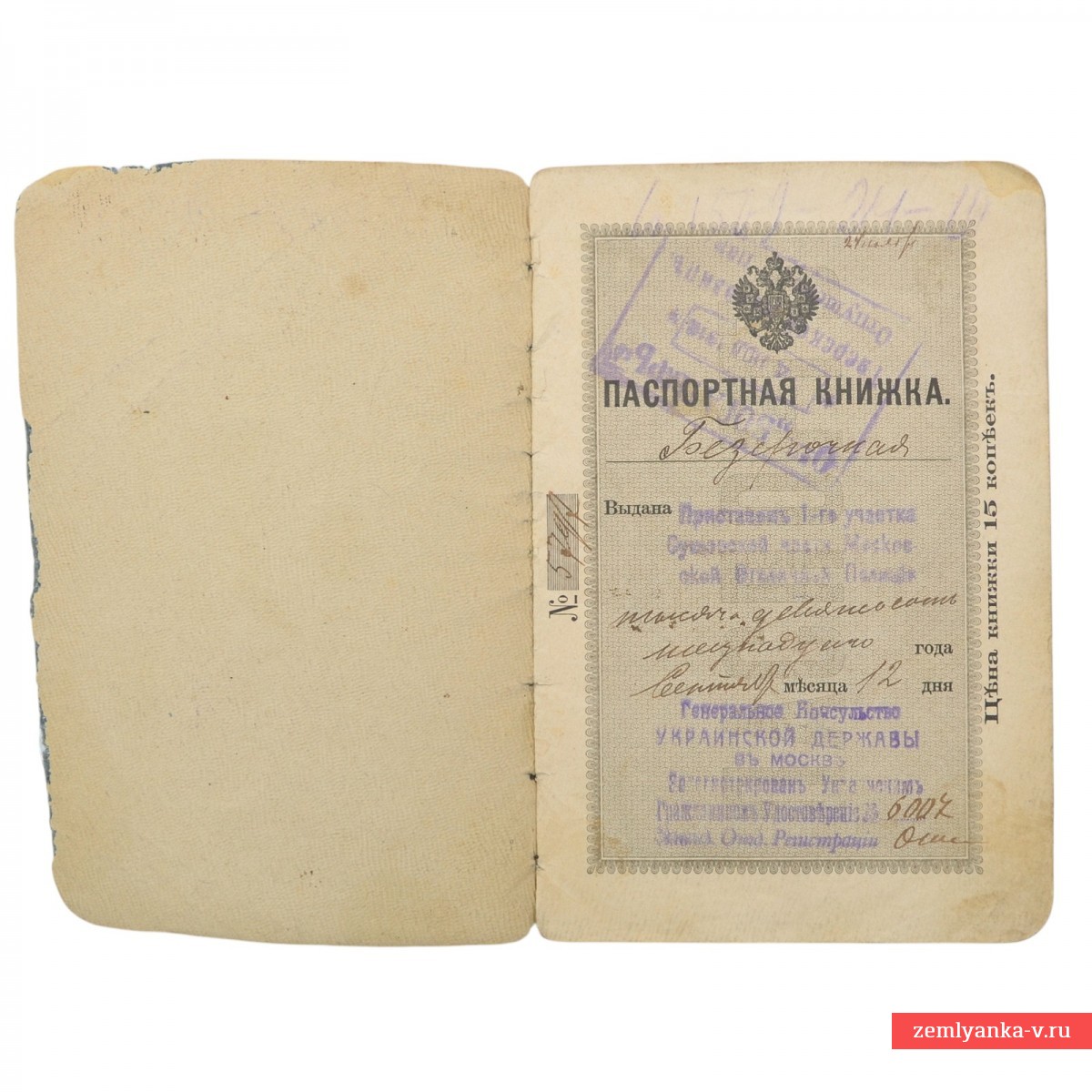 Очень редкий и интересный документ первых лет советской власти, выданный известному художнику и архитектору А.П. Волошенко. На третьей странице штамп Генерального консульства Украинской державы в Москве. Гарантия подлинности.