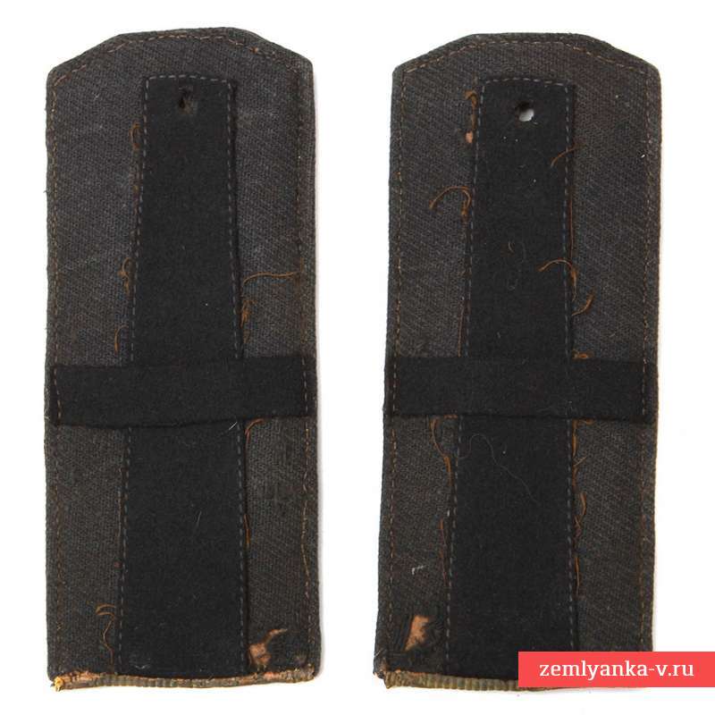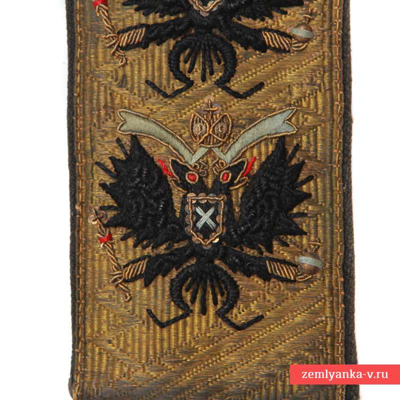 В отличие от генералов, чины которых в старой русской армии обозначались звездочками, для обозначения чинов на погонах адмиралов Российского Императорского флота вышивались черные двуглавые орлы с андреевским крестом в нагрудном щите, увенчанные одной короной с голубой лентой, со скиептром и державой в лапах. Контр-адмиралу полагался один орел, вице-адмиралу – два, адмиралу – три орла. Интересно, что данная система обозначения званий возродилась в 1943 г. в советском Военно-морском флоте и существует поныне, только двуглавые орлы были заменены на звезды. Судя по шестиугольной форме и подбою из черной косонитной ткани, погоны предназначались для сюртука или синего кителя. Оба погона имеют явные следы носки в виде потемнения и потертостей галуна, однако вышивка сохранилась практически нетронутой. О редкости данных погон дает представление то, что к январю 1917 г. во всем Российском Императорском флоте числилось всего 14 вице-адмиралов. Адмиральские знаки различия в наши дни встречаются крайне редко. Судя по некоторым деталям исполнения, погоны изготовлены в 1910-е гг., но нельзя исключать и того, что они могли быть пошиты в эмиграции в период между двумя мировыми войнами.