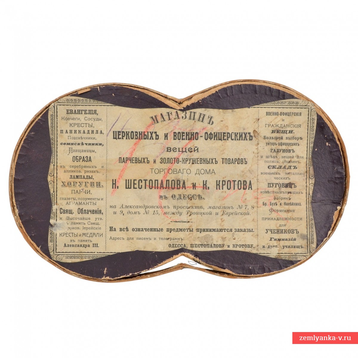 Крайне редкий аксессуар, который практически невозможно найти в продаже сегодня. Оригинальный картонный футляр магазина офицерских вещей Н. Шестопалова и К. Кротова в Одессе. Футляр для обер-офицерских эполет, имеет незначительные повреждения по периметру. Крышка частично отделена от стенок. Гарантия подлинности.