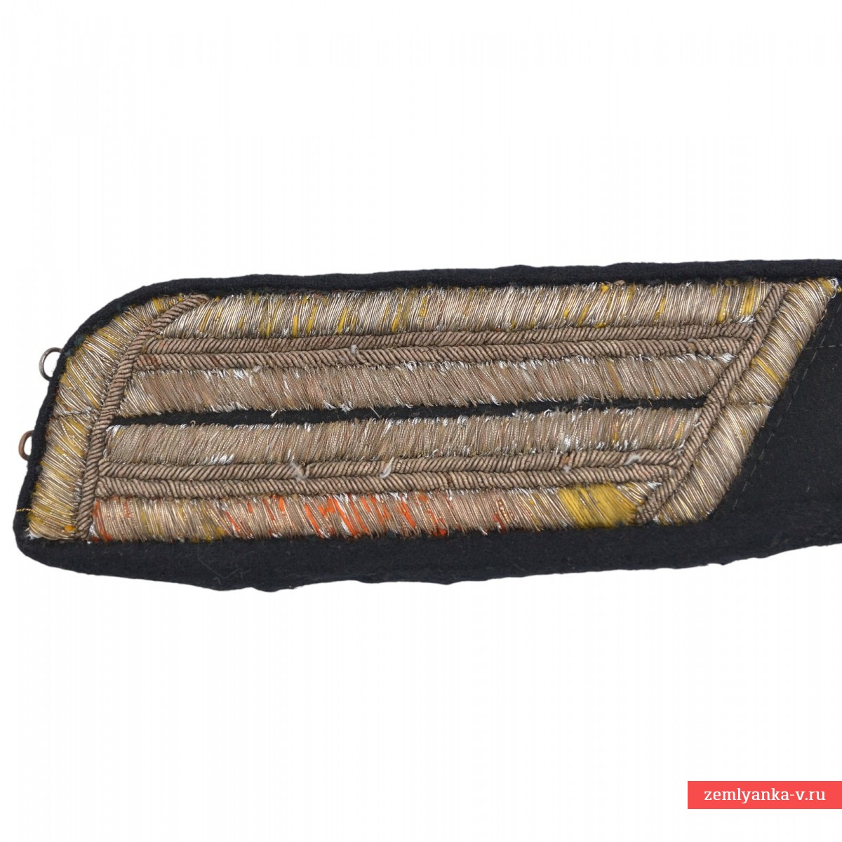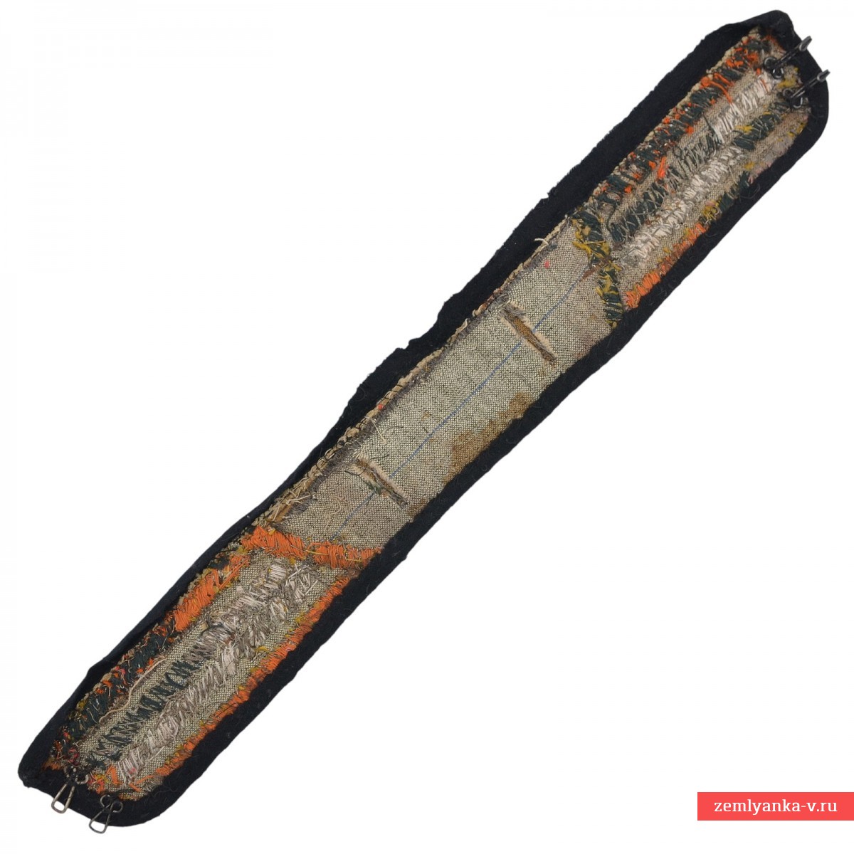 В результате реформы 1907 г. офицерское обмундирование стало более красивым, но при этом ощутимо выросло в цене: канительное шитье стоило гораздо дороже тканого галуна. Для небогатых офицеров фабрики офицерских вещей стали изготавливать петлицы из так называемой низкопробной серебряной канители. Делалась она не на шелковой, а на хлопчатобумажной основе, с весьма тонким золотым покрытием. Последнее оказалось непрочным, и до наших дней такие петлицы сохраняются, как правило, с полностью утраченным золочением, однако желтый цвет нитей основы однозначно указывает на то, что изначально они были золотыми. Петлицы вышивались непосредственно на сукне воротника, но оригинальная основа была полностью утрачена. Чтобы придать таким петлицам коллекционный вид, их принято монтировать на основе из сукна нейтрального цвета – мундирного или черного, как это и сделано в данном случае. Скошенная форма задних откосов петлиц – своего рода щегольство, подражание офицерам гвардии, время от времени встречающееся на предметах армейского обмундирования.