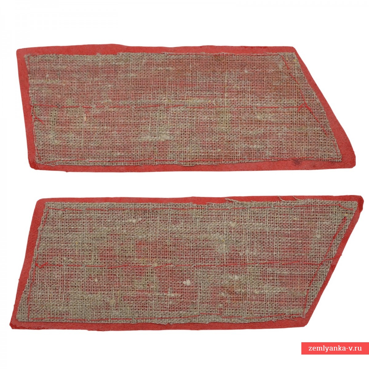 В данном случае мундир, на котором были установлены петлицы, утрачен, однако самую ценную часть его отделки удалось сохранить. Петлицы вышиты серебряной позолоченной канителью, что характерно для второй половины XIX и начала ХХ столетий. Часть позолоты утрачена в процессе бытования, однако остатки покрытия сохранились по краям петлиц и особенно – в торцевых частях (откосах). О том, что петлицы изначально были золотыми, свидетельствует также цвет нити, на которой соткана канитель. Судя по соотношению размеров петлиц, они занимали всю высоту воротника, что типично для петлиц гвардейской легкой кавалерии. Оригинальное алое сукно почти полностью утрачено, но его остатки хорошо видны по краям канители и между петлицами. Чтобы придать предмету коллекционный вид, петлицы смонтированы на суконной основе, цвет которой максимально близок к цвету подлинника, и для жесткости подложены льняным холстом. Исходя из расцветки (красный воротник и золотой металлический прибор), владелец мундира мог служить в Лейб-гвардии Конно-гренадерском или Лейб-гвардии Уланском Ее Величества полку.