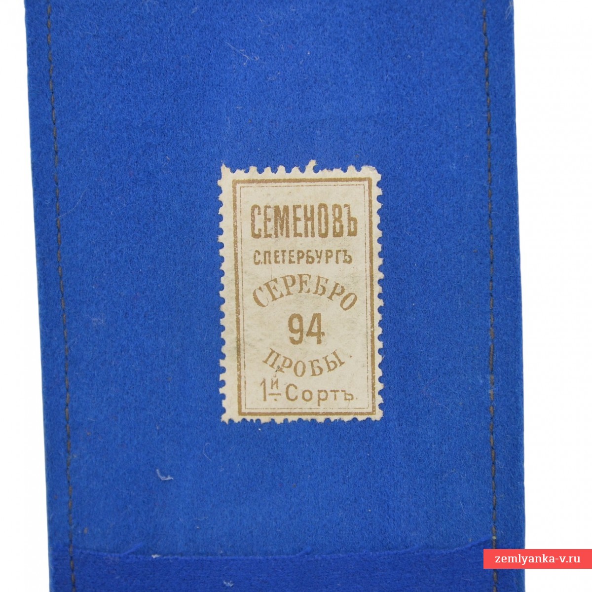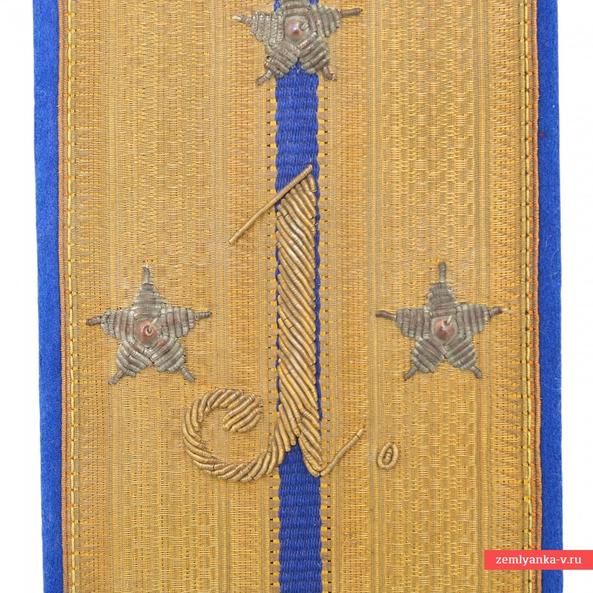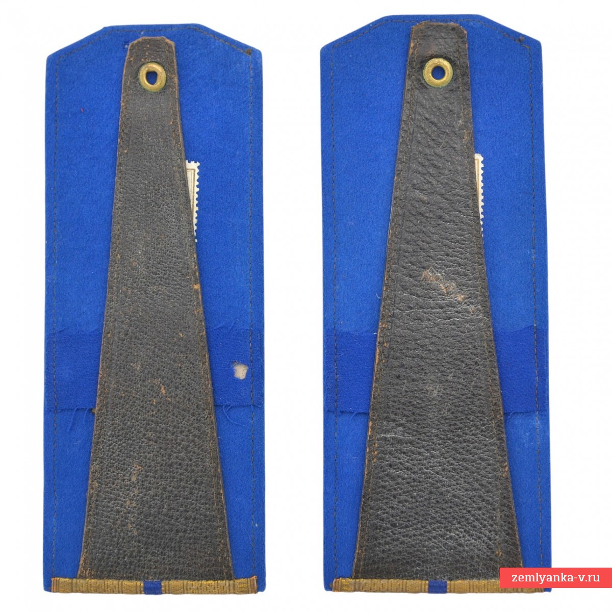 Пара очень редких погон в уникальном неношеном состоянии. С 1874 г. до конца старой русской армии во всей армейской пехоте была установлена расцветка погон и эполет по месту полка в дивизии: первые два полка (первая бригада) каждой дивизии – красный, вторые два (вторая бригада) – светло-синий. В пехоте, в отличие от кавалерии, цифры на офицерских погонах были того же цвета, что и металлический прибор части. До 1909 г. номер на погонах соответствовал номеру пехотной дивизии, с 1909 г. – номеру полка, но 1-й пехотный Невский полк был шефским и имел погоны красные с вензелем короля греческого Георга I. Таким образом, эти погоны принадлежали штабс-капитану, служившему в одном из полков второй бригады 3-й пехотной дивизии – 3-м пехотном Нарвском или 4-м пехотном Копорском (последний в 1902–1913 гг. шефства и вензелей не имел). Высокопробный галун (позолоченное серебро 84-й пробы), прекрасная сохранность. Сохранились оригинальные бумажные бирки производителя. Гарантия подлинности.