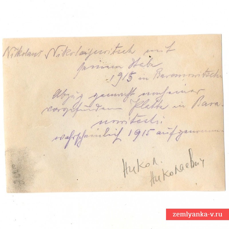 Великий князь Николай Николаевич Младший, до войны командовавший Петербургским военным округом, после начала мировой войны был назначен на пост Верхового Главнокомандующего русской армией, каковой занимал до 23 августа 1915 г., когда император Николай II в условиях критических неудач на фронте принял решение взять верховную военную власть в свои руки. Фигура великого князя, отличавшегося высоким ростом и выразительным «дворянским» лицом, сразу выделяется в центральной части фото. Справа от великого князя – начальник Штаба Верховного Главнокомандующего генерал-лейтенант (с 22 октяюря 1914 г. генерал от инфантерии) Н.Н. Янушкевич. Из-за плеча русского главнокомандующего выглядывает британский представитель при Ставке генерал Д. Уильямс. В левой части первого ряда, в кепи с шитьем – либо французский генерал маркиз-де Лагиш, либо бельгийский генерал барон-де Рикель. В литературе принять считать, что данное фото сделано возле дома генерал-квартирмейстера сразу после прибытия русских штабных чинов и представителей союзных держав в Ставку, расположенную возле Барановичей. Размер 80*112 мм. Гарантия подлинности.