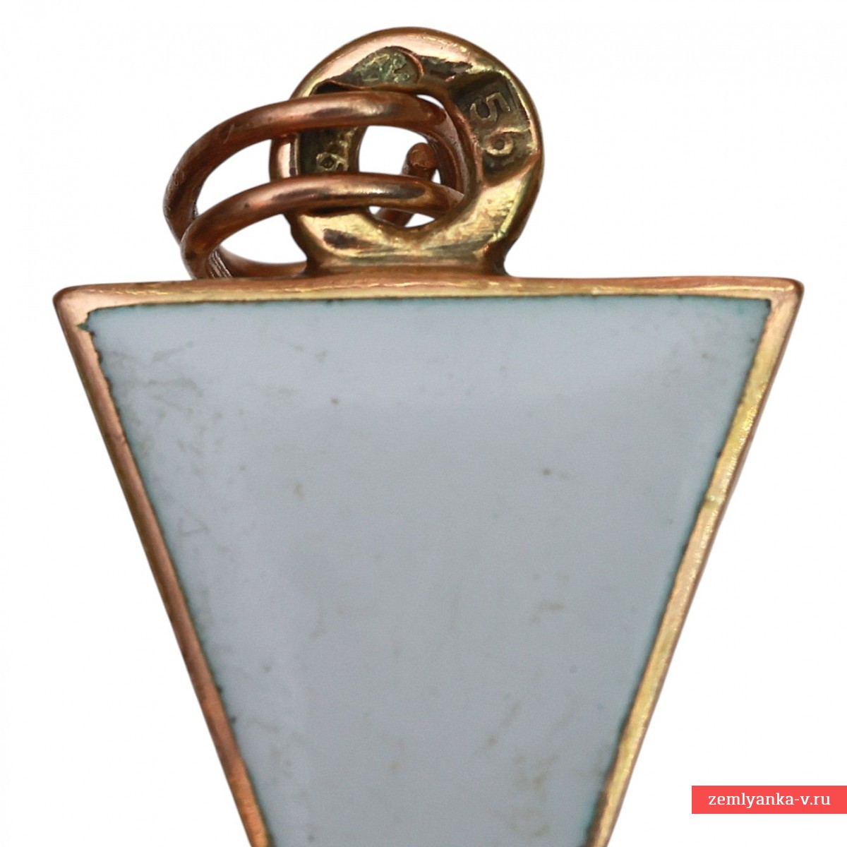 Золото 56 пробы, эмаль, штамповка. Знак представляет собой равноконечный крест с ушком на верхнем луче и расширяющимися концами, на лицевой стороне которого в центре медальона помещен вензель «СГ» ( «Святой Георгий»). В центре реверса круглый медальон с рельефным изображением всадника на коне, протыкающего копьем змея (Святой Георгий). На ушке клеймо 56 пробы золота, дата 1862. Вес 10,63 гр. Размер 38*42 мм. Изготовитель фирма «Keibel» — официальный поставщик Капитула с 1836 по 1905 г. С 1836 по 1862 г. (до 1854 г. совместно с Генрихом Вильгельмом Кеммерером) ею владел Иоганн Вильгельм Кейбель (1788 — 1862). После смерти И.В. Кейбеля поставщиком стал его сын, Юлиус Кейбель (1852 — 1882), а в 1882 — 1905 гг. им был внук И.В. Кейбеля, Альберт Кейбель (1854 — 1910). Сохранность хорошая, нитевидные трещинки на медальоне. Оригинальное промзвено в комплекте. Гарантия подлинности.