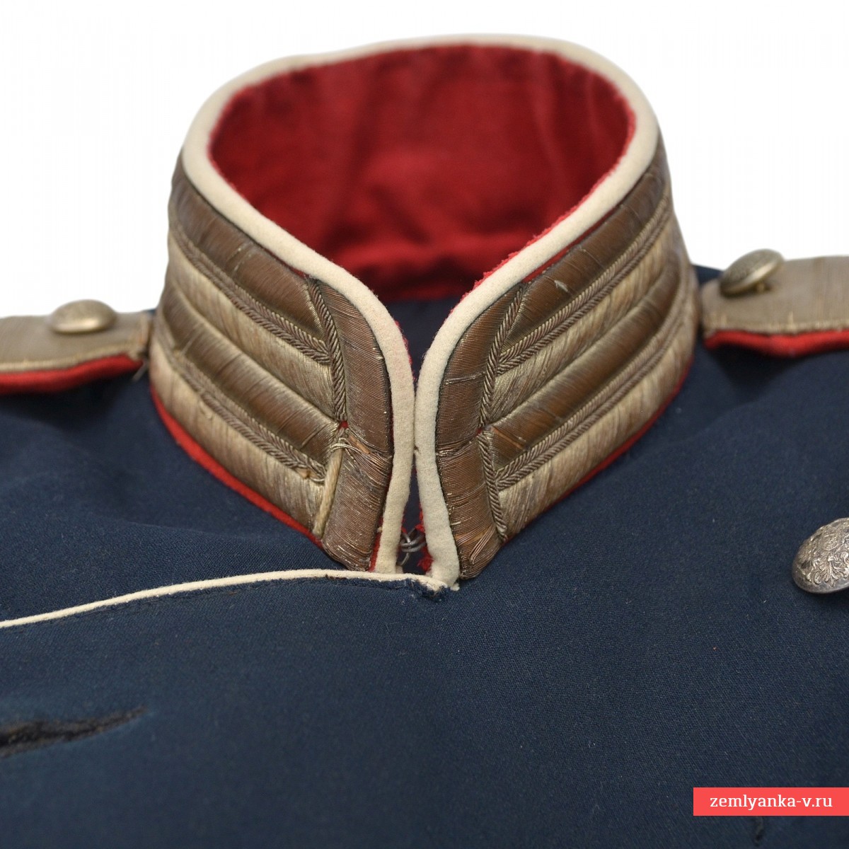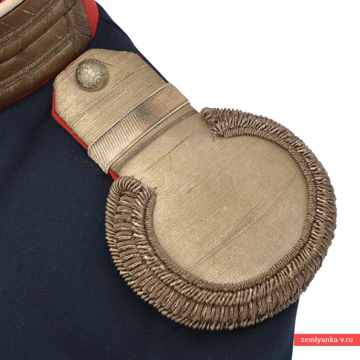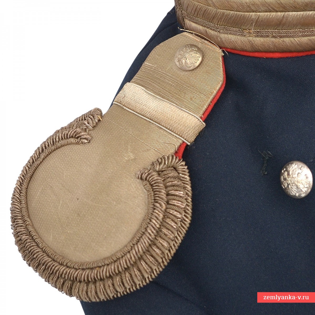 В старой русской армии мундир мог обозначать принадлежность не только к той или иной войсковой части, но и занимаемую должность. Еще с начала XIX в. офицерам, занимавшим должности штабных или личных адъютантов, было присвоено обмундирование особой расцветки: прибор серебряный, воротник красный, все выпушки на обмундировании белые. Числившимся по пехоте полагались эполеты гвардейского пехотного образца, числившимся по кавалерии – металлические чешуйчатые. В нашем случае мундир укомплектован гвардейскими эполетами капитана. Под правым эполетом пристегивался аксельбант. Все это позволяло издалека опознать на поле сражения адъютанта, передававшего приказы высокого начальства. С годами покрой мундира менялся, но расцветка оставалась прежней вплоть до 1917 г. Офицерам для особых поручений полагалось такое же обмундирование, как адъютантам, но без аксельбанта. Количество адъютантов и офицеров для поручений во все времена было невелико (от двух до четырех человек на дивизионный или корпусной штаб), поэтому адъютантские мундиры в наши дни встречаются чрезвычайно редко. Сохранность близка к отличной, поле эполет имеет незначительные расслоения нити. Размер около 48. Гарантия подлинности. Крайне редкий.