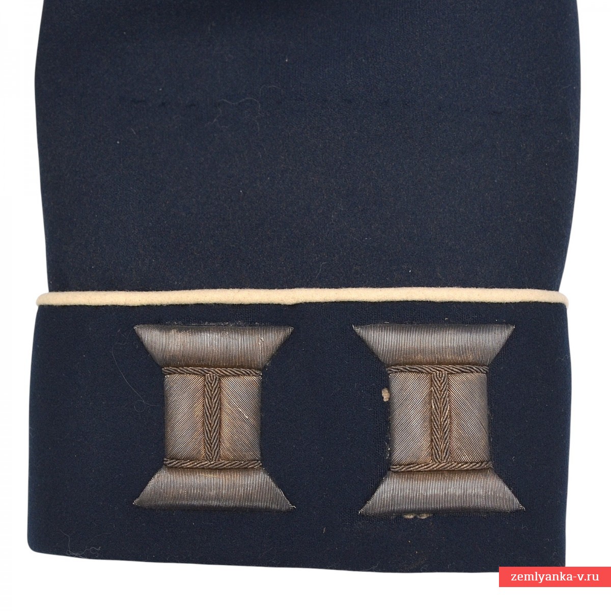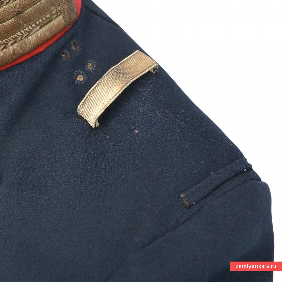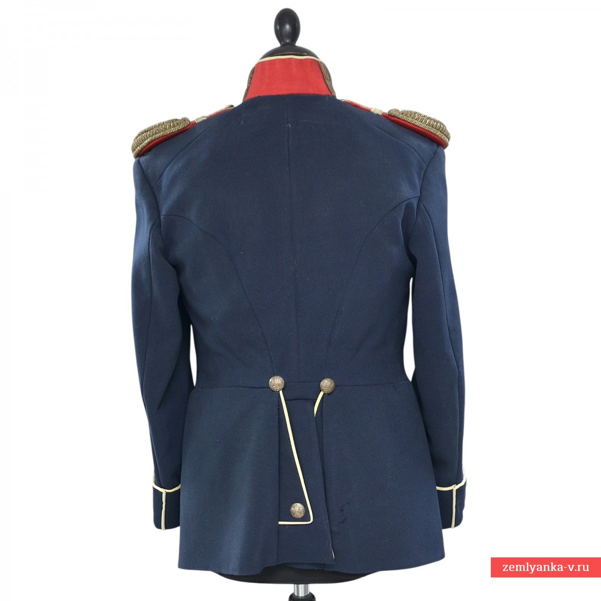 В старой русской армии мундир мог обозначать принадлежность не только к той или иной войсковой части, но и занимаемую должность. Еще с начала XIX в. офицерам, занимавшим должности штабных или личных адъютантов, было присвоено обмундирование особой расцветки: прибор серебряный, воротник красный, все выпушки на обмундировании белые. Числившимся по пехоте полагались эполеты гвардейского пехотного образца, числившимся по кавалерии – металлические чешуйчатые. В нашем случае мундир укомплектован гвардейскими эполетами капитана. Под правым эполетом пристегивался аксельбант. Все это позволяло издалека опознать на поле сражения адъютанта, передававшего приказы высокого начальства. С годами покрой мундира менялся, но расцветка оставалась прежней вплоть до 1917 г. Офицерам для особых поручений полагалось такое же обмундирование, как адъютантам, но без аксельбанта. Количество адъютантов и офицеров для поручений во все времена было невелико (от двух до четырех человек на дивизионный или корпусной штаб), поэтому адъютантские мундиры в наши дни встречаются чрезвычайно редко. Сохранность близка к отличной, поле эполет имеет незначительные расслоения нити. Размер около 48. Гарантия подлинности. Крайне редкий.