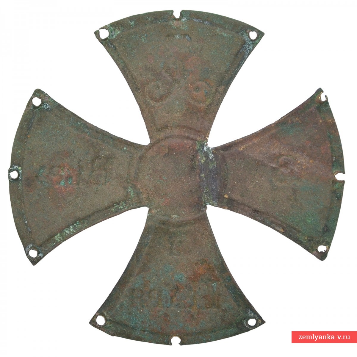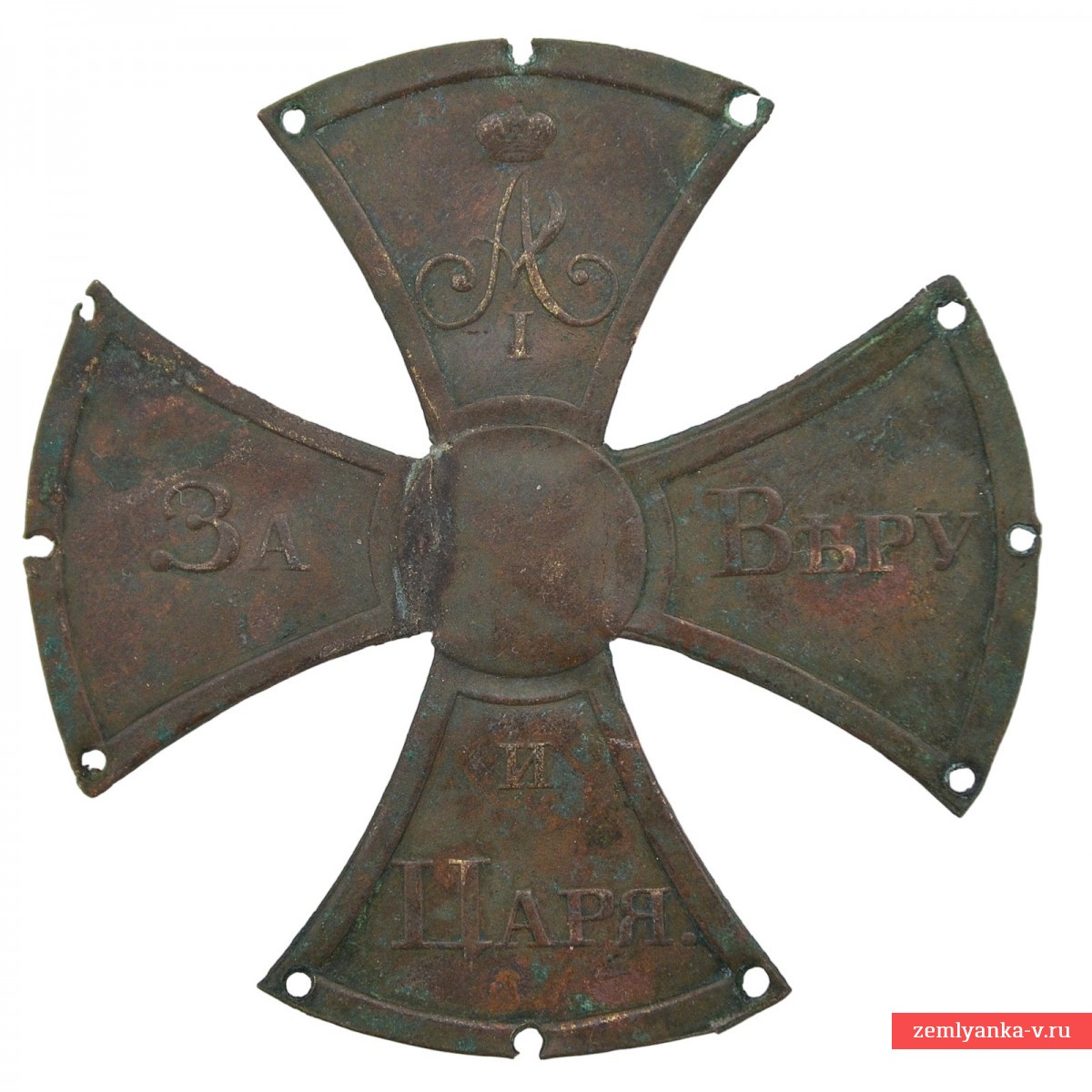 Как в общеисторической, так и в специальной нумизматической литературе в течение многих десятилетий из одного издания в другое кочует утверждение, будто в 1812 г. существовал унифицированный ополченский знак и этим знаком являлся чеканившийся на Санкт-Петербургском Монетном дворе латунный крест, на уширенных концах которого, имеющих по краям отверстия для пришивания к головному убору, помещены были: вверху – вензель Александра 1 под короной, а по бокам и внизу надпись – «За – Веру – и – Царя».