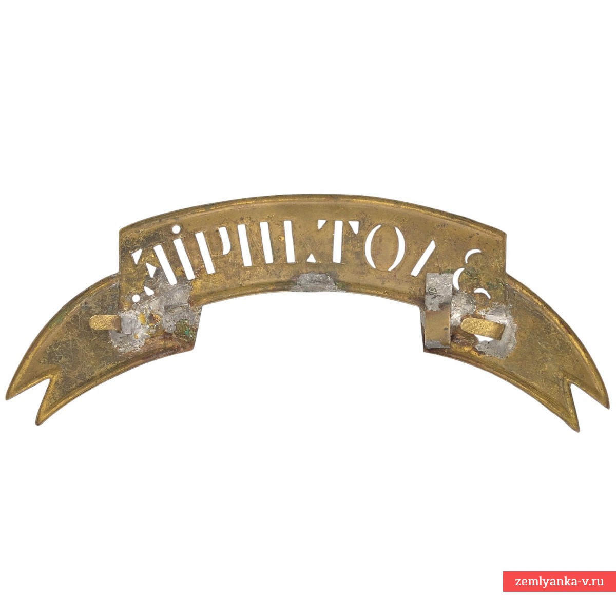 Оригинальная лента в складском коллекционном состоянии. В подобной сохранности исключительная редкость. Латунь, штамповка. Литеры прорезные. Лента увеличенного размера, предположительно, для ношения на кивере. Гарантия подлинности.