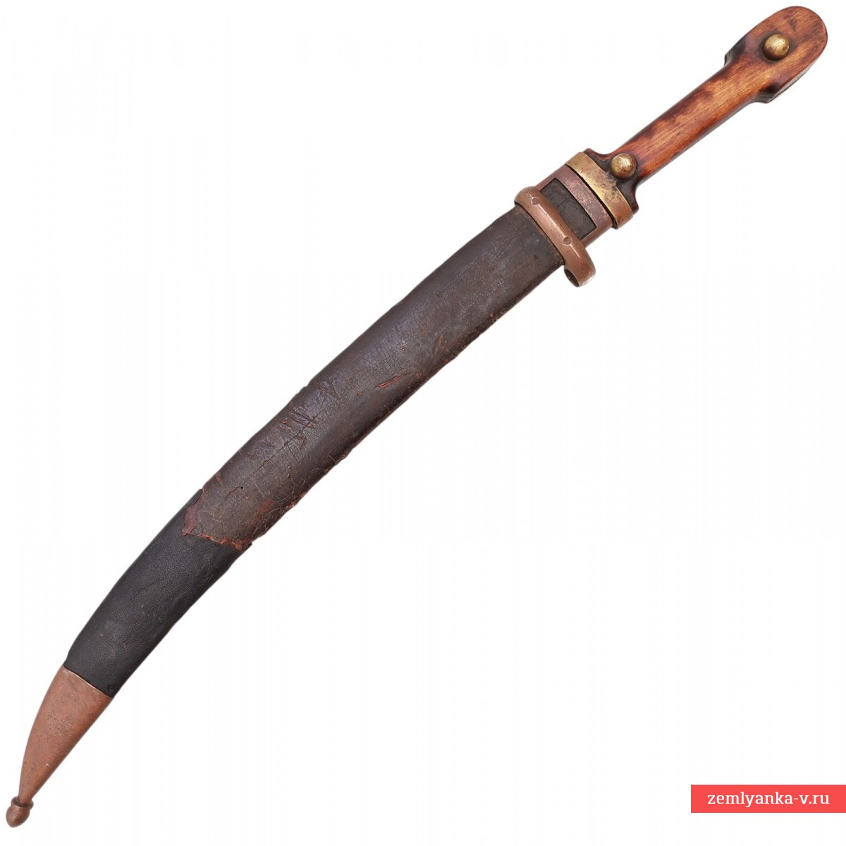 Клинок незначительно изогнутый, стальной, двулезвийный, с двумя узкими долами с обеих сторон. Рукоять кавказской формы, с двумя деревянными щёчками, которые крепятся к черенку клинка при помощи двух заклёпок с полусферическими латунными накладками. У основания имеется латунная втулка. Ножны деревянные, окрашенные в чёрный цвет, с латунным прибором, состоящим из фигурного устья с округлой скобой и наконечника с шариком.