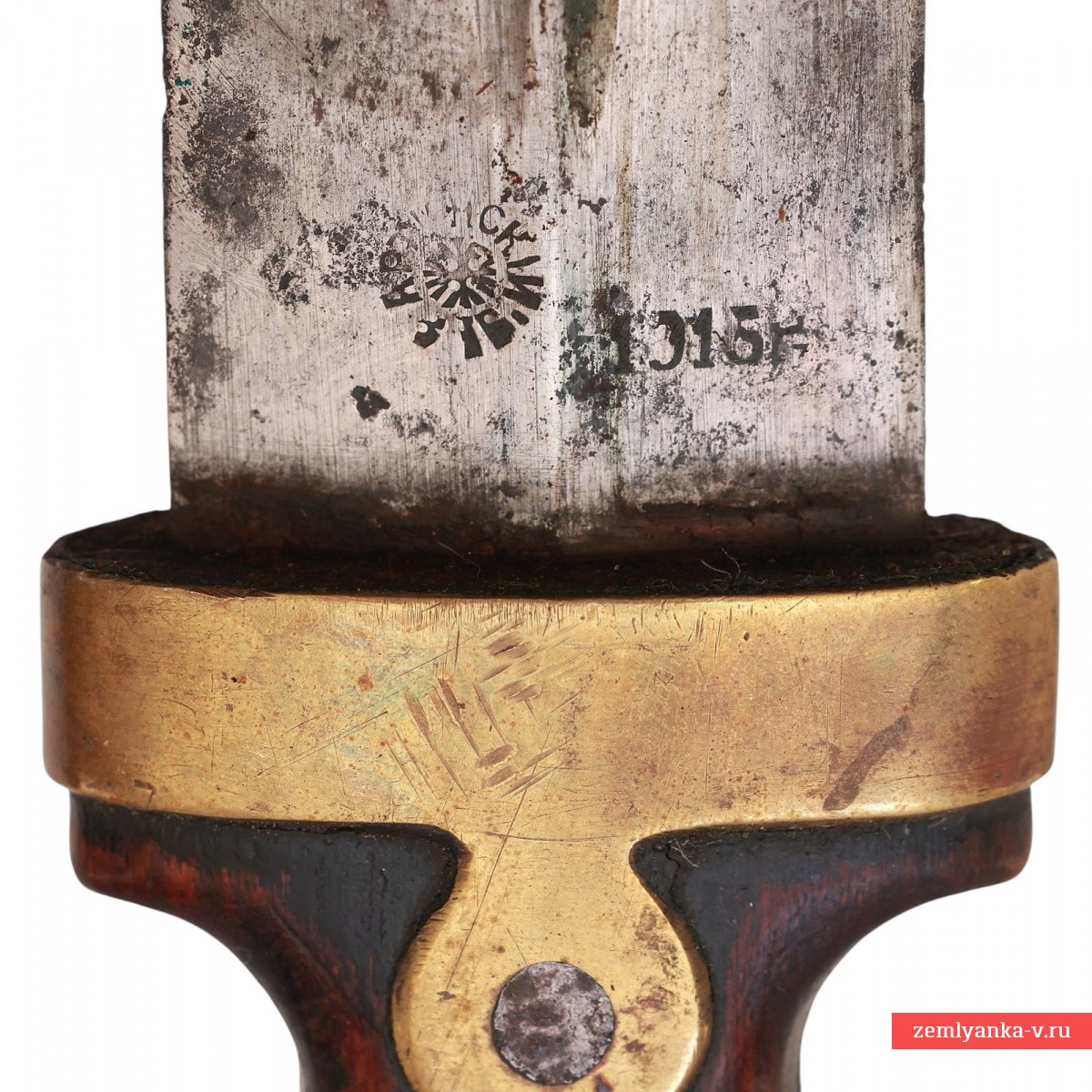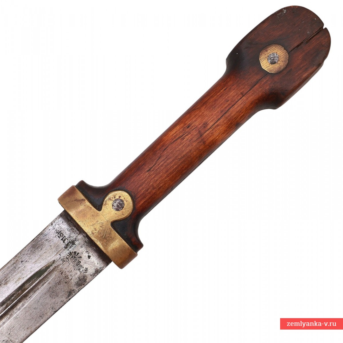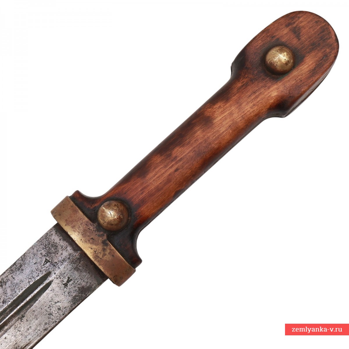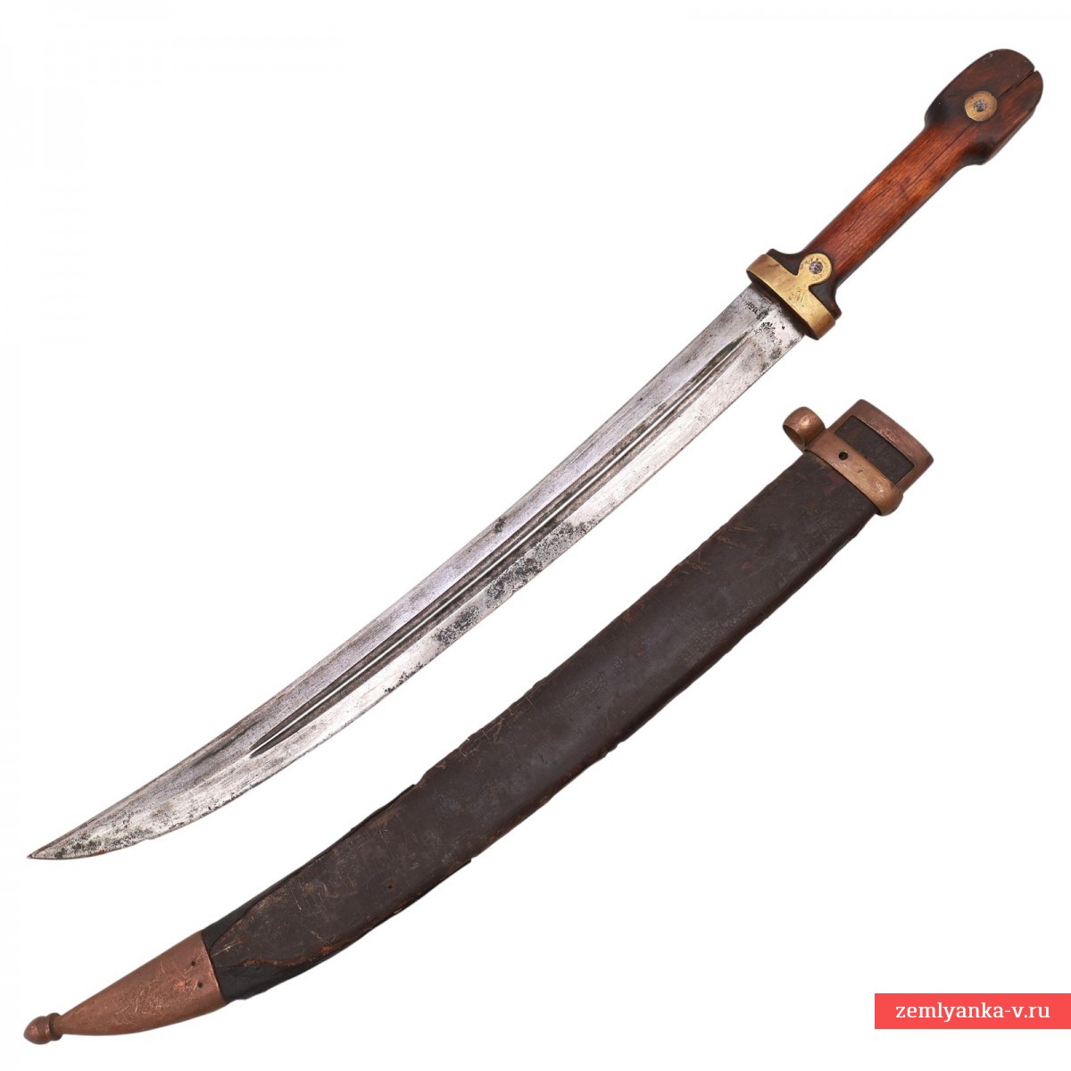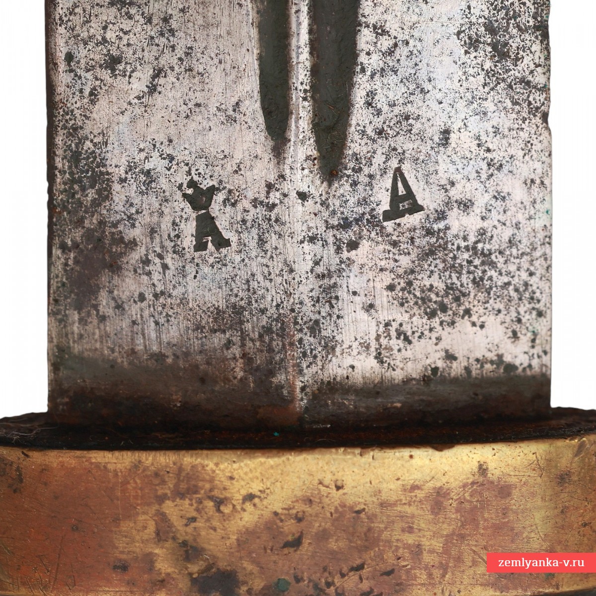 предмет находится в неплохом коллекционном состоянии. Следы коррозии на клинке. Трещины на рукояти. Временная патина на латунных деталях рукояти и приборе ножен. Кожа на ножнах частично заменена.