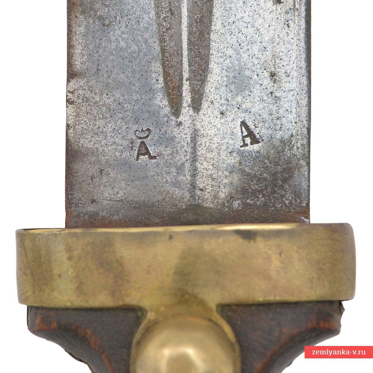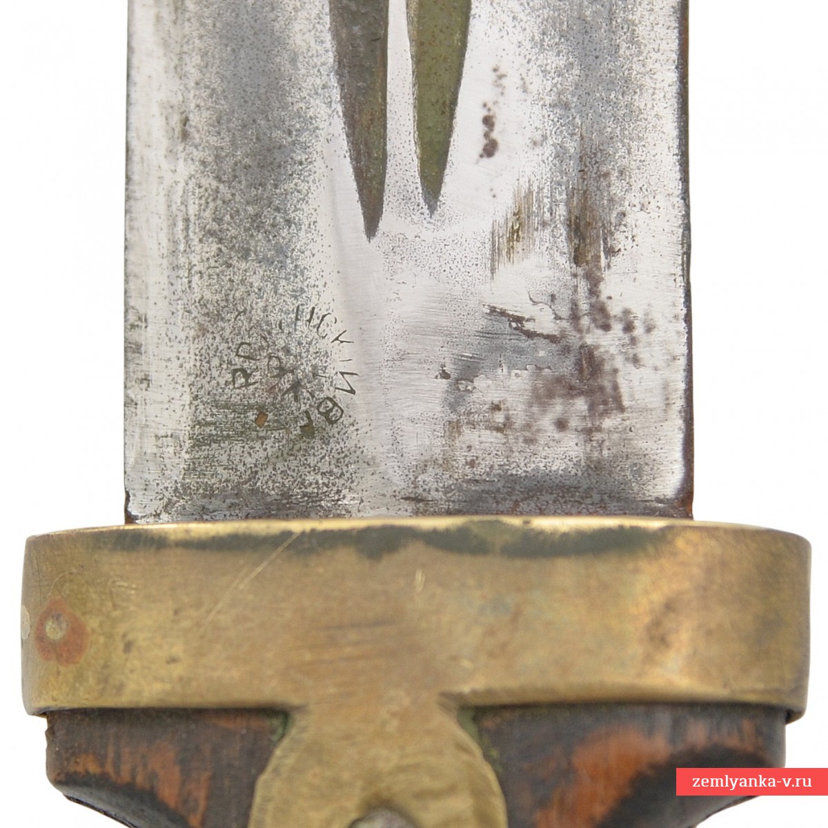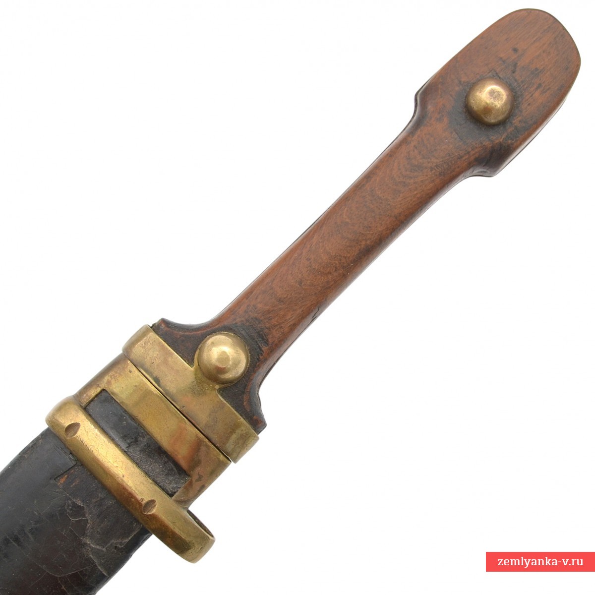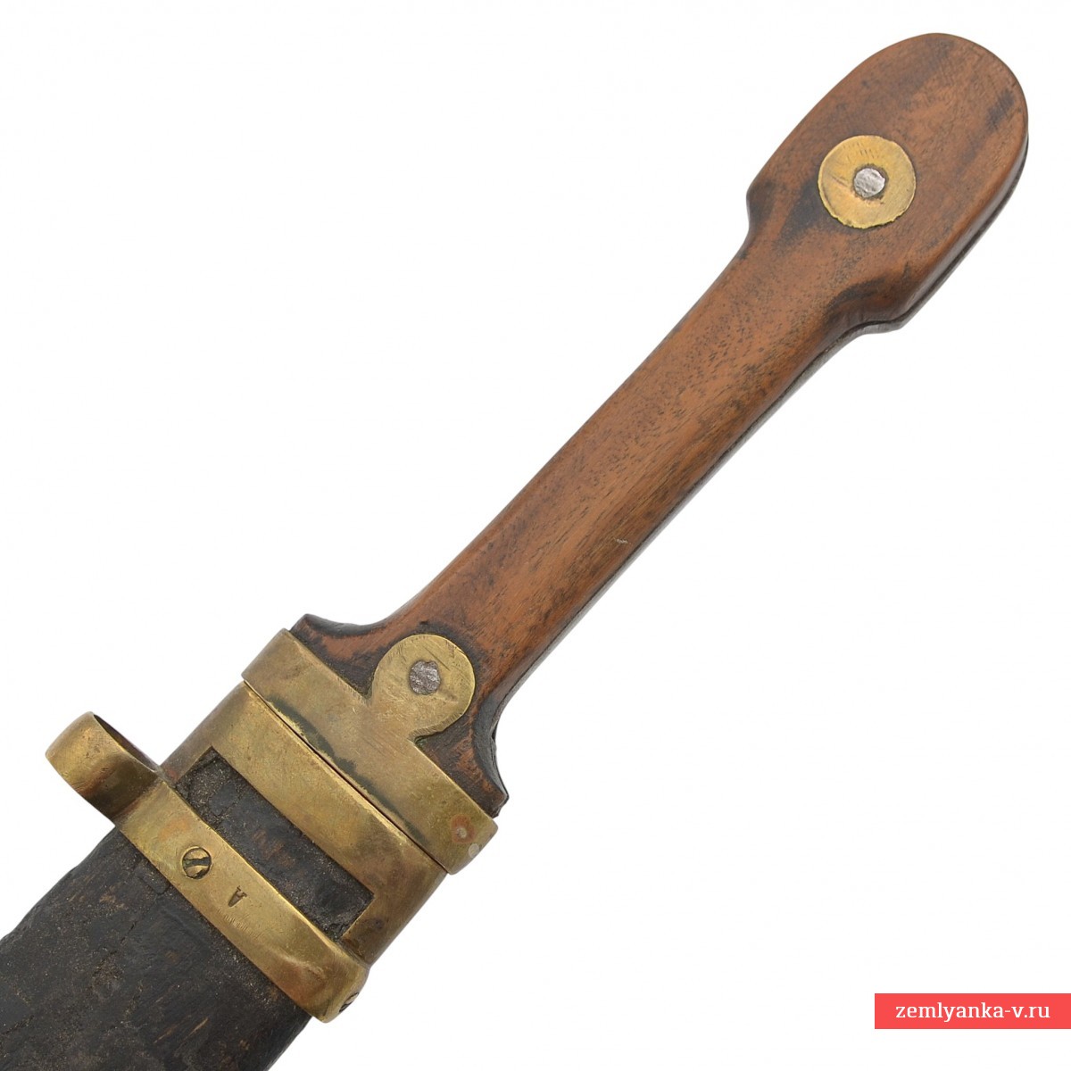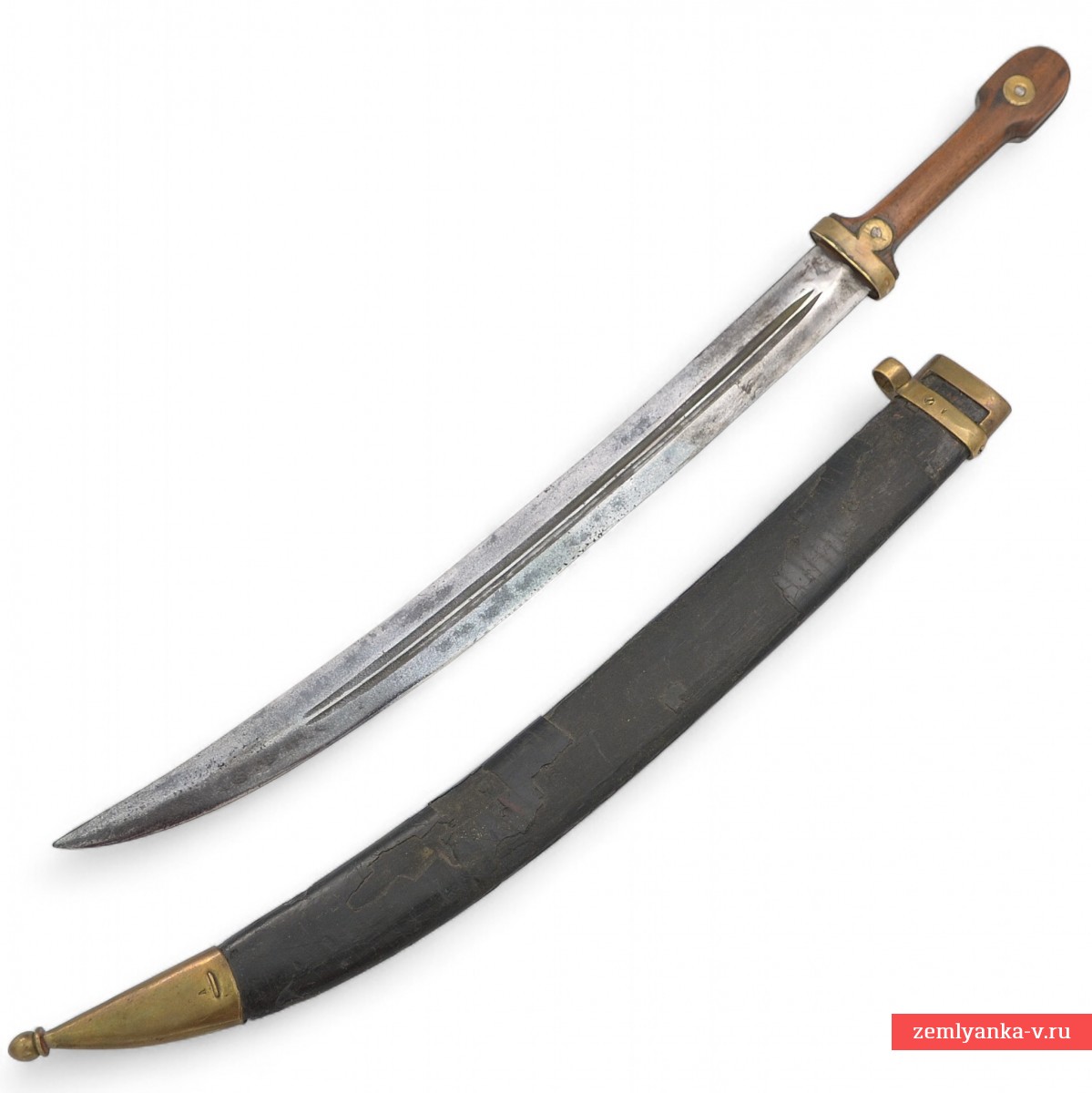 Клинок незначительно изогнутый, стальной, двулезвийный, с двумя узкими долами с обеих сторон. Рукоять кавказской формы, с двумя деревянными щёчками, которые крепятся к черенку клинка при помощи двух заклёпок с полусферическими латунными накладками. У основания имеется латунная втулка. Ножны деревянные, обтянутые кожей, окрашенные в чёрный цвет, с латунным прибором, состоящим из фигурного устья с округлой скобой и наконечника с шариком.