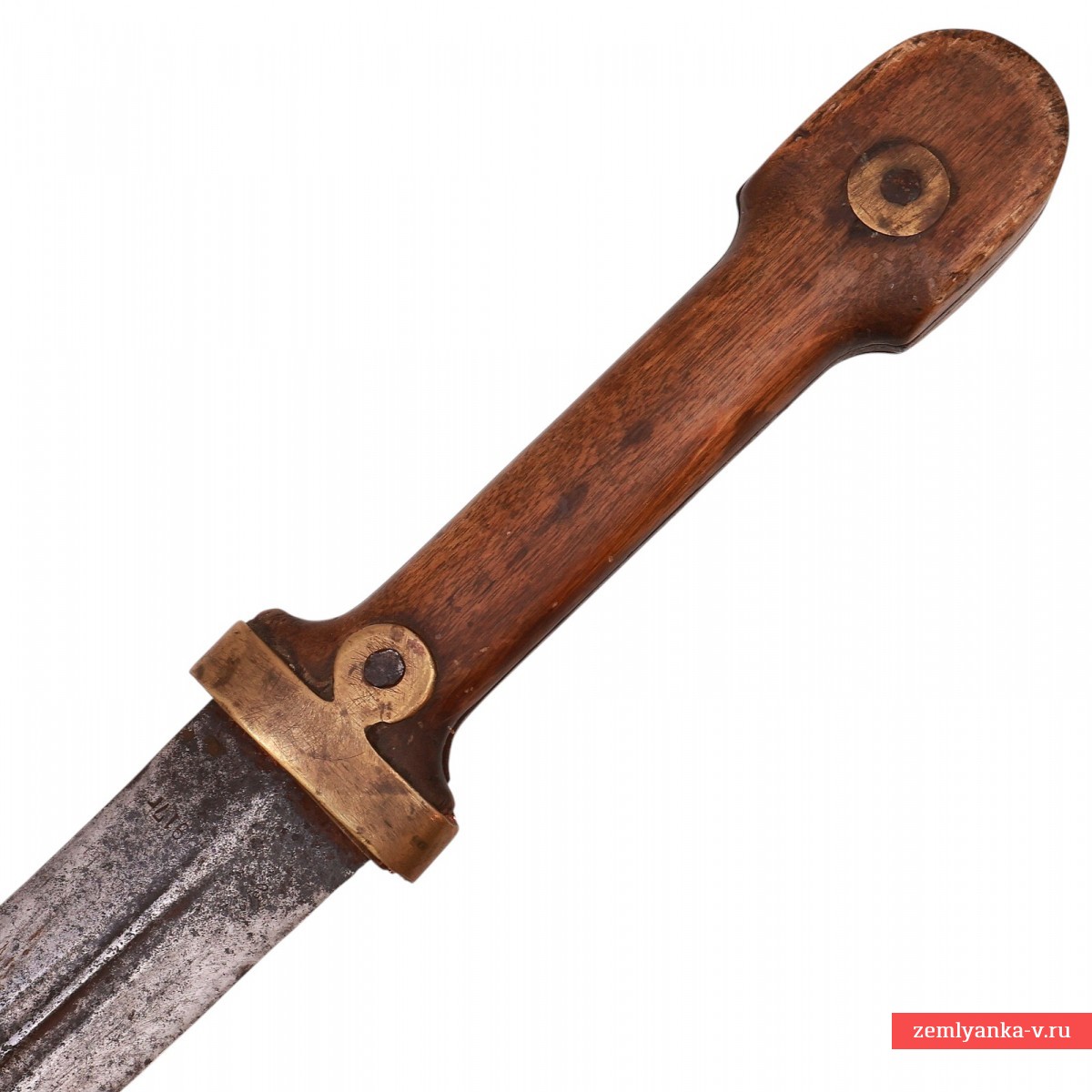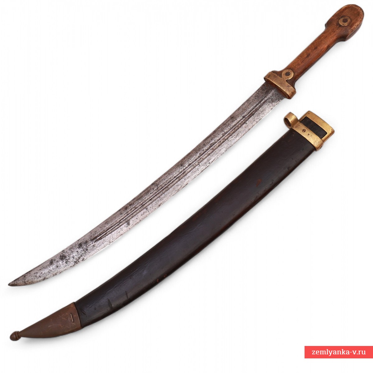 Клинок незначительно изогнутый, стальной, двулезвийный, с двумя узкими долами с обеих сторон. Рукоять кавказской формы, с двумя деревянными щёчками, которые крепятся к черенку клинка при помощи двух заклёпок с полусферическими латунными накладками. У основания имеется латунная втулка. Ножны деревянные, окрашенные в чёрный цвет, с латунным прибором, состоящим из фигурного устья с округлой скобой и наконечника с шариком.