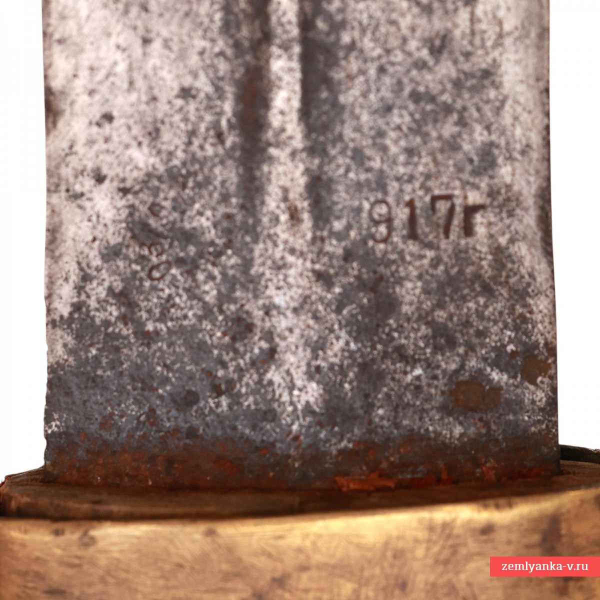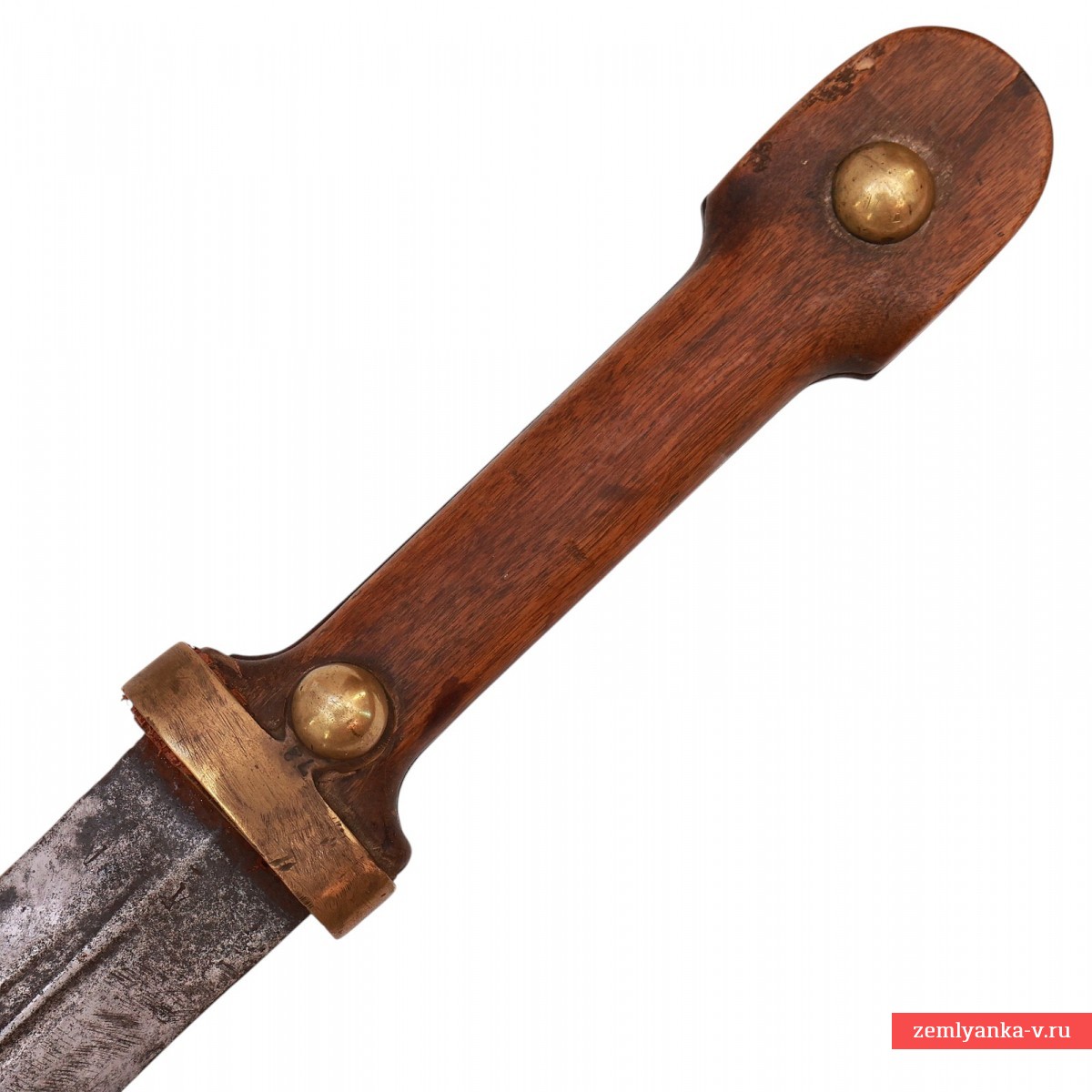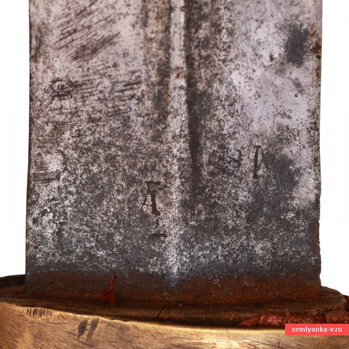 предмет находится в неплохом коллекционном состоянии. Следы коррозии и заточки на клинке. Временная патина на латунных деталях рукояти и приборе ножен. Царапины и незначительные утраты на коже ножен.
