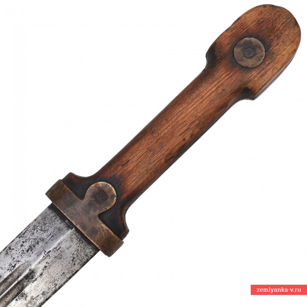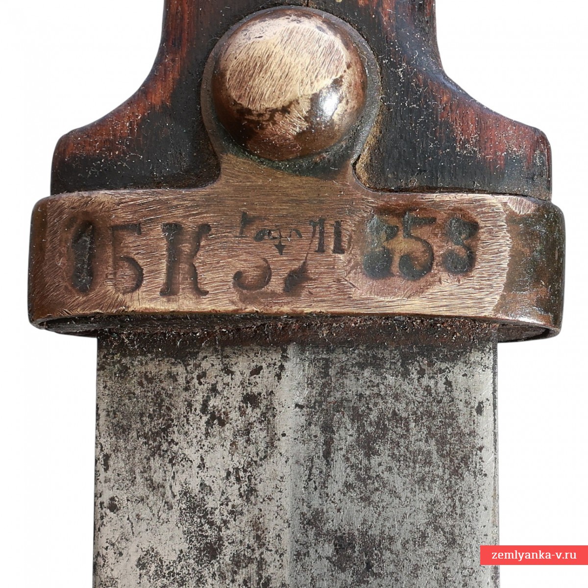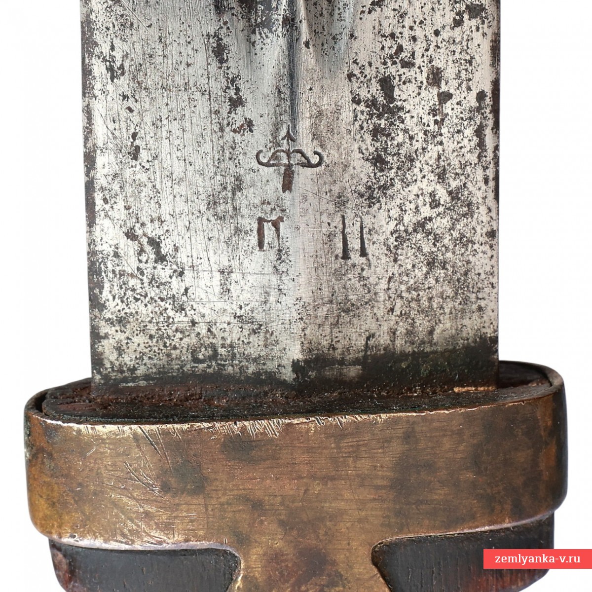 Клинок незначительно изогнутый, стальной, двулезвийный, с двумя узкими долами с обеих сторон. На пяте клинка пробито изображение лука со стрелок (клеймо Ижевского оружейного завода), «П» (инспекторское клеймо «Пробованъ»). Рукоять кавказской формы, с двумя деревянными щёчками, которые крепятся к черенку клинка при помощи двух заклёпок с полусферическими латунными накладками. У основания имеется латунная втулка, на которой плохо читаемые полковые клейма «1БК… 858» (?). Ножны деревянные, обтянутые кожей, с латунным прибором, состоящим из фигурного устья с округлой скобой и наконечника с шариком. На приборе ножен пробито клеймо Ижевского завода, выполненное в виде лука со стрелой.