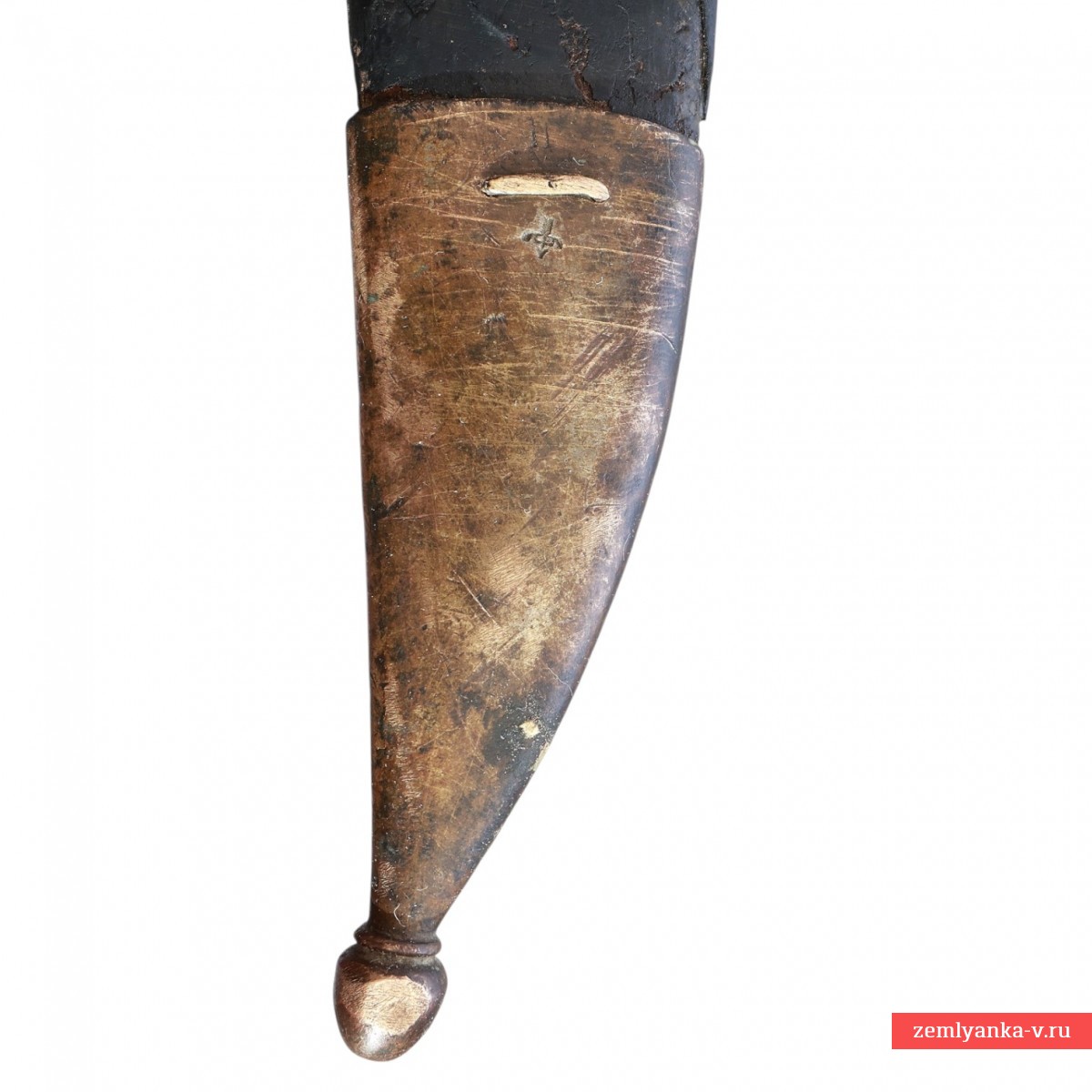 Предмет находится в удовлетворительном коллекционном состоянии. Следы коррозии, чистки и заточки клинка. Множественные утраты и царапины на ножнах. Патина и загрязнения на латунных частях.